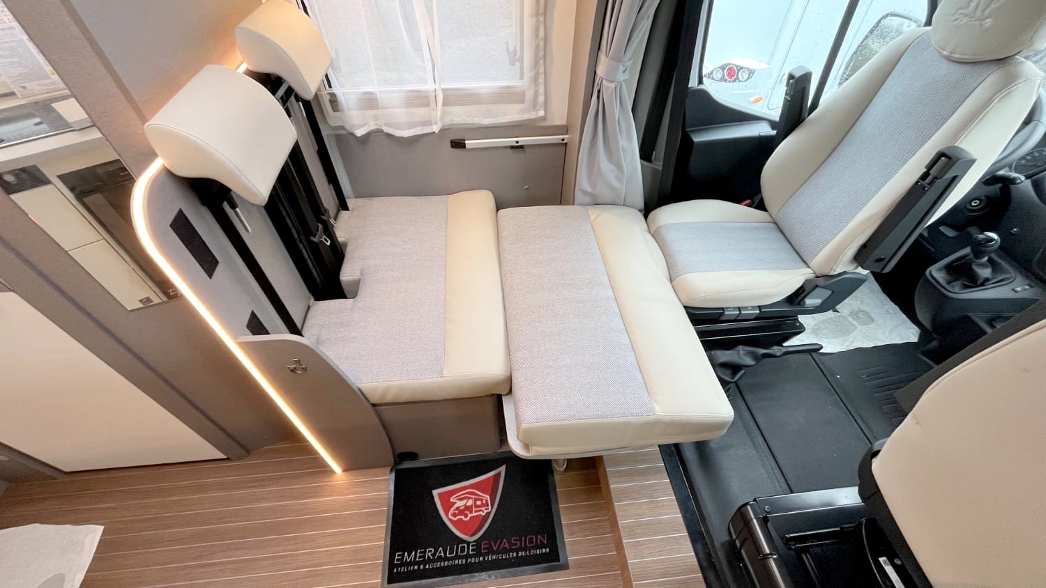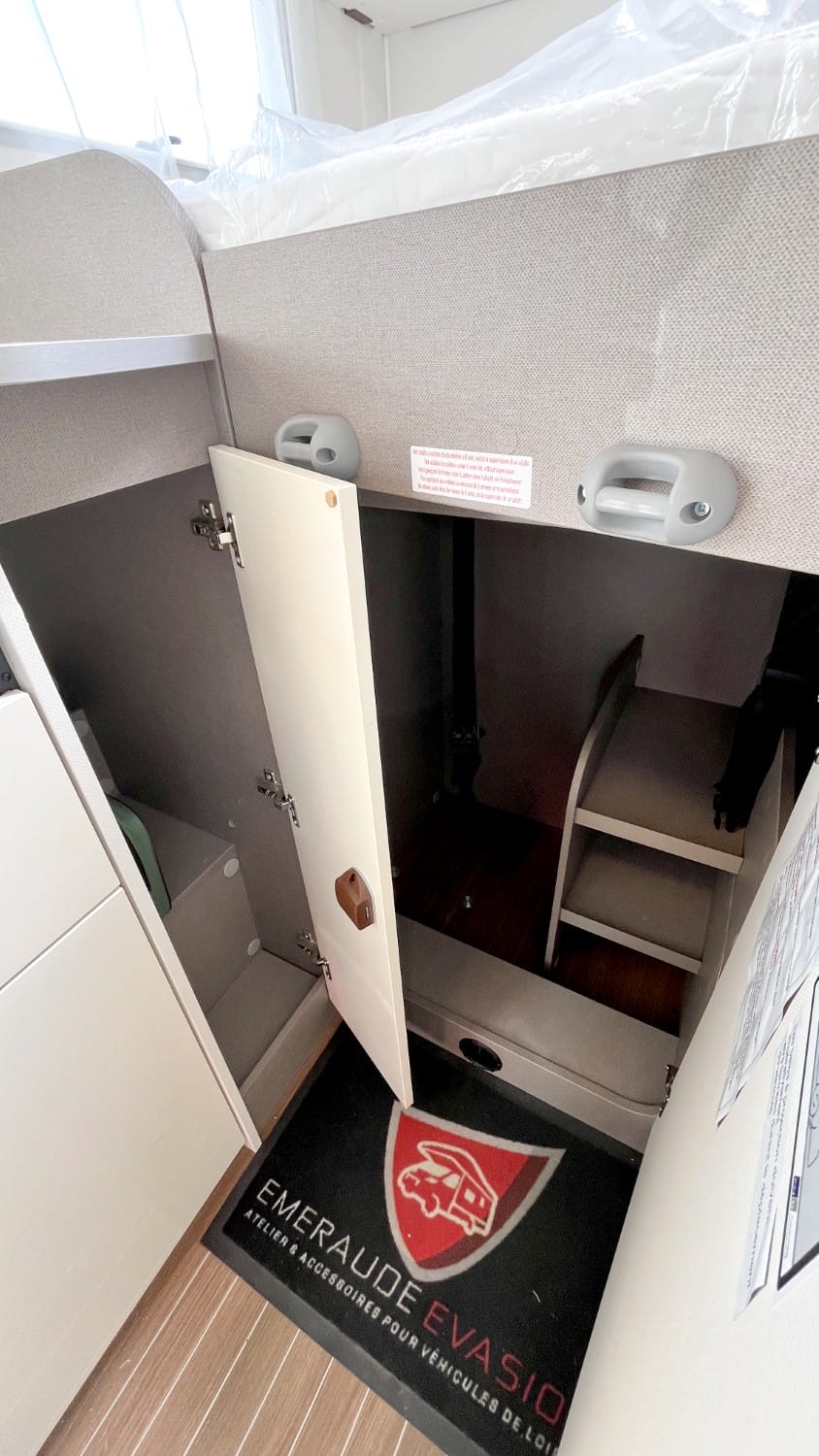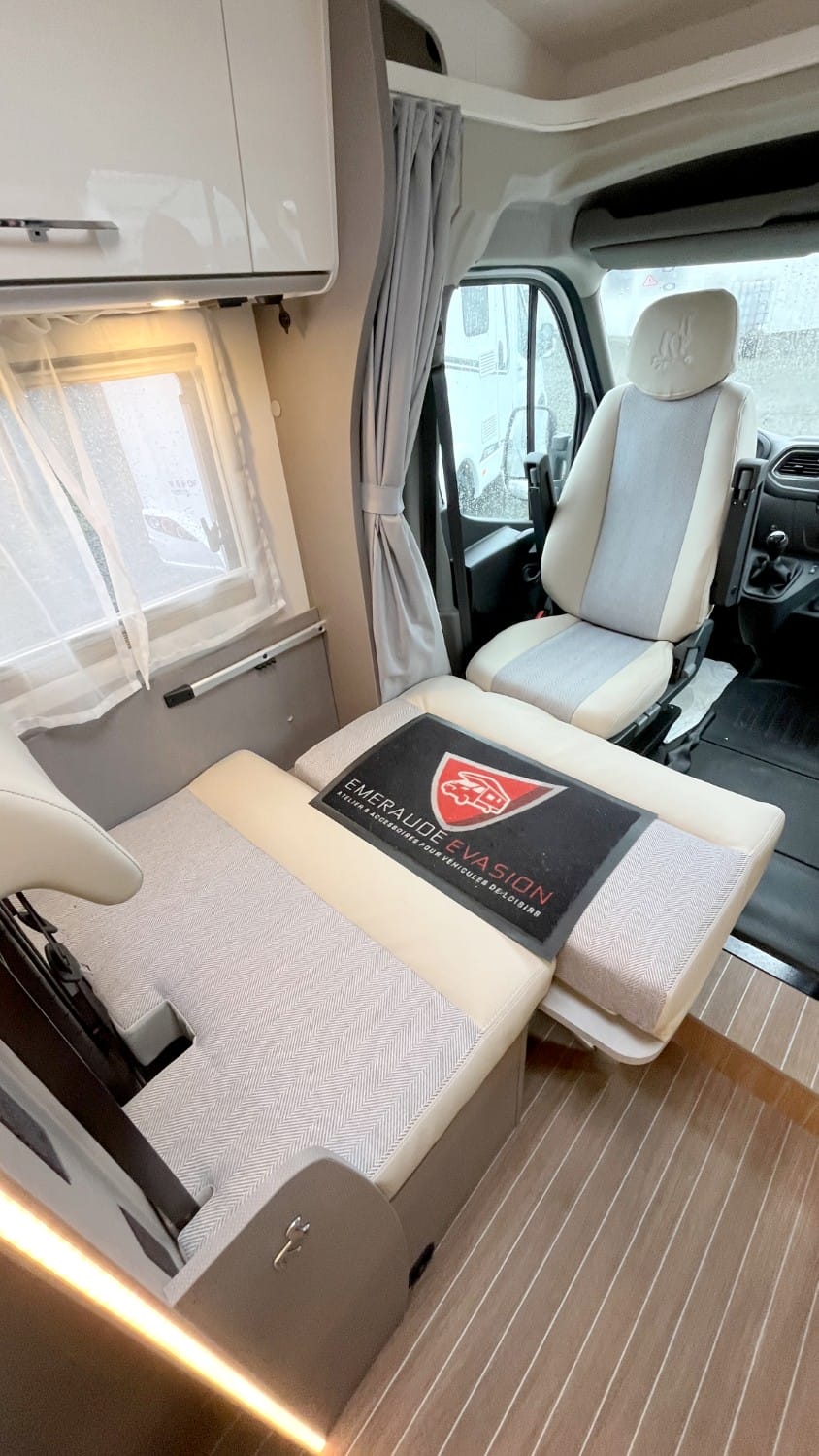 Pack Confort :Miroir et porte-manteaux Caillebotis en bois dans la douche Sièges cabine avec housses coordonnées à la cellule Panneau solaire 130W Prise de courant dans la cuisine et soute Pré-équipement TV Store Banne Lanterneau de salle d'eau Rideau d'occultation de cabine Moustiquaire de porte de cellule Double prise USB-A et C dans salon | Type X :Graphisme intérieur et extérieur type X Sellerie spécifique Simili / Tissu Ambiance intérieure Emilia (beige) Portes de placard de pavillon "Magnolia" brillant et à Fermeture Soft Close Sièges avant Captain Chair pivotants et nombreux réglages d'assise Baies latérales affleurantes double vitrage teintées et ouvrantes |