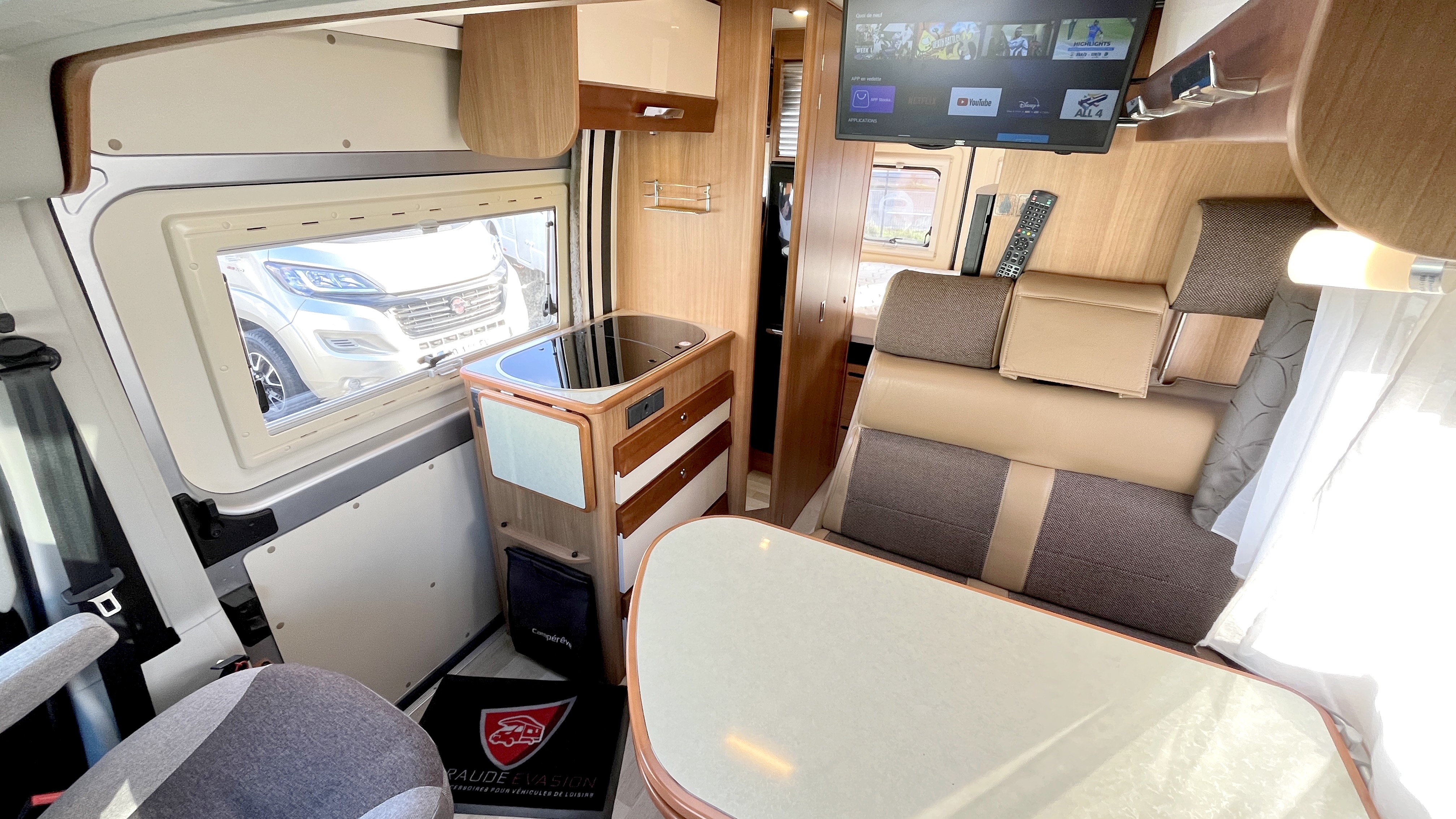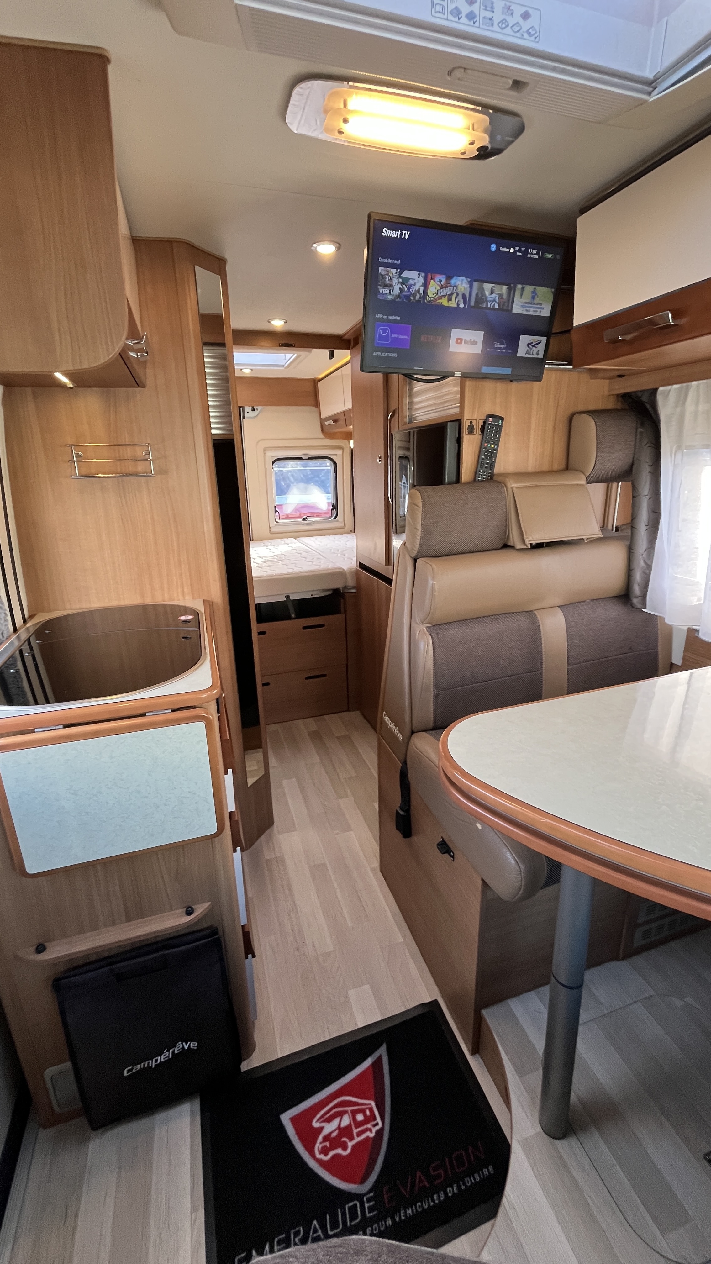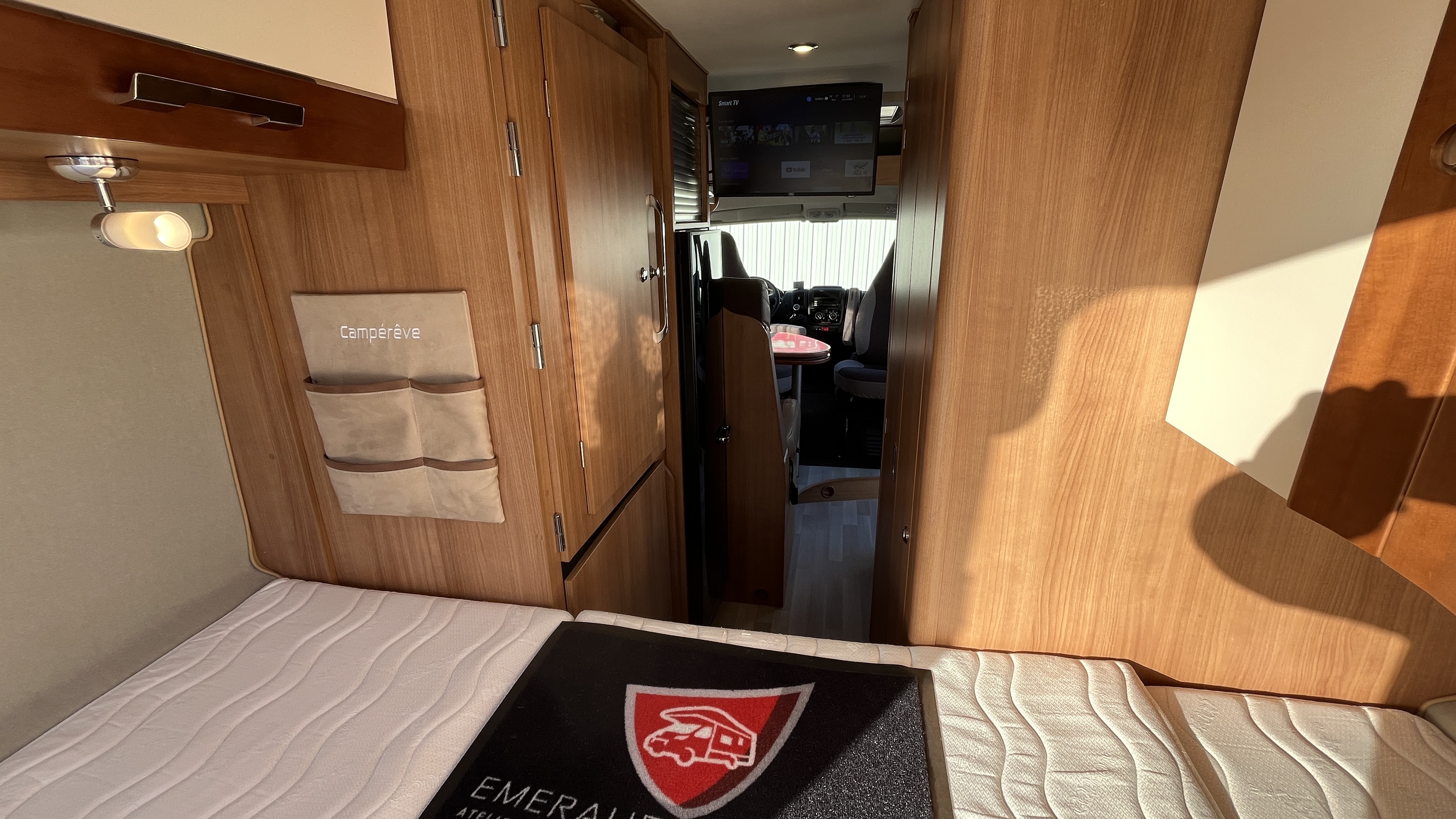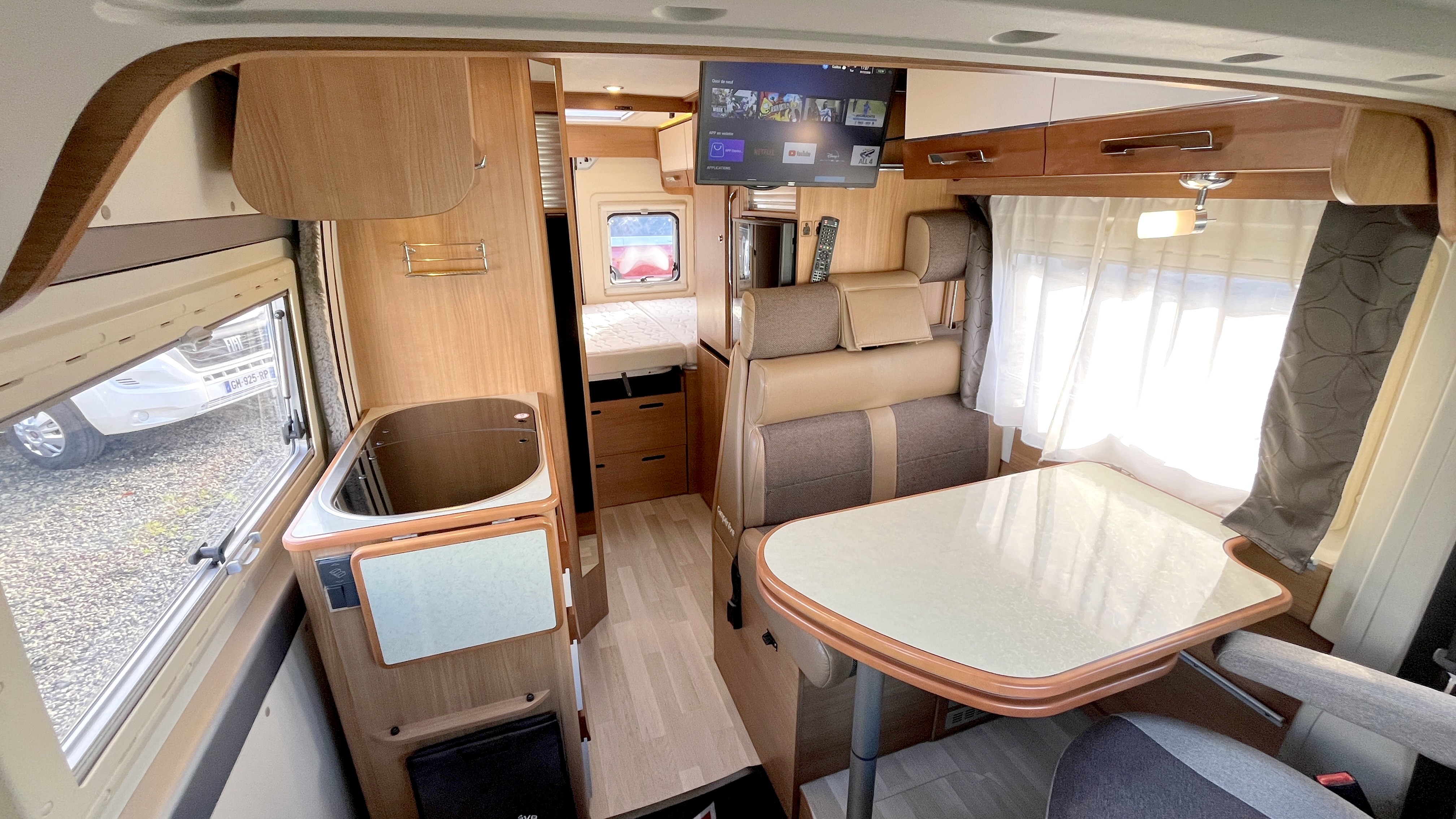 IntérieurSellerie mixte simili/tissu brunFrigoAutomatiqueFrigoGrandÉclairage ledsRéseau telePrise USBRideaux plissesLit principalLit TransversalDimensions192x132 cmLit secondaireLit dinetteDimensions185x100 cmCaméra de reculeRégulateur de vitesseCombi chauffe-eau / chauffage gaz