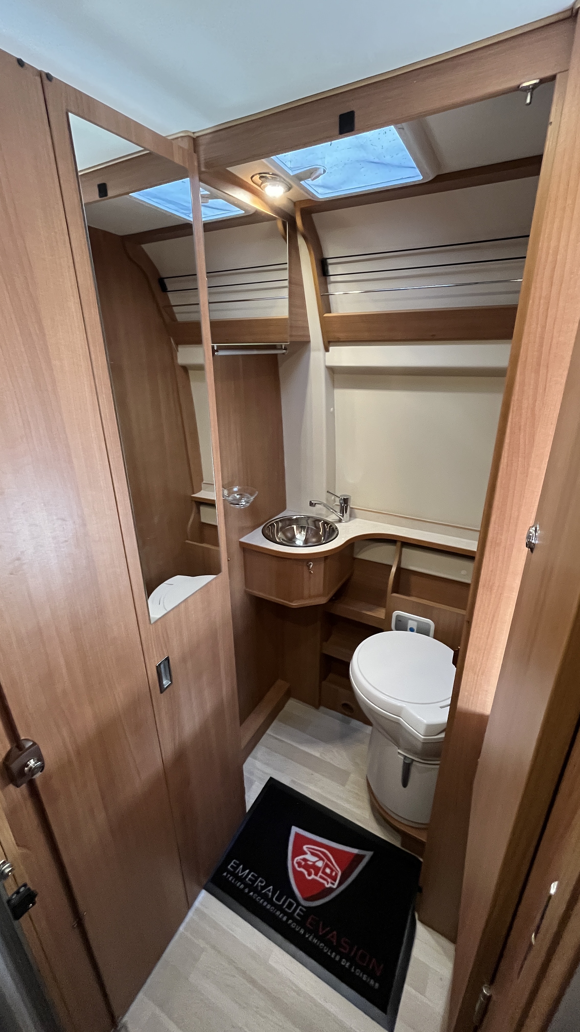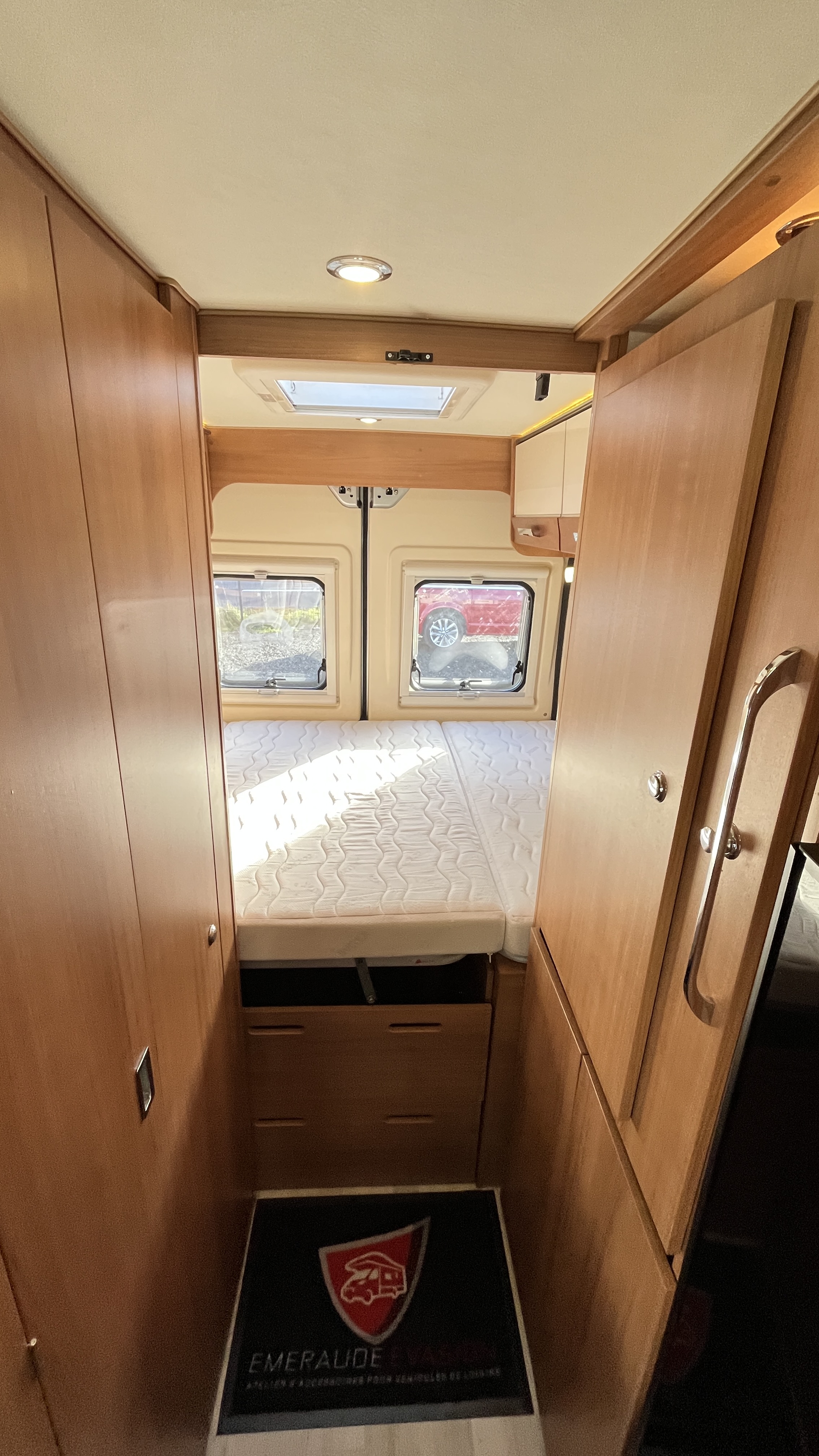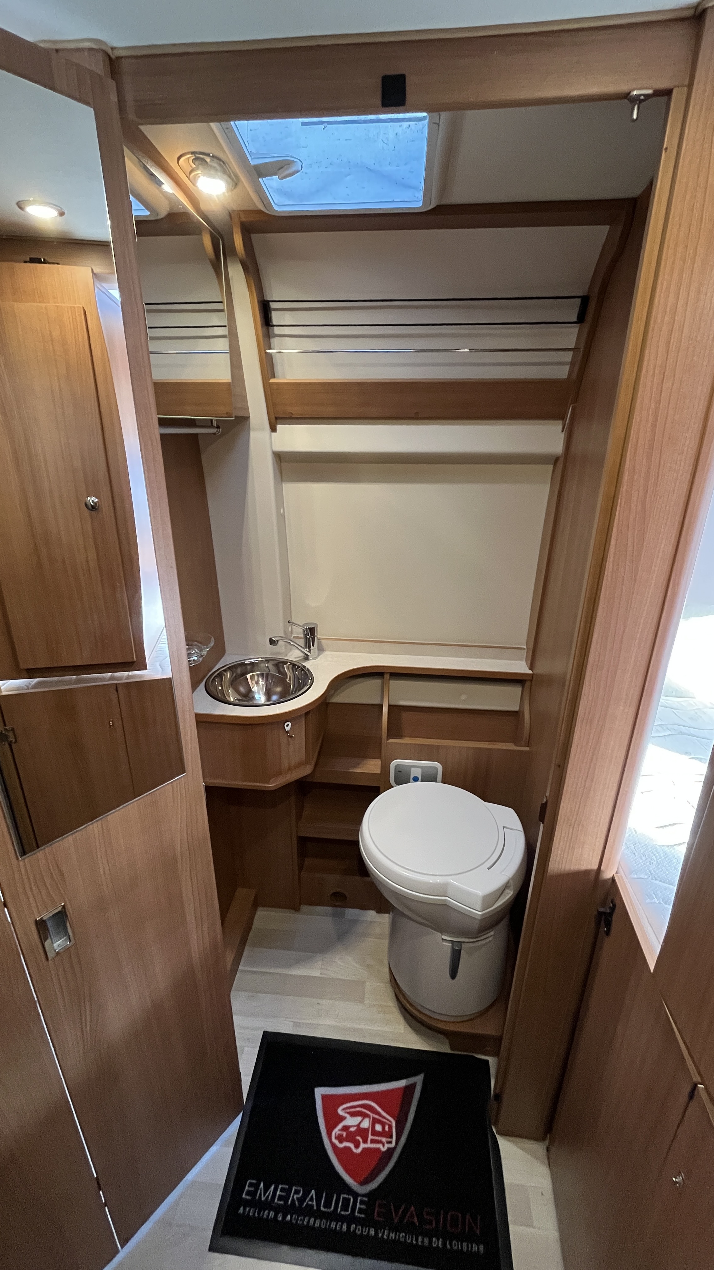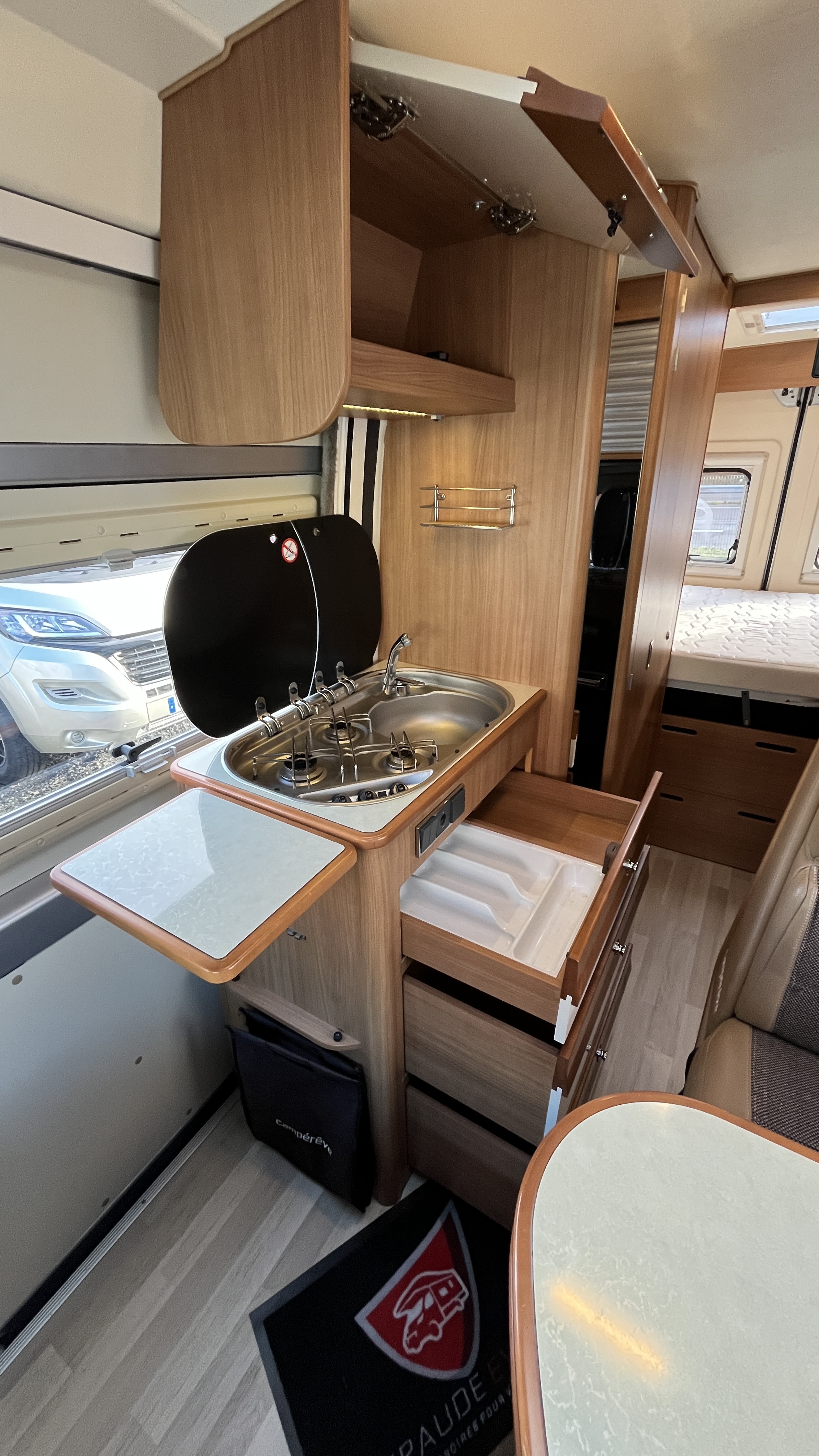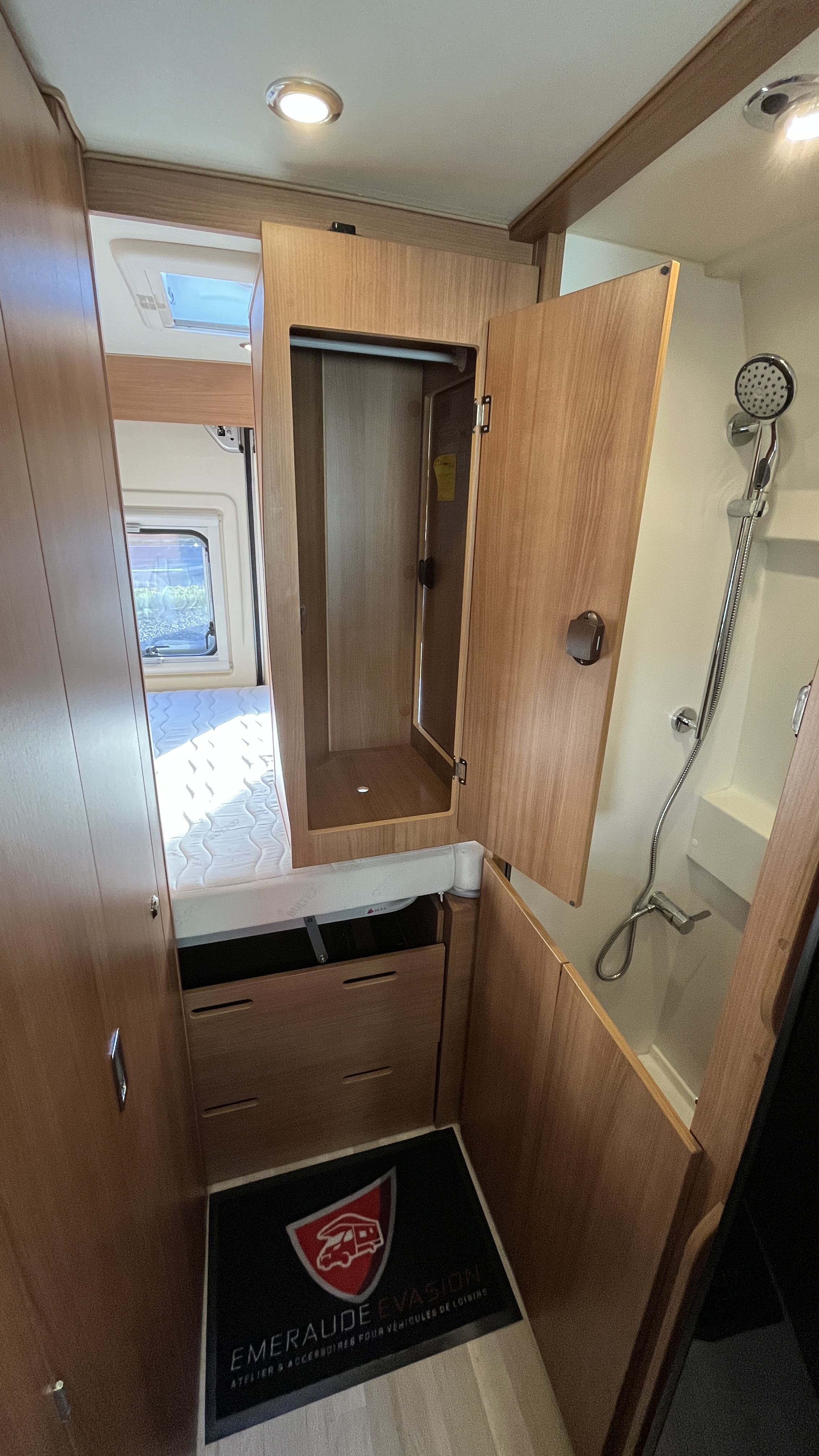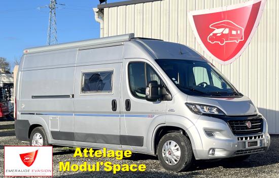 Il est un condensé de tout ce qui se fait de mieux en matière de fourgon aménagé. Son système de penderie pivotante breveté reste un atout de taille : appelé Modul’Space, il se compose d’un vaste cabinet de toilette avec douche séparée. Implanté au centre de l’habitacle, d’un côté la pièce WC/lavabo, dont la porte se déplie en 2 parties pour former une séparation avec le séjour, de l’autre, une penderie pivotante qui bascule vers la chambre, pour finaliser la transformation de l’espace sanitaire et libérer totalement le volume de la douche indépendante. Sa cuisine équipée d’un grand frigo, d’un réchaud 3 feux et d’un évier inox, débouche sur un salon confortable.
