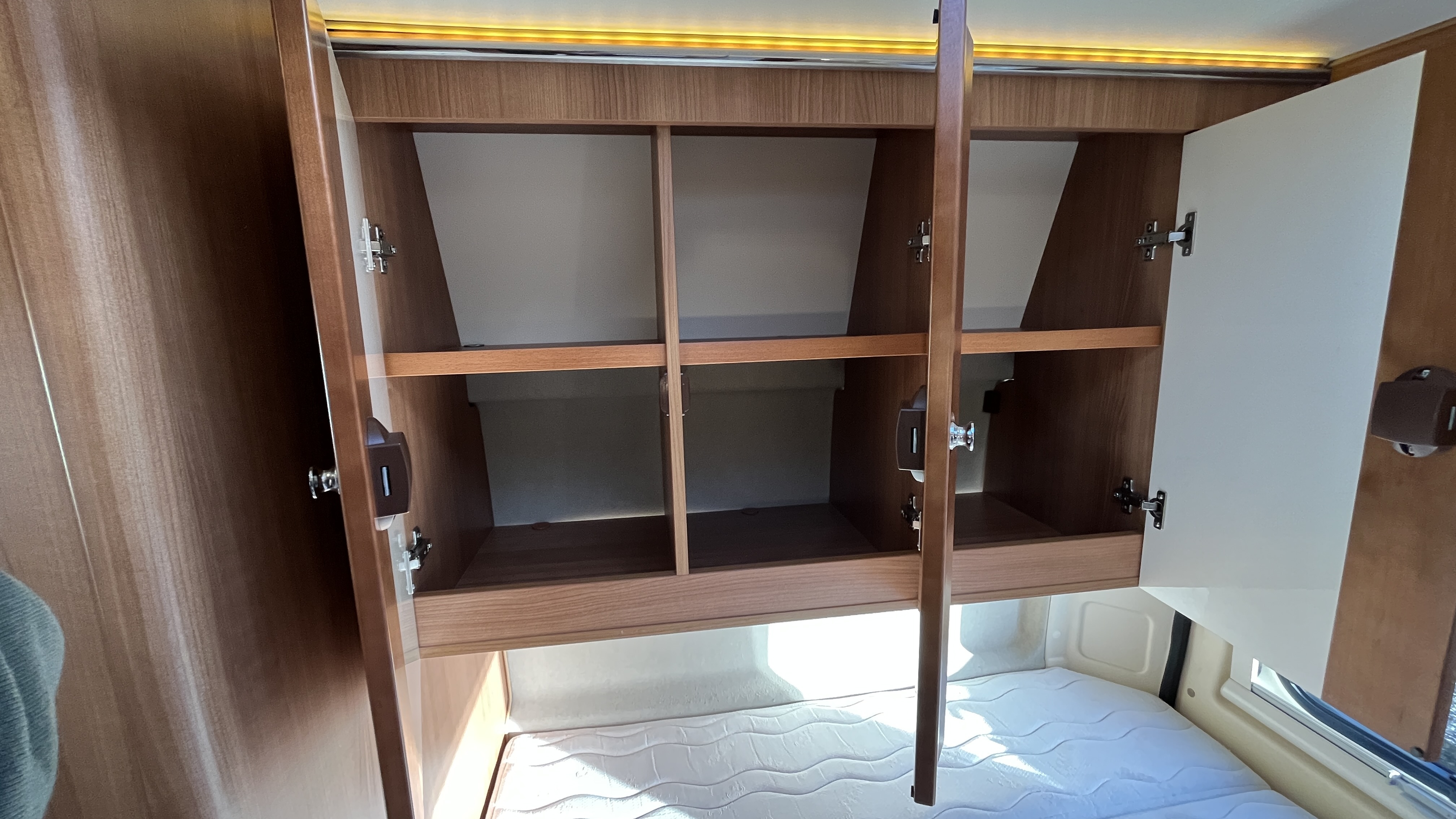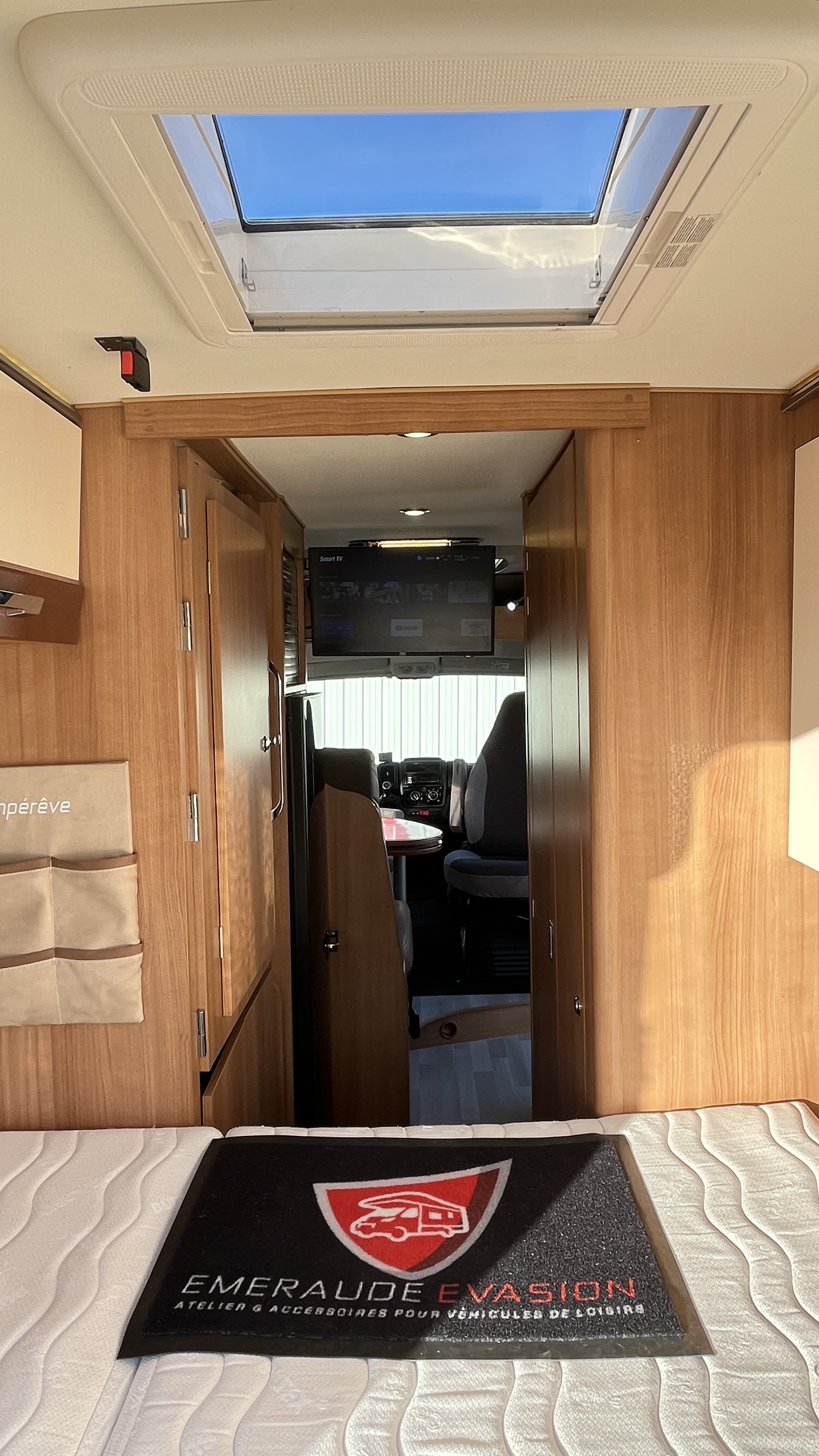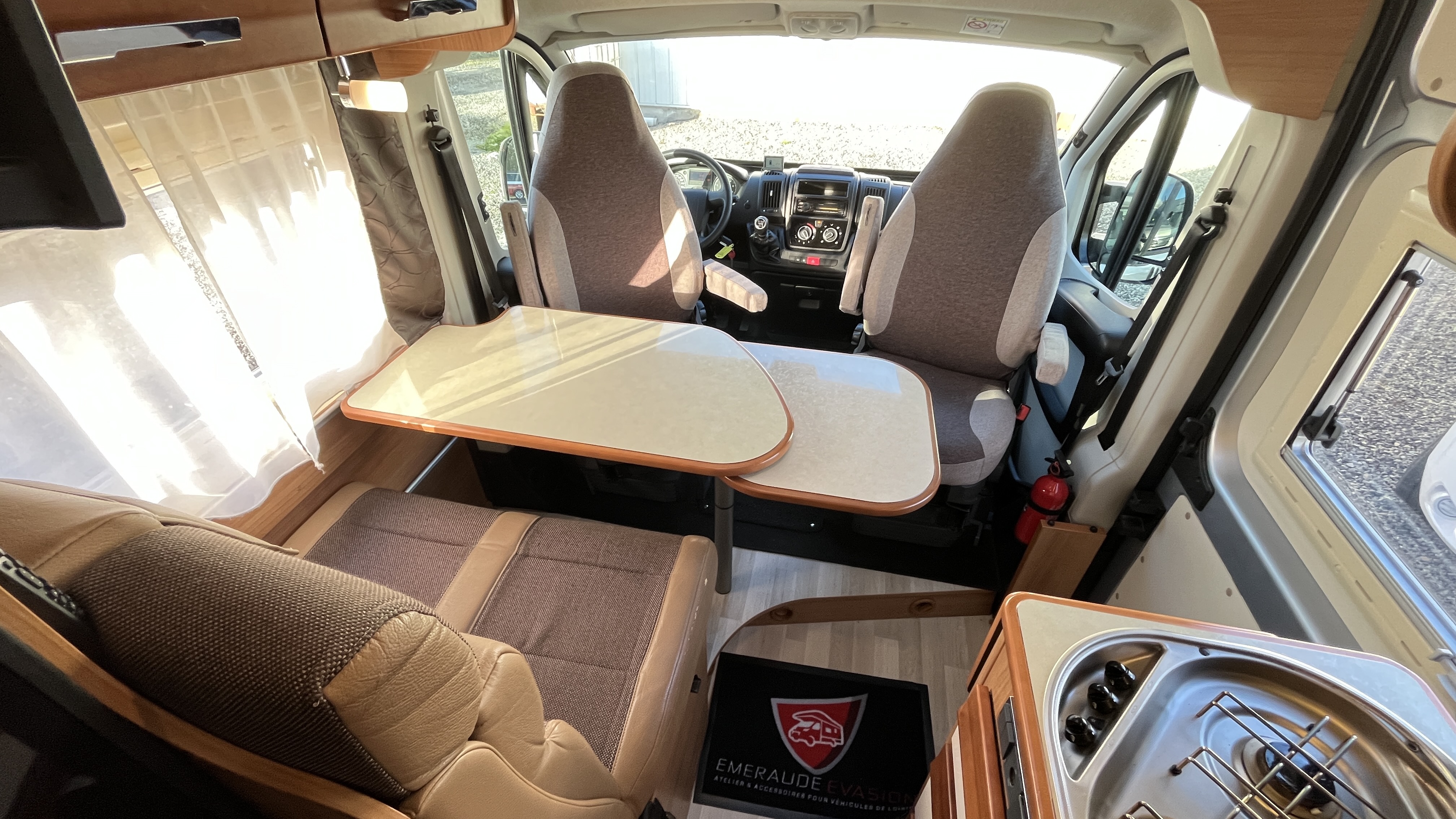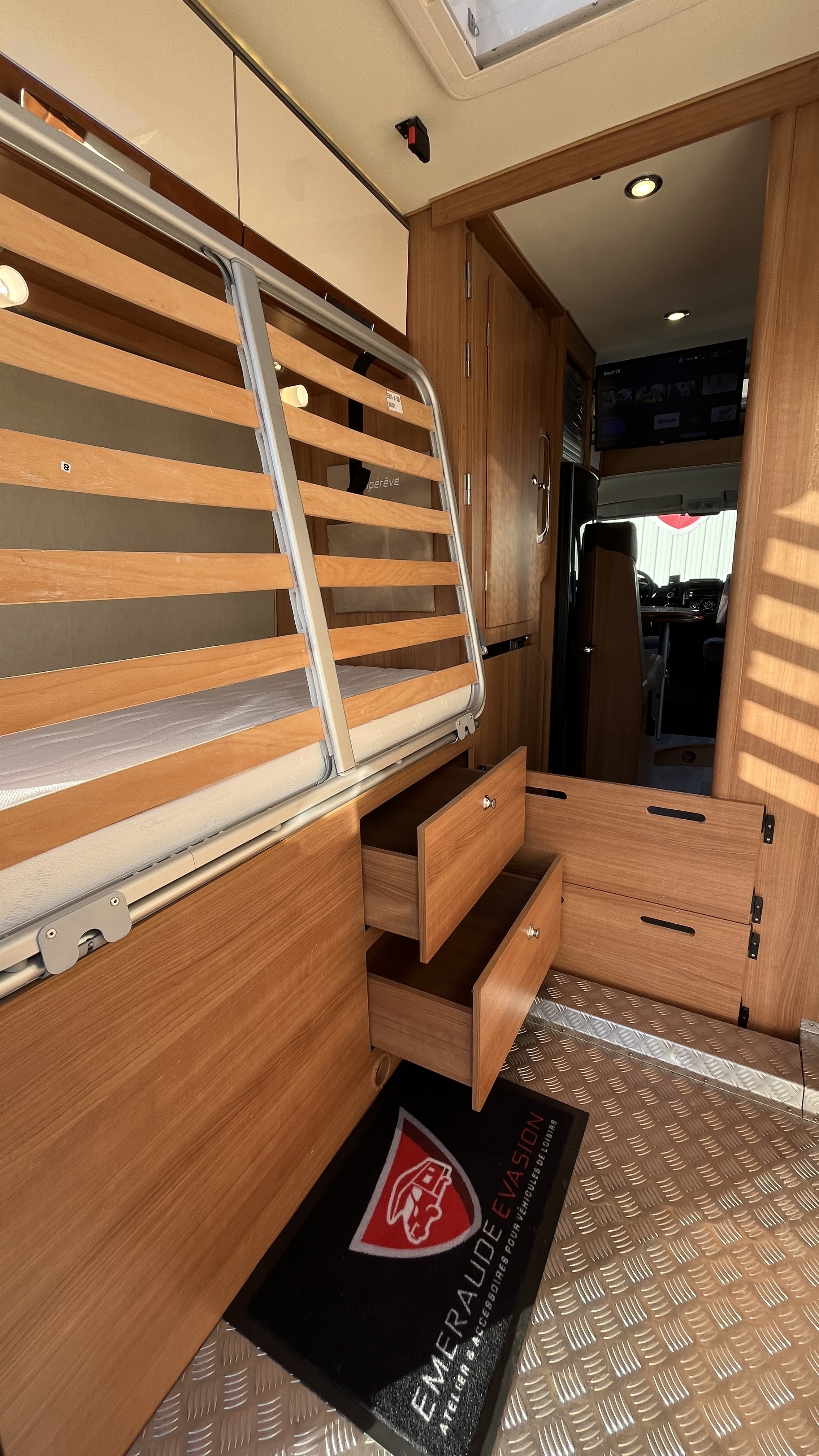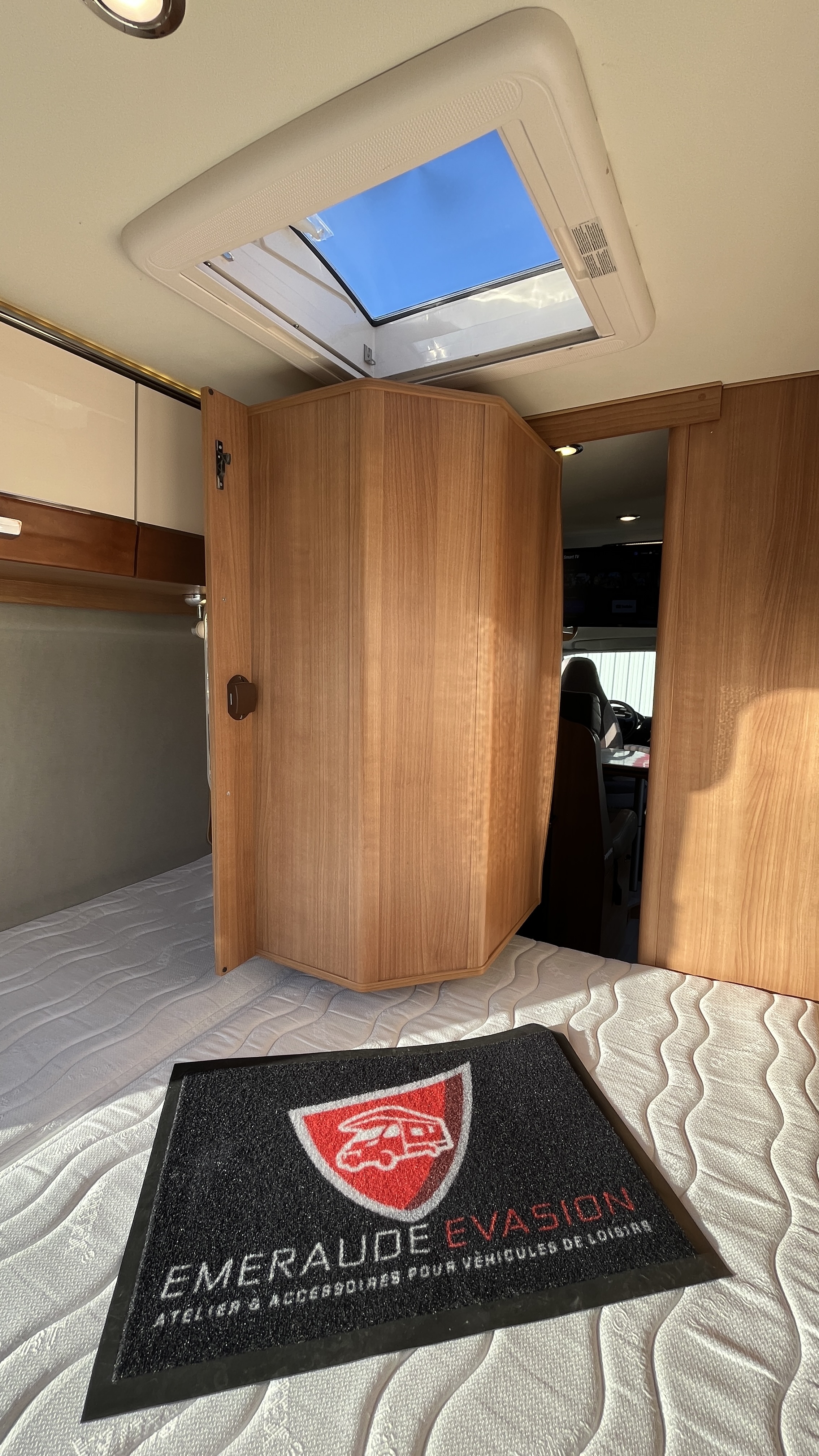 Il est un condensé de tout ce qui se fait de mieux en matière de fourgon aménagé. Son système de penderie pivotante breveté reste un atout de taille : appelé Modul’Space, il se compose d’un vaste cabinet de toilette avec douche séparée. Implanté au centre de l’habitacle, d’un côté la pièce WC/lavabo, dont la porte se déplie en 2 parties pour former une séparation avec le séjour, de l’autre, une penderie pivotante qui bascule vers la chambre, pour finaliser la transformation de l’espace sanitaire et libérer totalement le volume de la douche indépendante. Sa cuisine équipée d’un grand frigo, d’un réchaud 3 feux et d’un évier inox, débouche sur un salon confortable.
