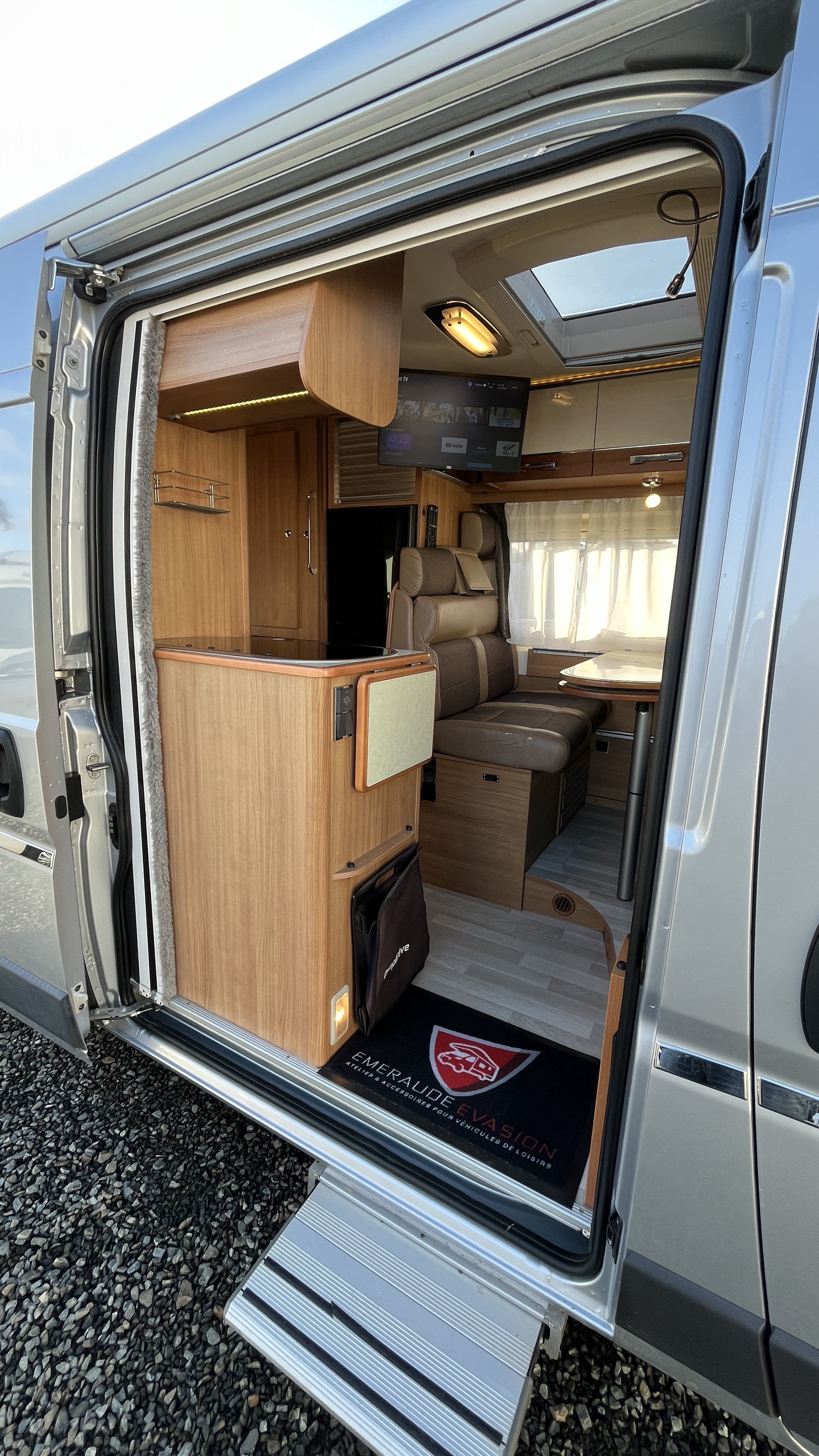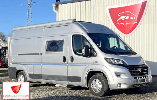 Il est un condensé de tout ce qui se fait de mieux en matière de fourgon aménagé. Son système de penderie pivotante breveté reste un atout de taille : appelé Modul’Space il se compose d’un vaste cabinet de toilette avec douche séparée : au centre de l’habitacle, d’un côté la pièce WC/lavabo, dont la porte se déplie en 2 parties pour former une séparation avec le séjour, de l’autre, une penderie pivotante qui bascule vers la chambre, pour finaliser la transformation de l’espace sanitaire et libérer totalement le volume de la douche indépendante. Ce van baroudeur sait aussi se démarquer par sa carrosserie grise métallisée, un attelage, 2 batteries de cellule, la TV en streaming et un intérieur confortable et cossu. Il offre ici, en plus de son vaste lit transversal, un lit d’appoint sur la dînette pour un total de 3 couchages.