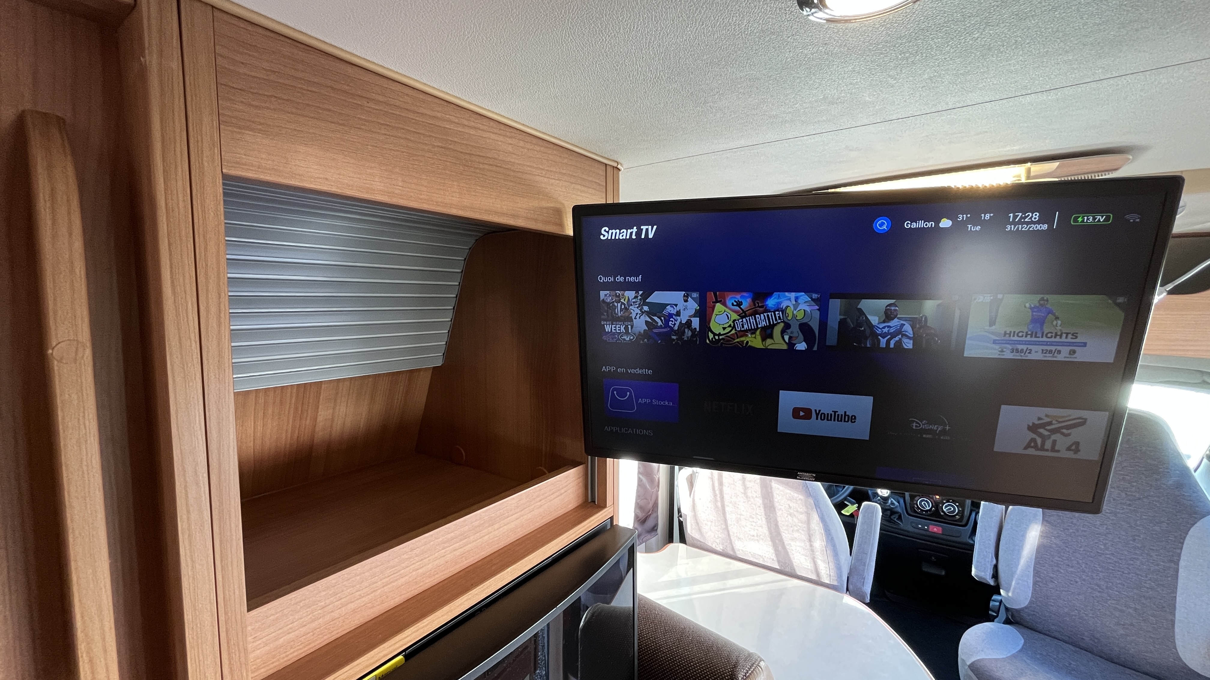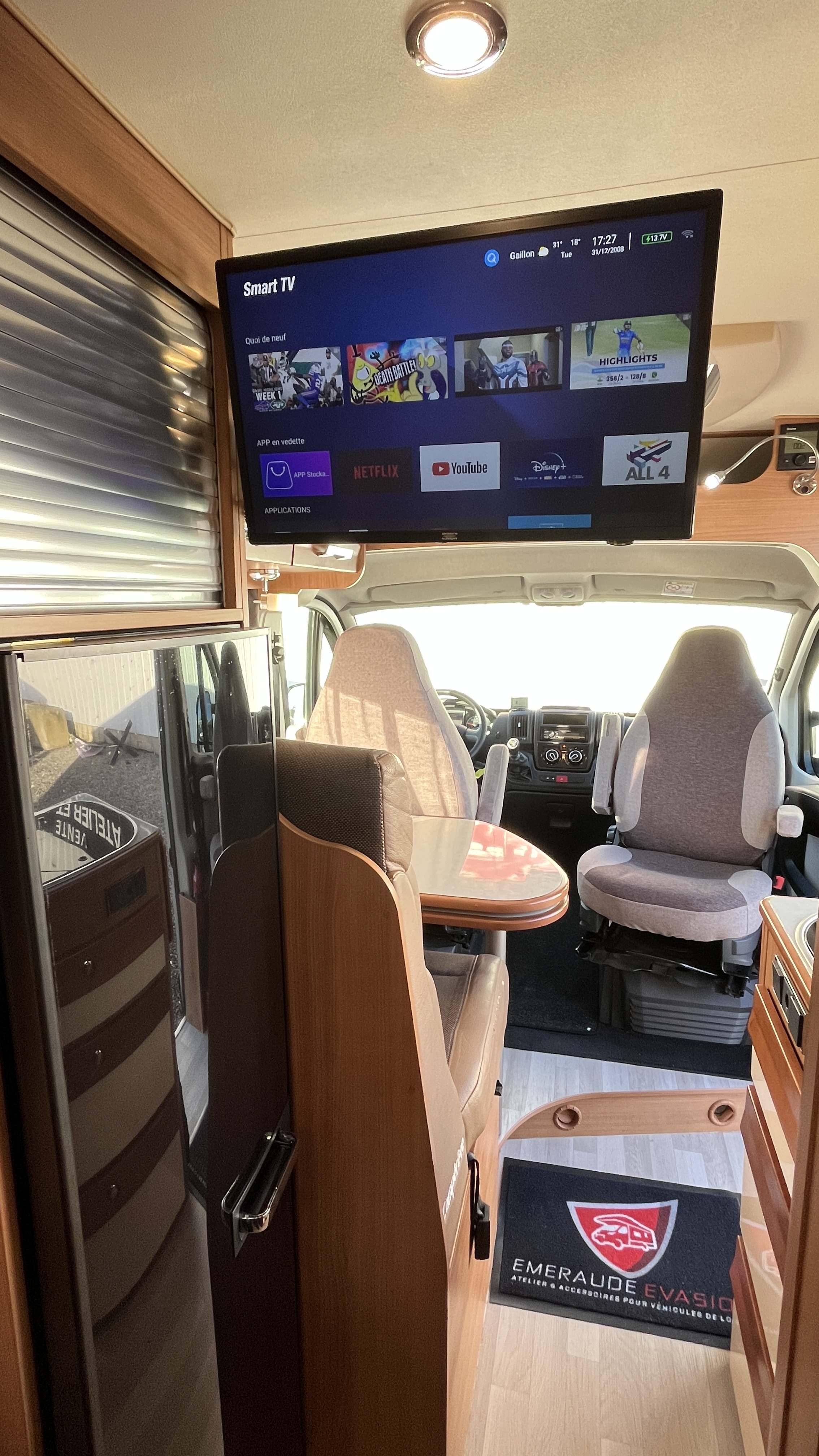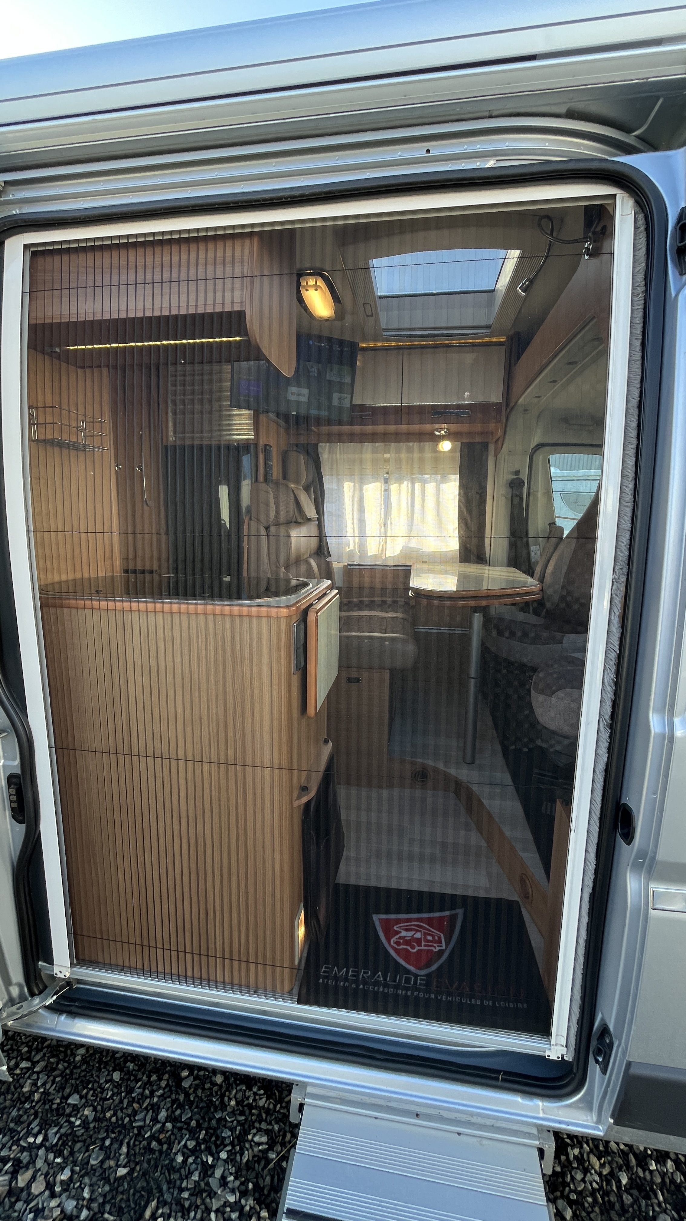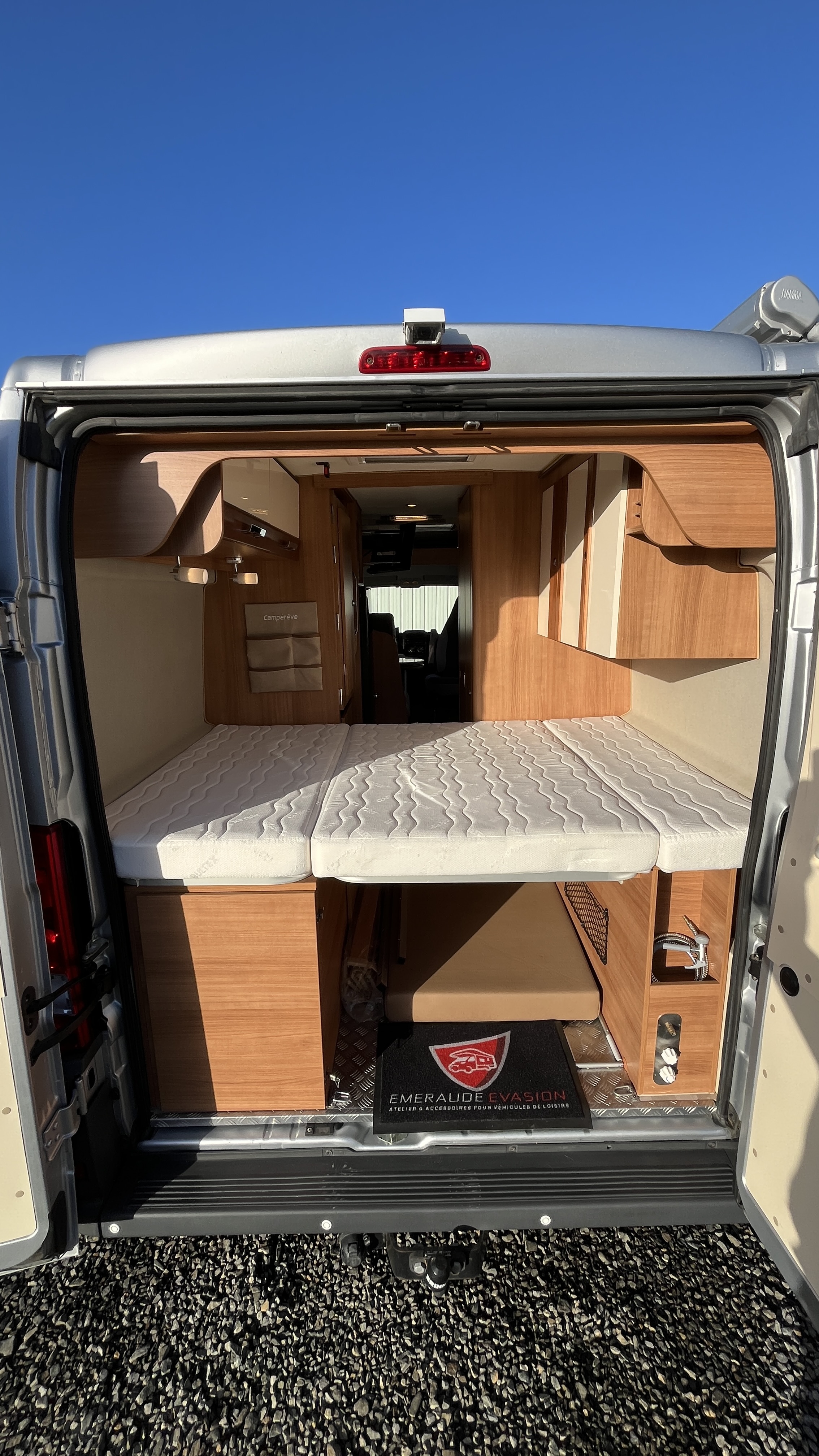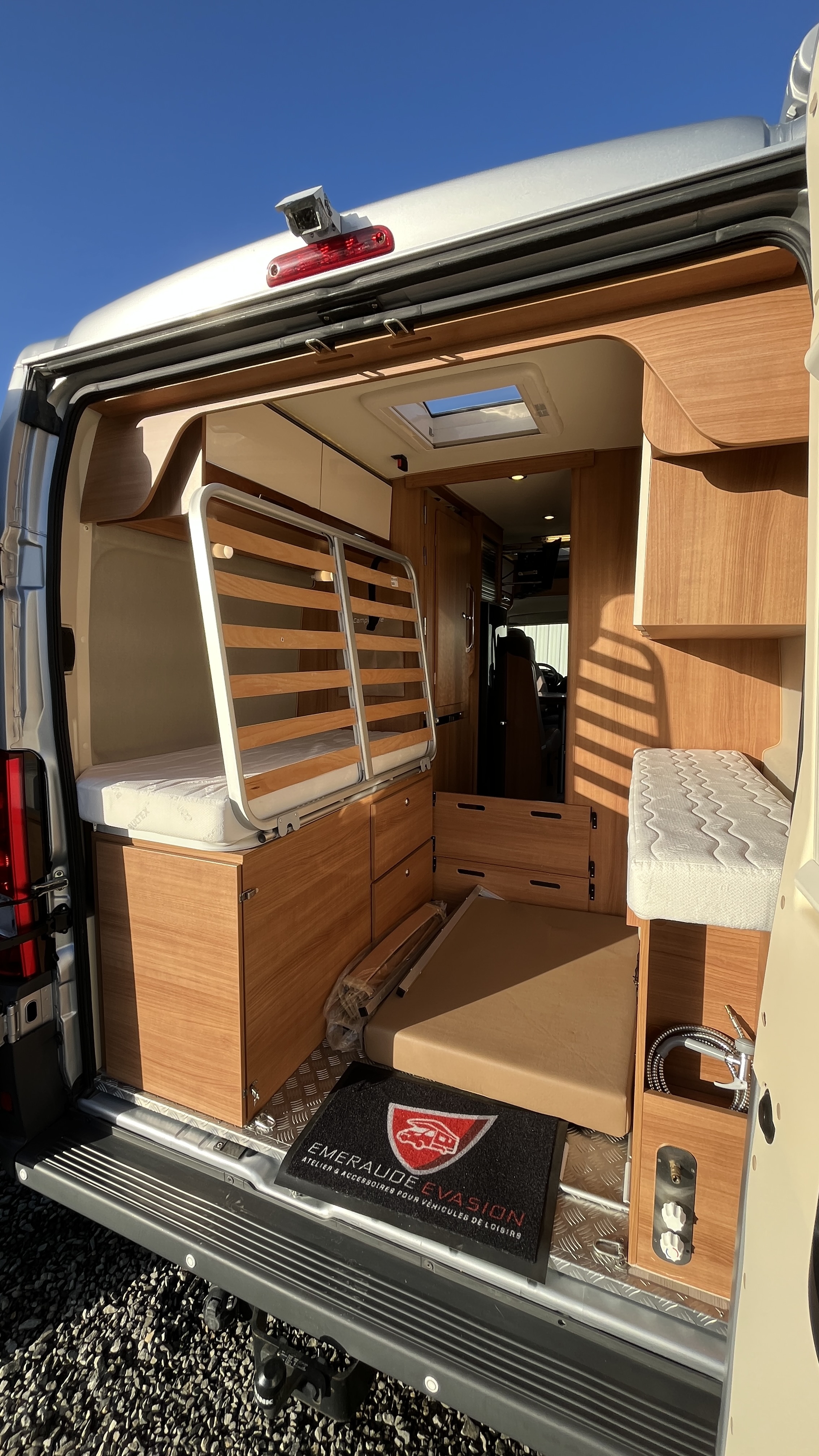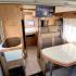 Ce van baroudeur sait aussi se démarquer par sa carrosserie grise métallisée, un attelage, 2 batteries de cellule, la TV en streaming et un intérieur confortable et cossu. Il offre ici, en plus de son vaste lit transversal, un lit d’appoint sur la dînette pour un total de 3 couchages.