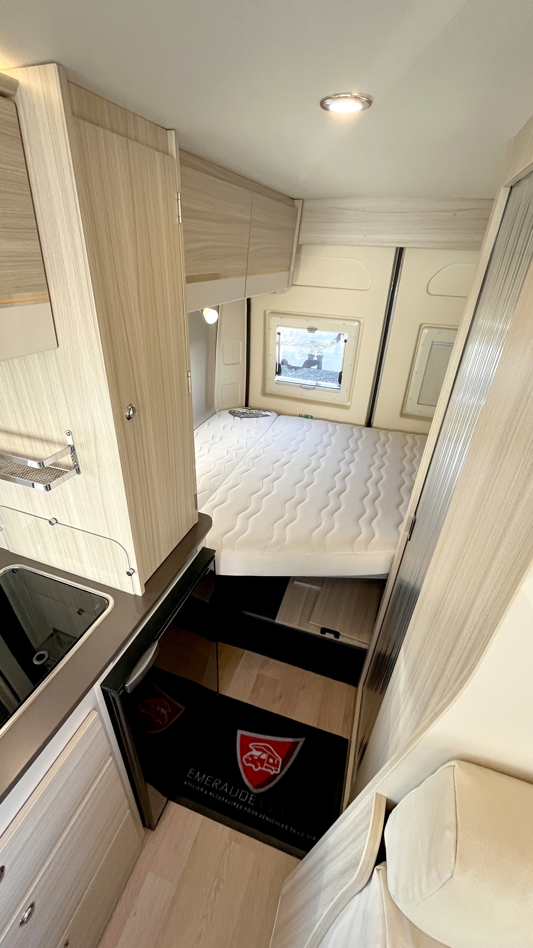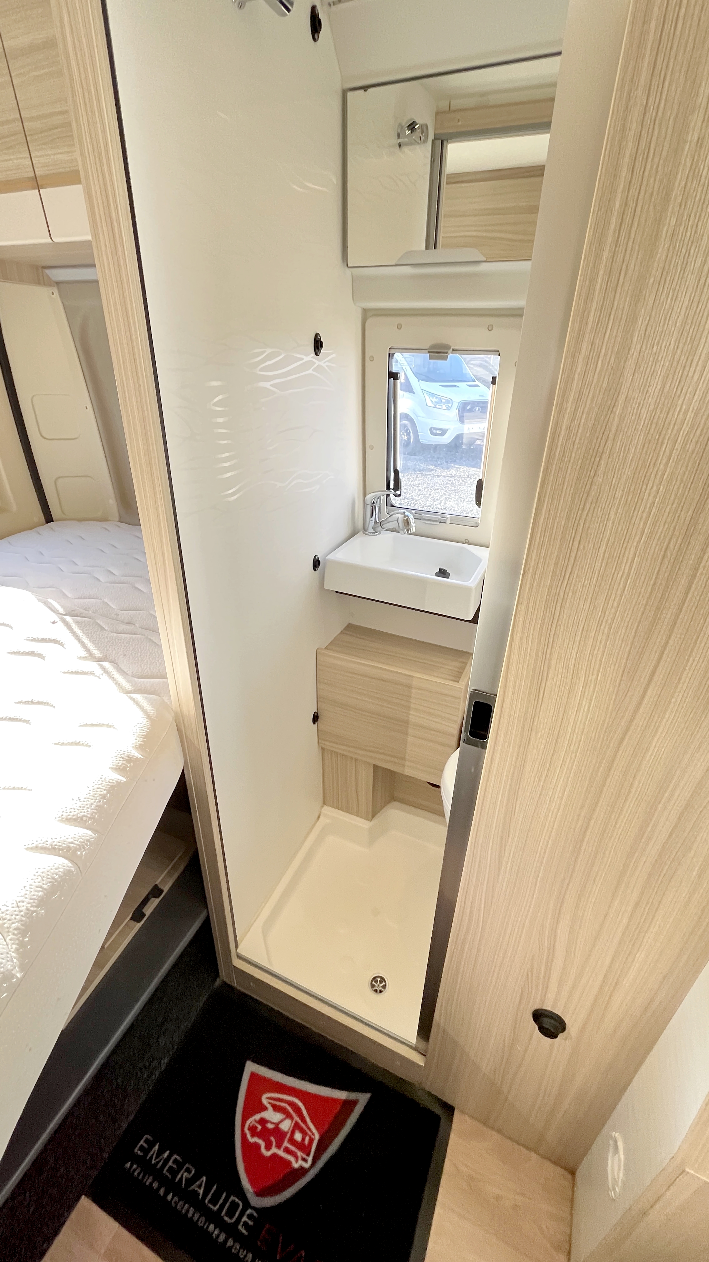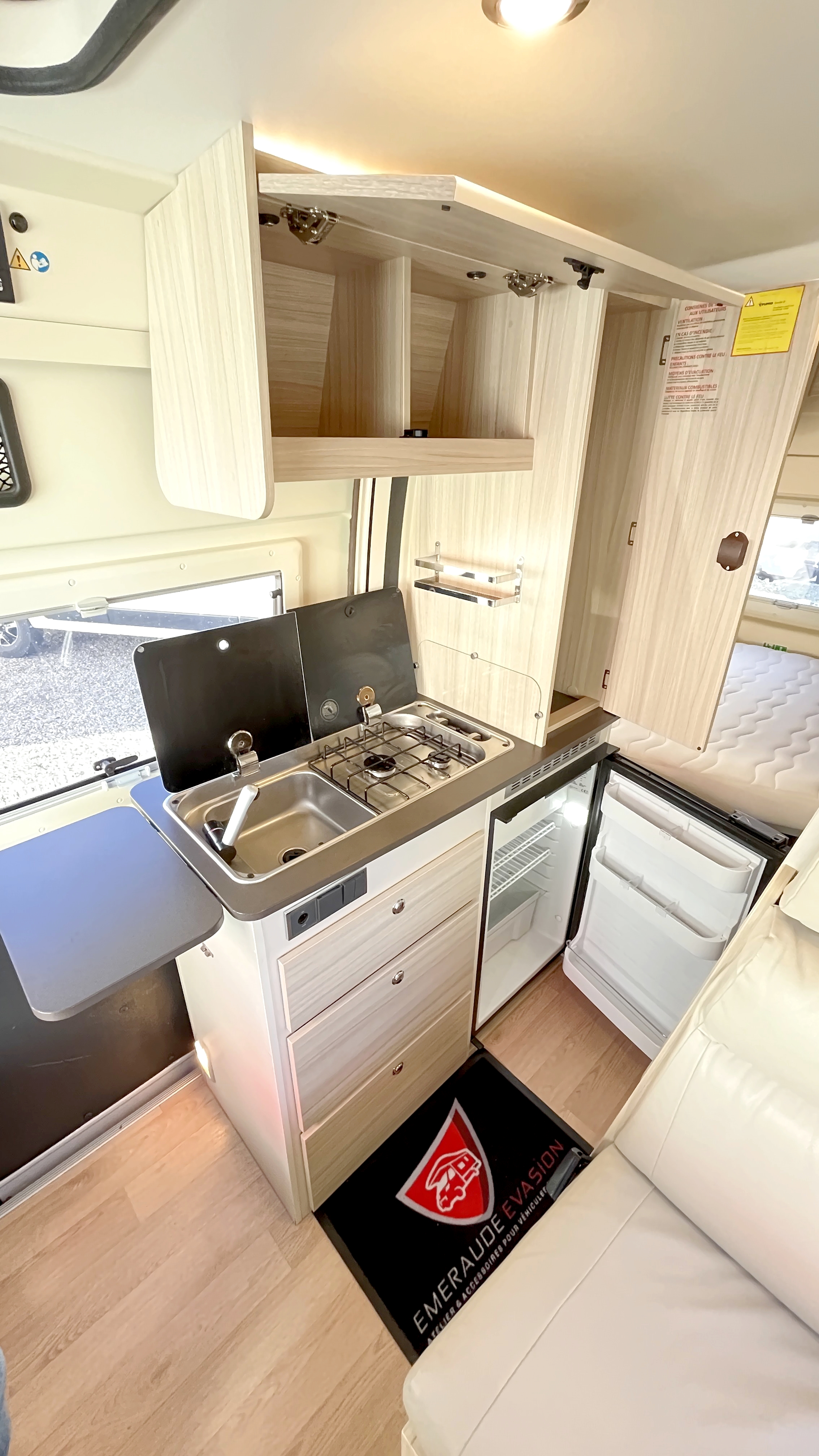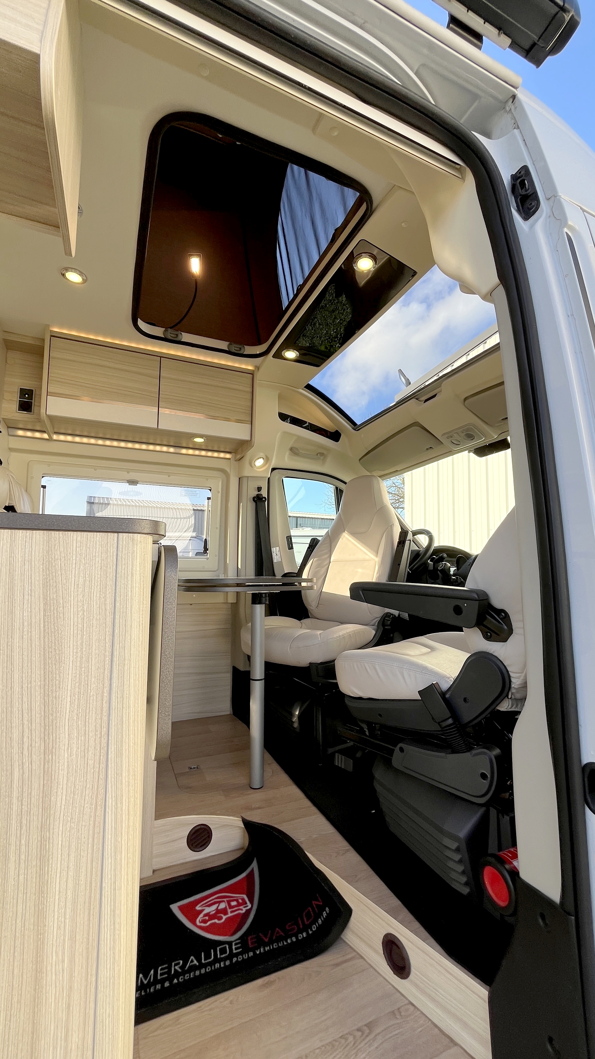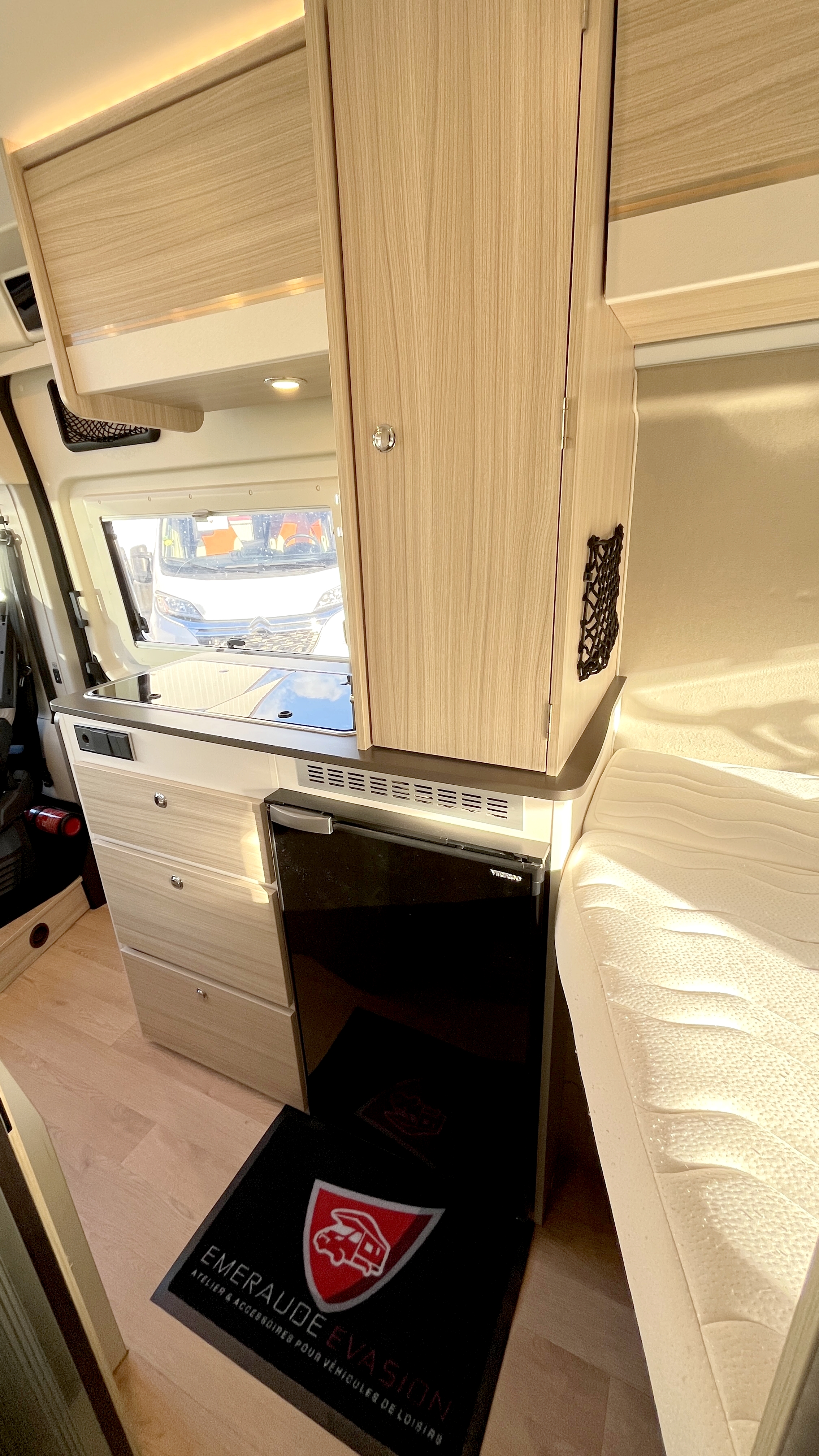 Il est un condensé de tout ce qui se fait de mieux en matière de fourgon aménagé compact. Il se compose d’un combiné cabinet de toilette avec douche intégrée. Grâce à sa porte coulissante et son demi-rideau qui ne recouvre que la partie mobilier, l’espace douche reste confortable à l’usage. Complétée par une fenêtre, vous permettant de vous doucher à l’extérieur. Sa cuisine équipée d’un frigo de 90L, d’un réchaud 2 feux et d’un évier inox, débouche sur un salon confortable baigné de lumière naturelle grâce à son skydôme en verre occultable. Cet intérieur cossu s’appréciera dans la durée grâce à ses 2 batteries de cellule couplées à un panneau solaire ultra plat.