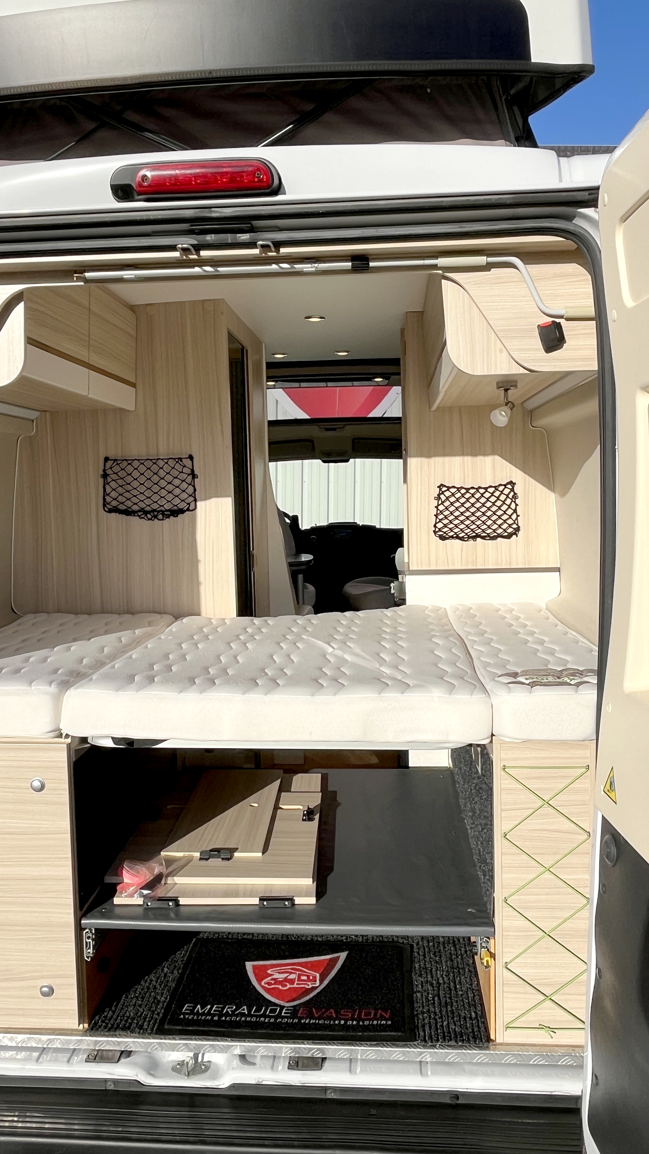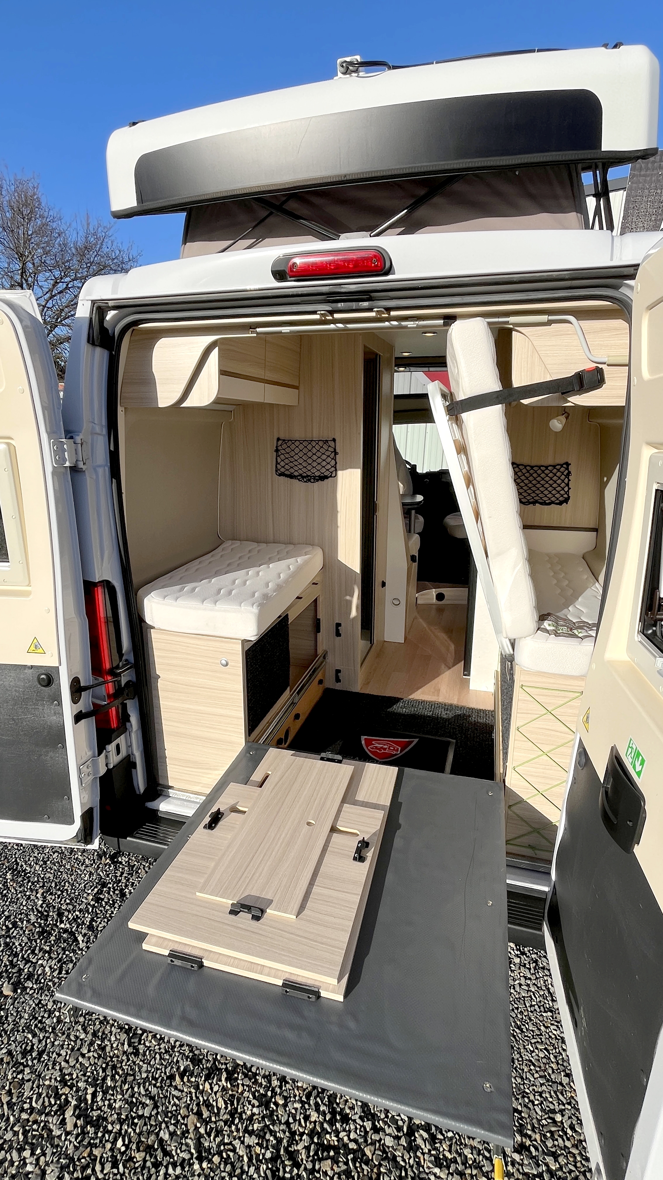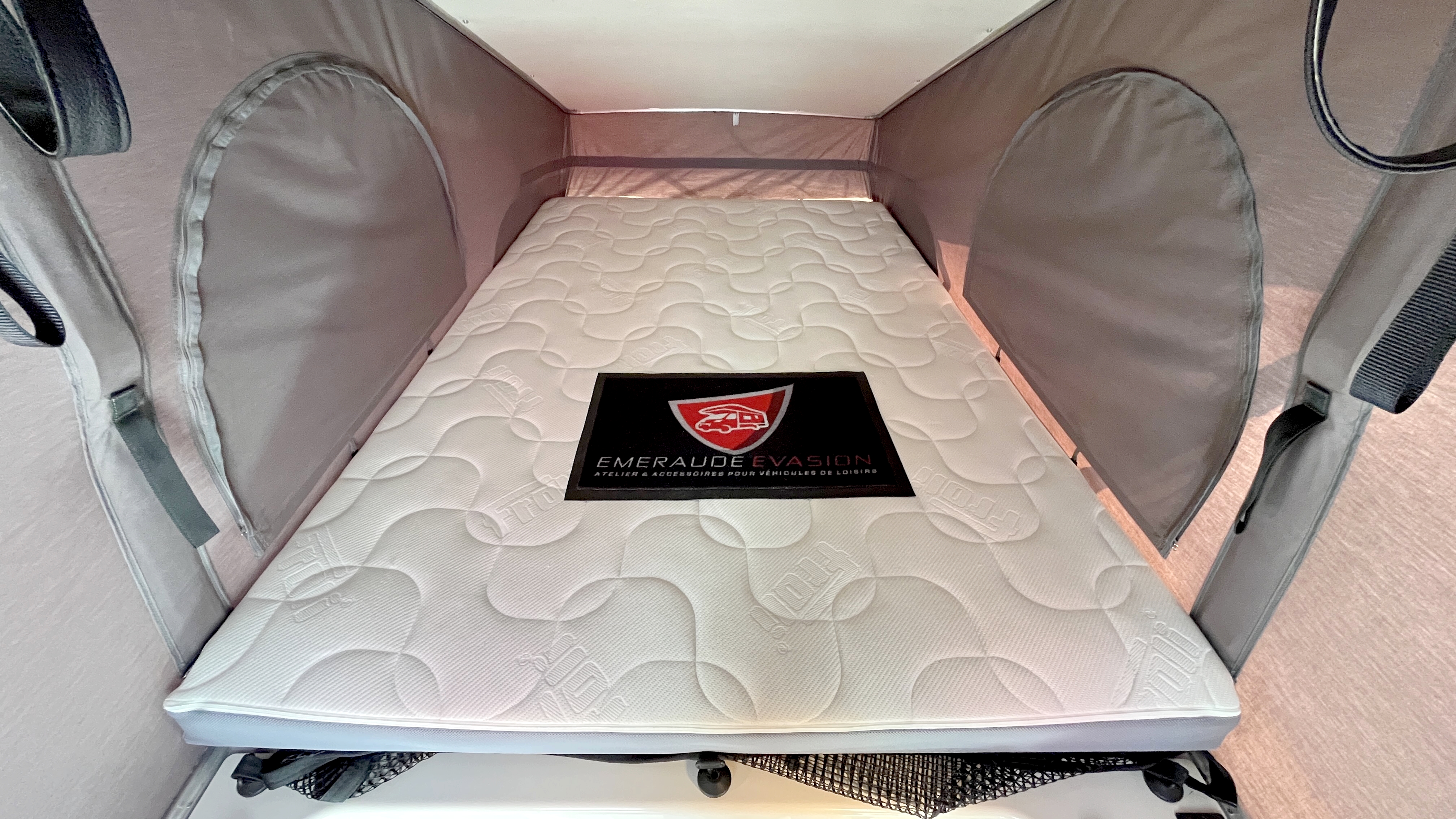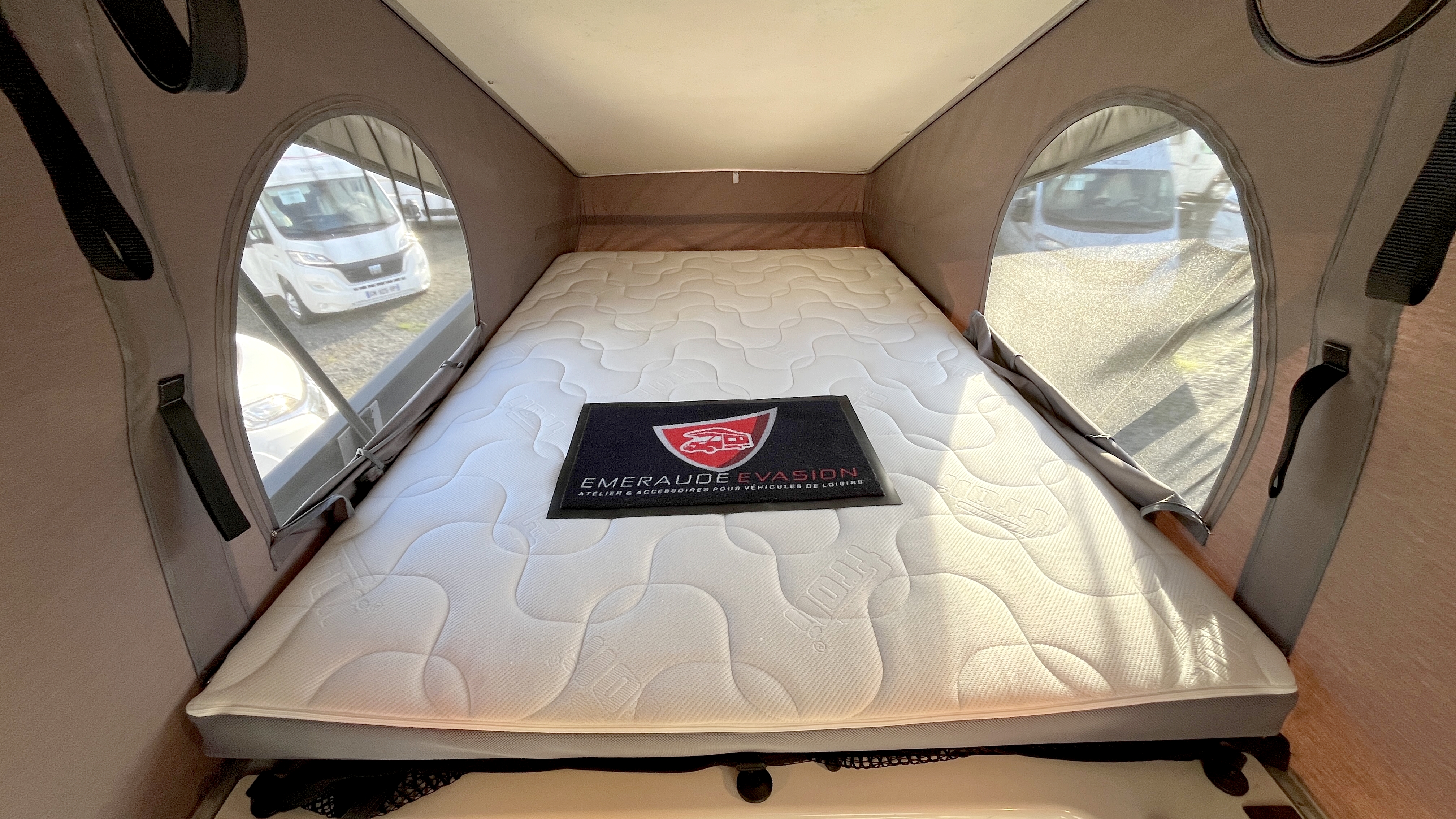 Il offre un total de 4 couchages équipés de matelas Bultex et de sommier à lattes. Son vaste lit de pavillon à toit rigide relevable accueillera 2 adultes et intègre une buse de diffusion de chauffage. Un lit double transversal pouvant, au besoin, être intégralement démonté pour profiter d’une vaste soute volumineuse et modulable, parfaite pour transporter du matériel long (skis, surf...). Elle s'enrichit ici d'un astucieux et très pratique plateau coulissant, démontable au besoin, qui permet de fractionner l'espace et de lui offrir encore plus de modularité. Elle-même protégée par une moquette et un revêtement de sol robuste et antidérapant. Ainsi vous pourrez, par exemple, transporter et accéder facilement à votre matériel de sport ou autres accessoires. Et même encore augmenter sa capacité d'emport d'objets longs grâce à ses 2 rails capables d'accueillir des barres de toit.