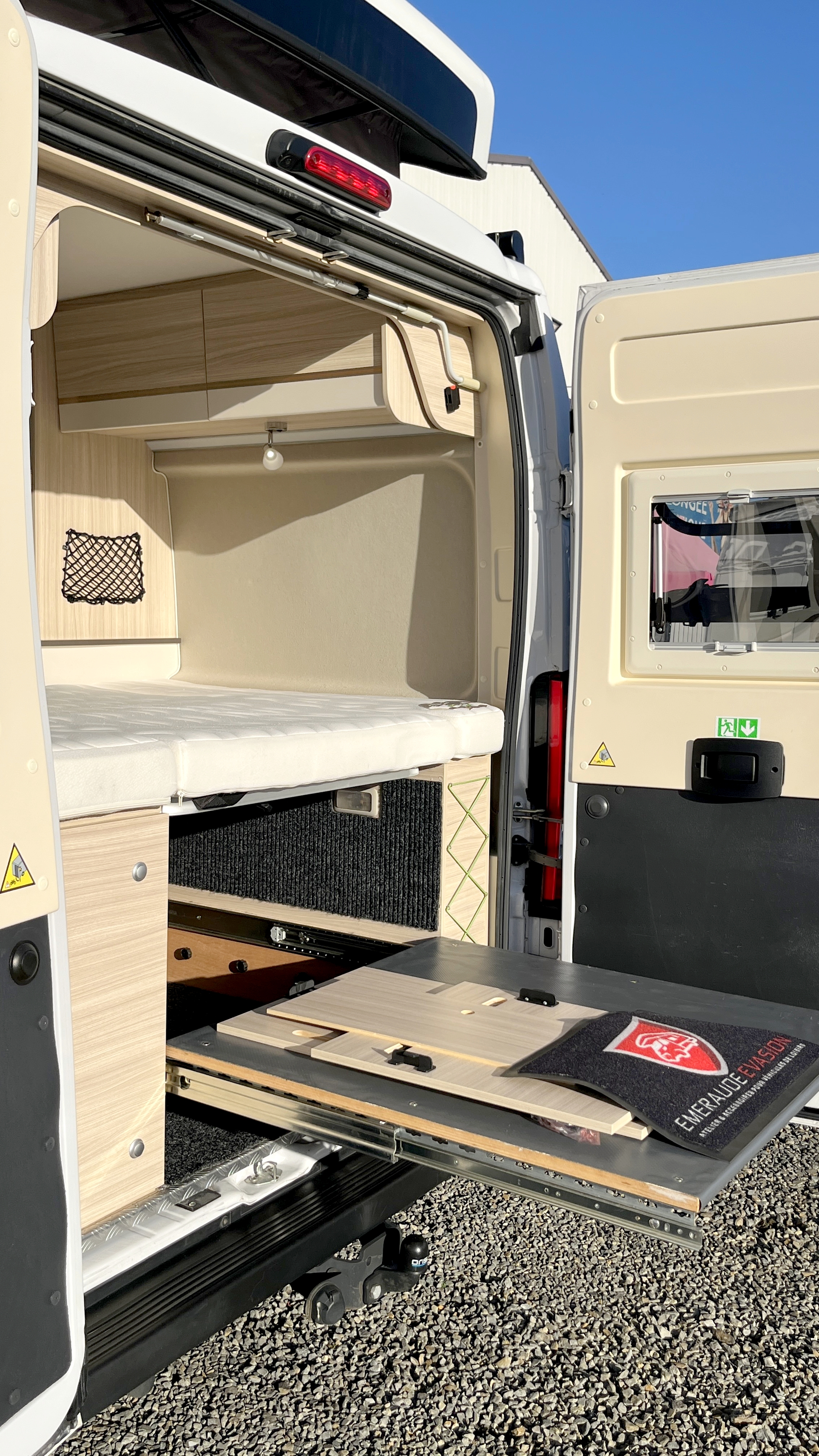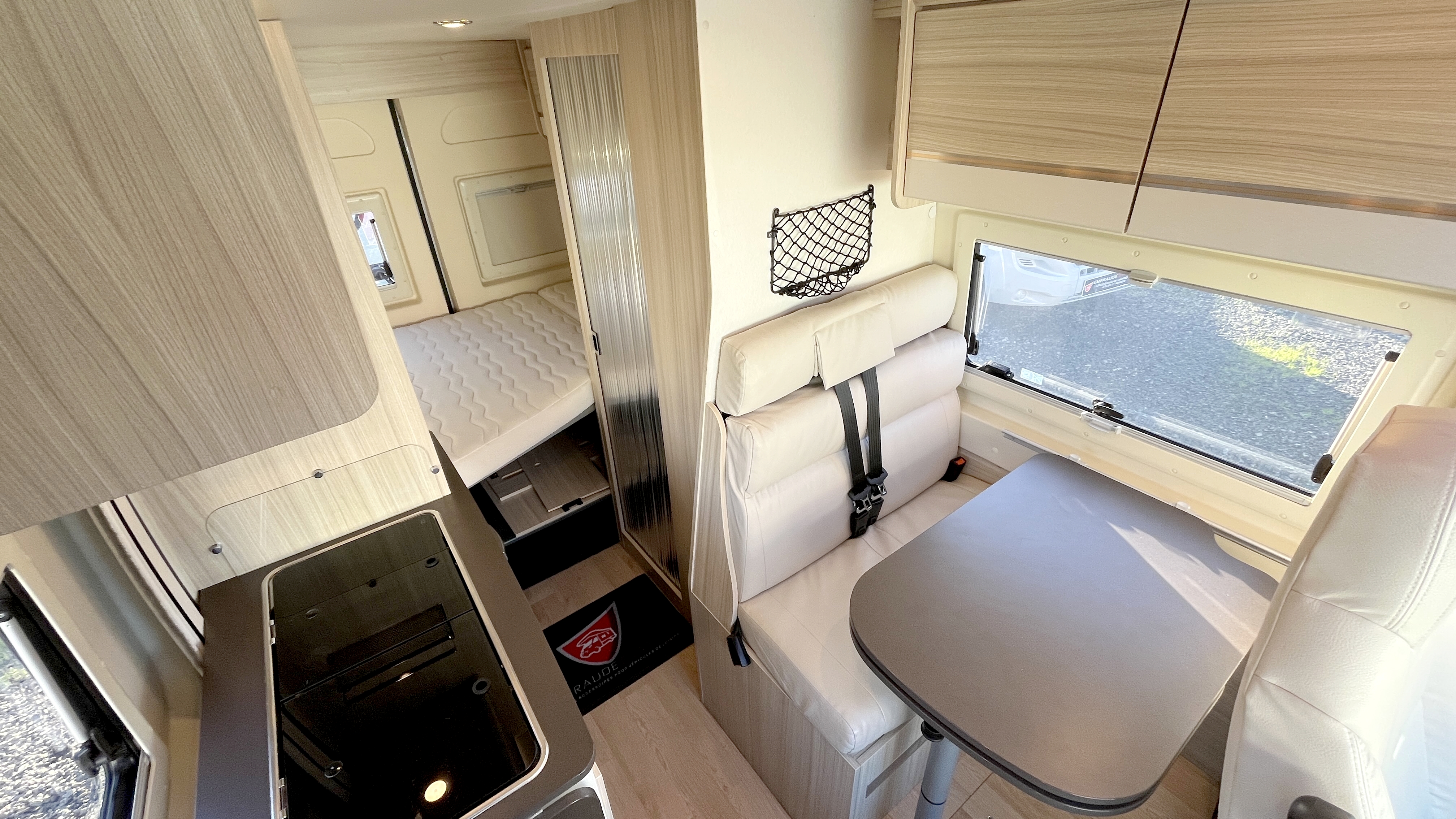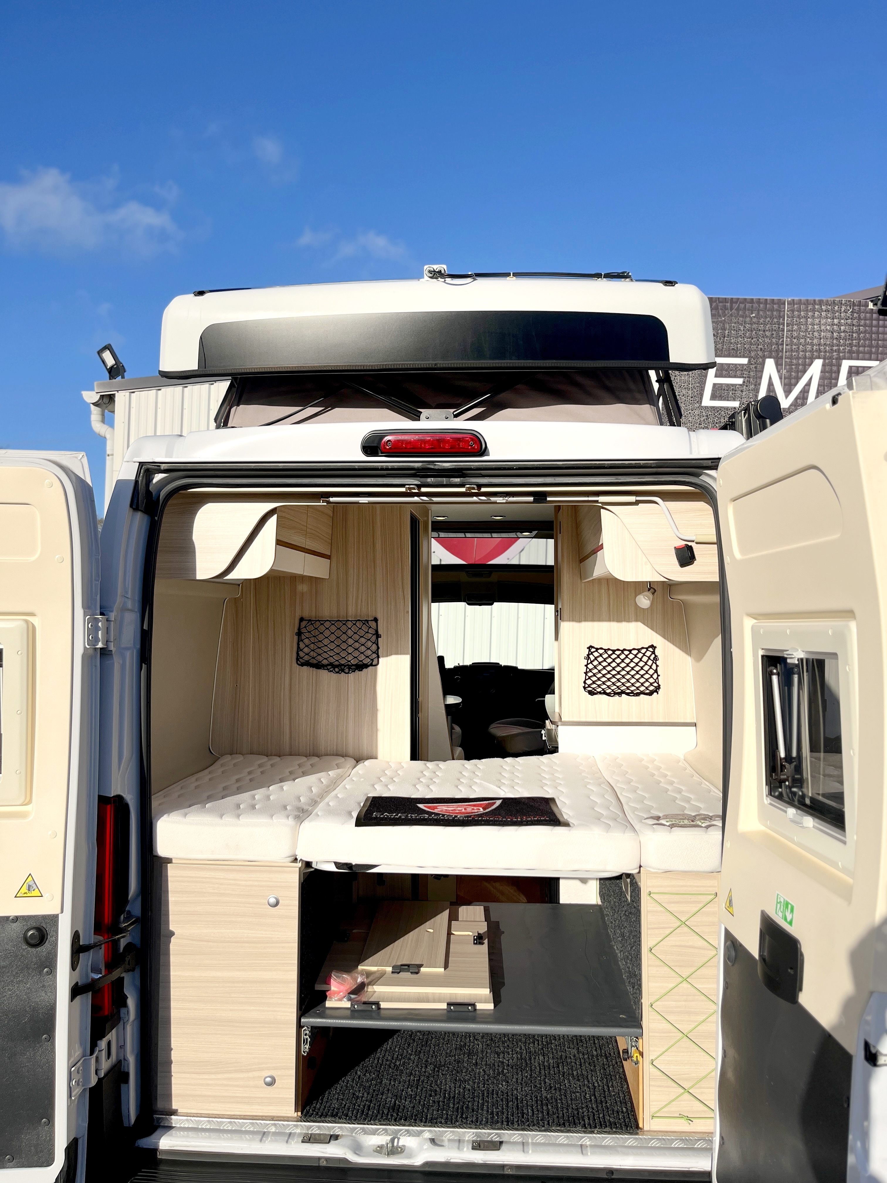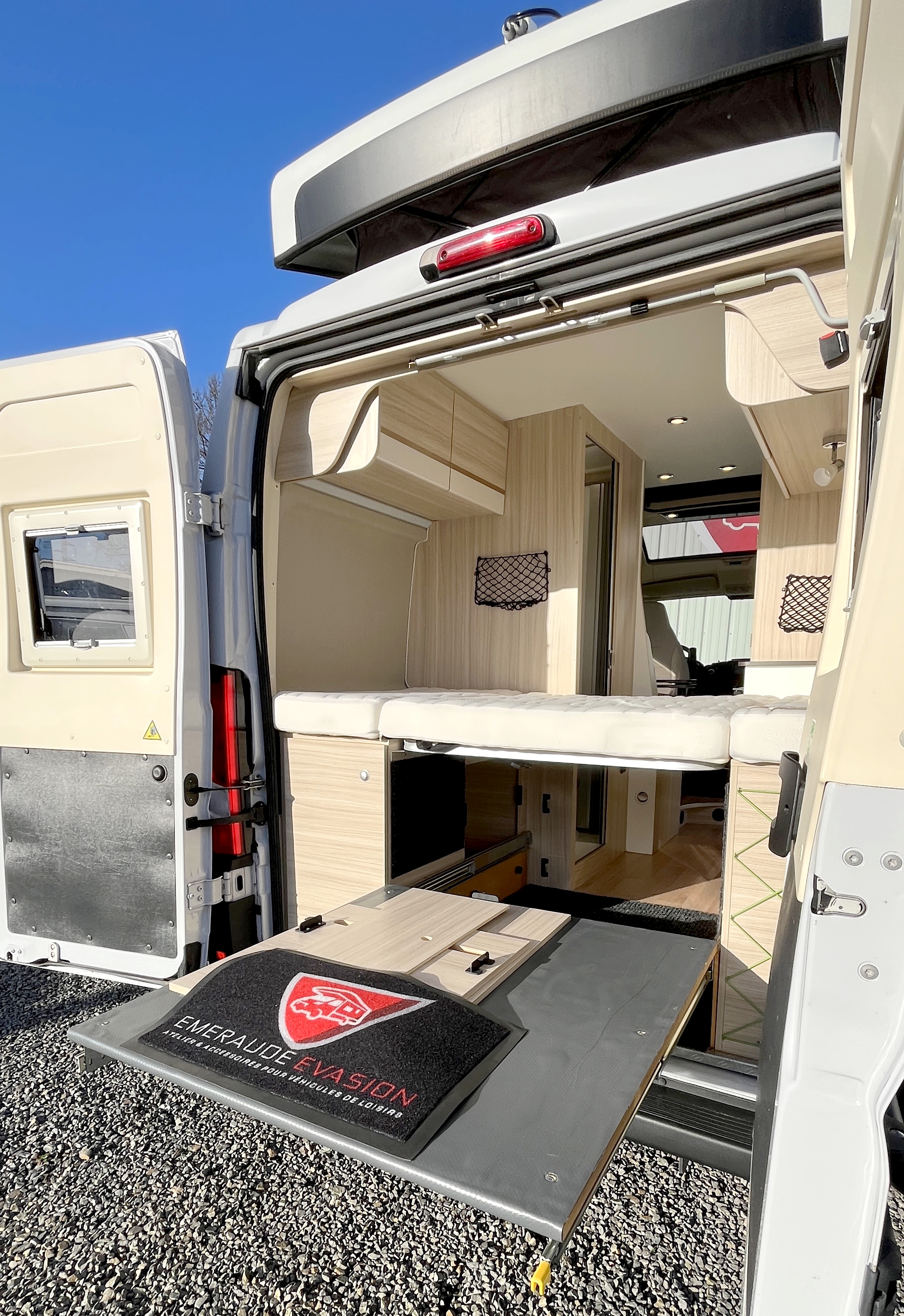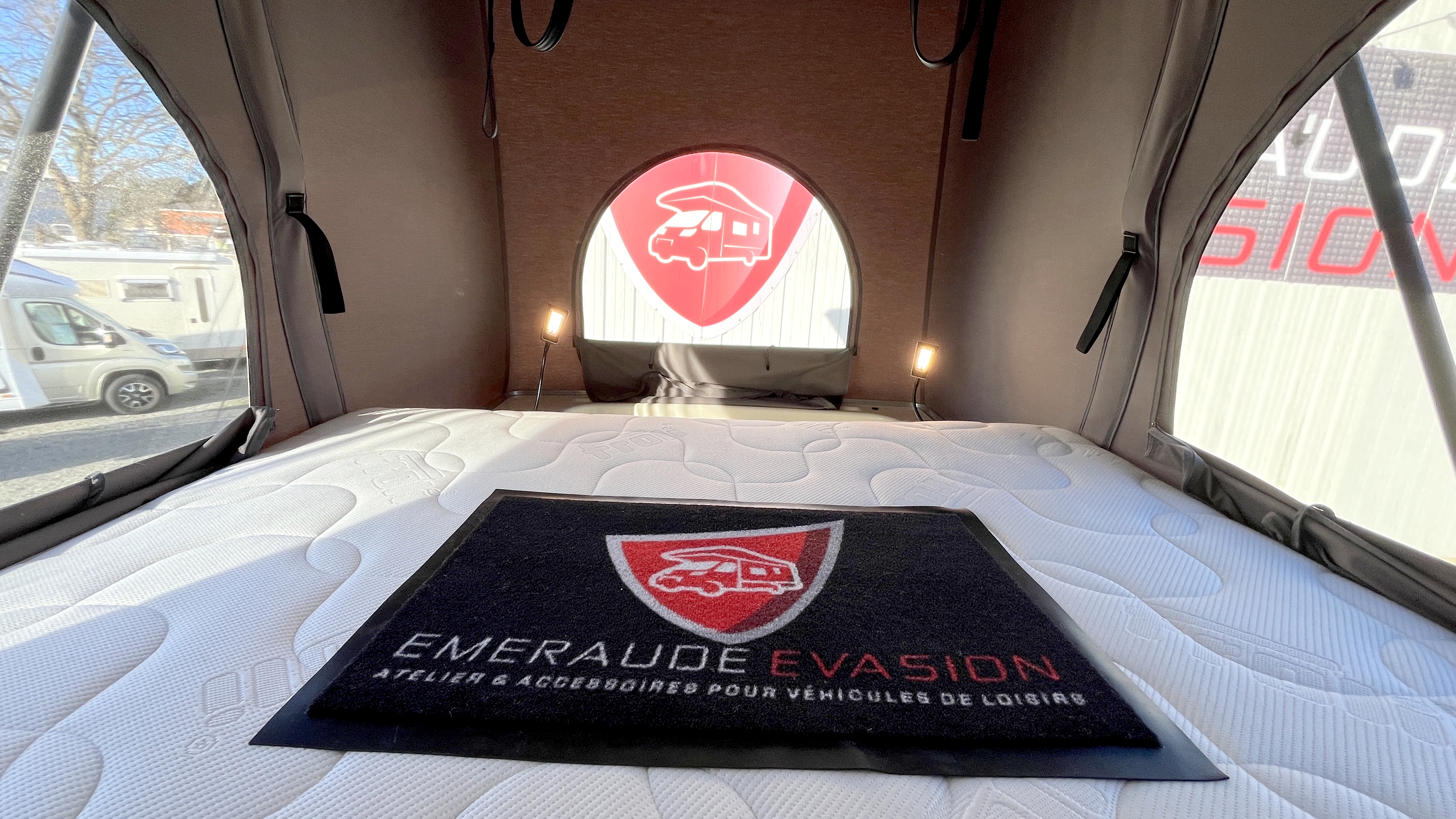 Il offre un total de 4 couchages équipés de matelas Bultex et de sommier à lattes. Son vaste lit de pavillon à toit rigide relevable accueillera 2 adultes et intègre une buse de diffusion de chauffage. Un lit double transversal pouvant, au besoin, être intégralement démonté pour profiter d’une vaste soute volumineuse et modulable, parfaite pour transporter du matériel long (skis, surf...). Elle s'enrichit ici d'un astucieux et très pratique plateau coulissant, démontable au besoin, qui permet de fractionner l'espace et de lui offrir encore plus de modularité. Elle-même protégée par une moquette et un revêtement de sol robuste et antidérapant. Ainsi vous pourrez, par exemple, transporter et accéder facilement à votre matériel de sport ou autres accessoires. Et même encore augmenter sa capacité d'emport d'objets longs grâce à ses 2 rails capables d'accueillir des barres de toit.
