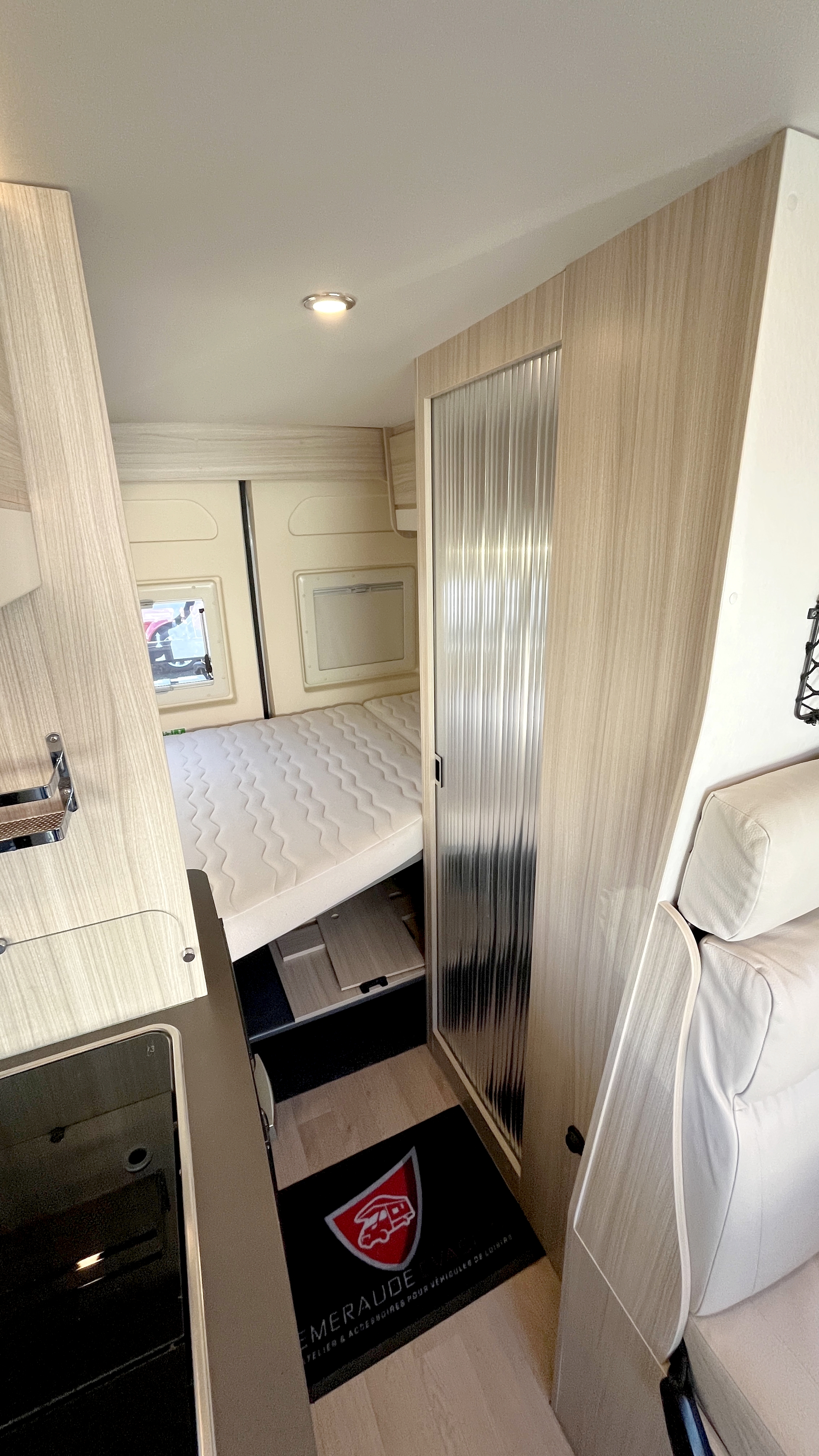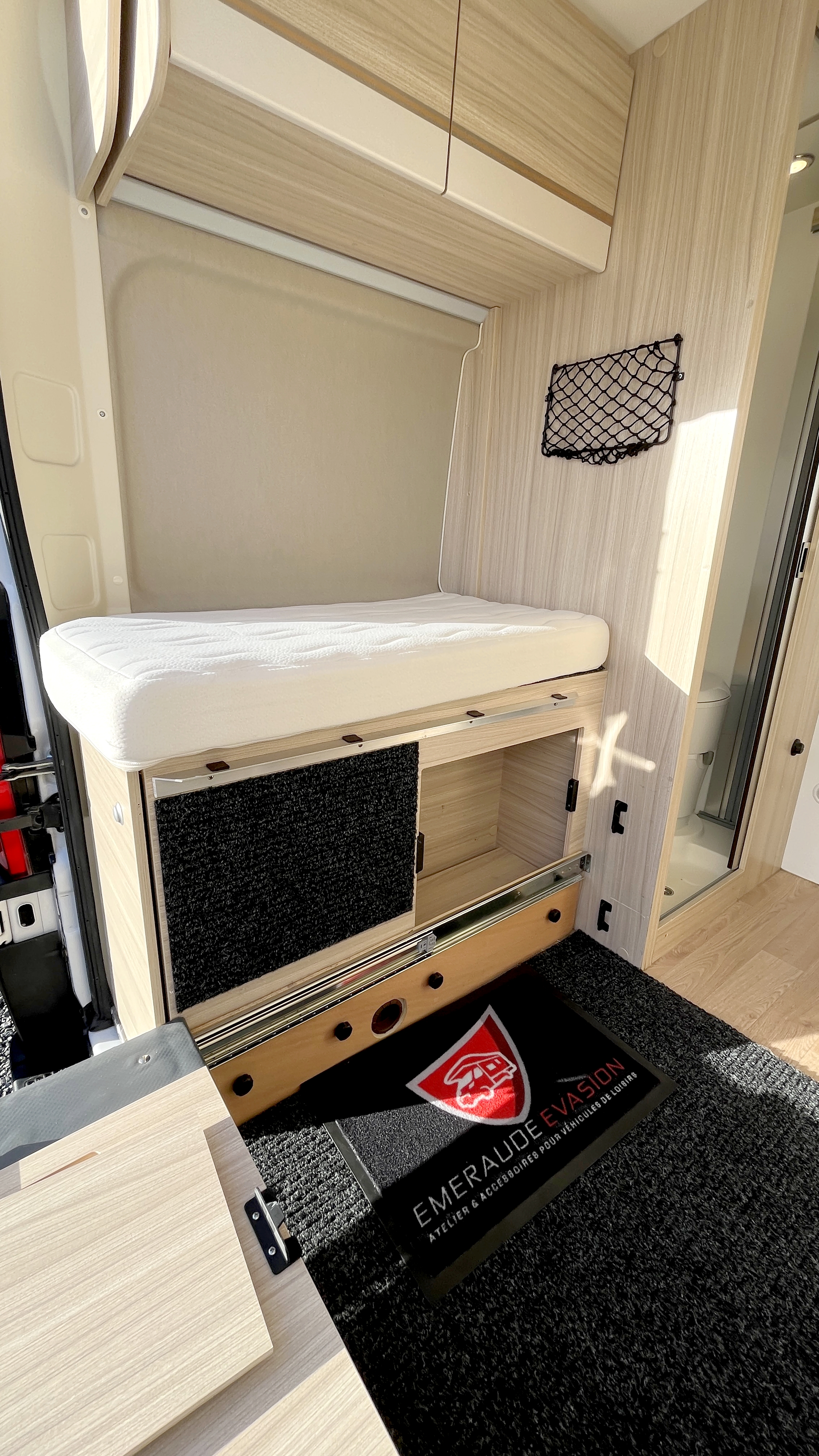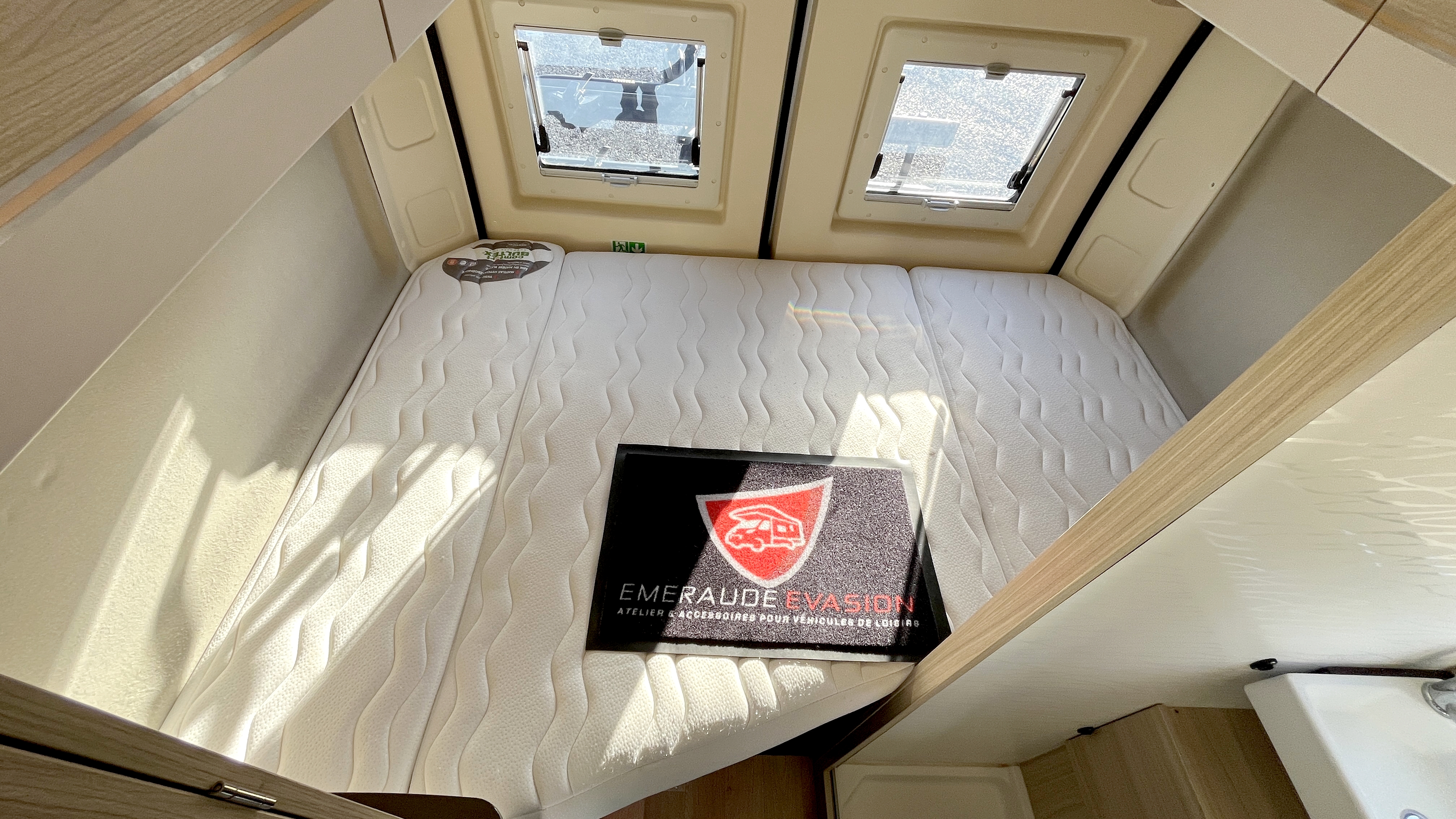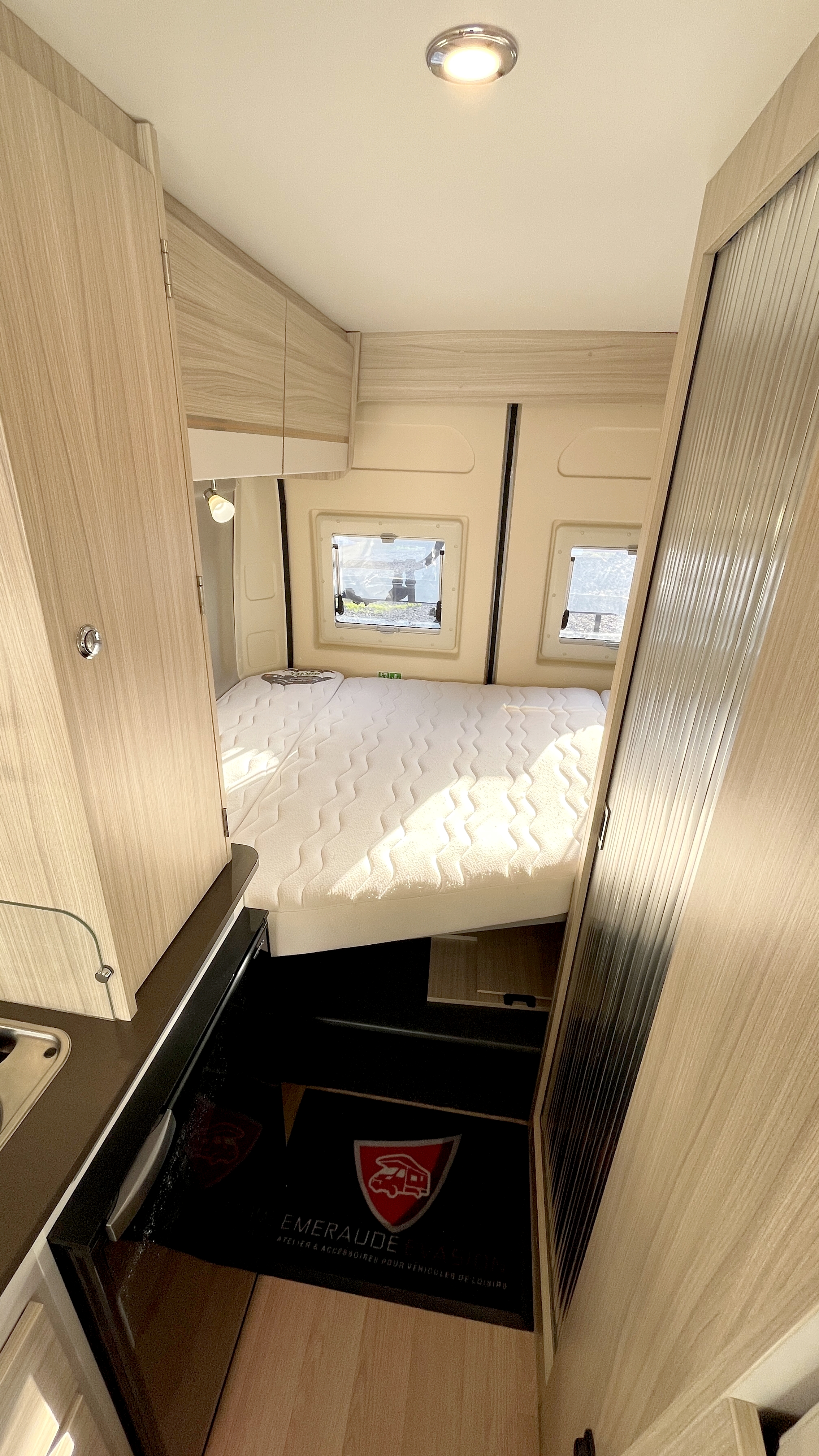 Il offre un total de 4 couchages équipés de matelas Bultex et de sommier à lattes. Son vaste lit de pavillon à toit rigide relevable accueillera 2 adultes et intègre une buse de diffusion de chauffage. Un lit double transversal pouvant, au besoin, être intégralement démonté pour profiter d’une vaste soute volumineuse et modulable, parfaite pour transporter du matériel long (skis, surf...). Elle s'enrichit ici d'un astucieux et très pratique plateau coulissant, démontable au besoin, qui permet de fractionner l'espace et de lui offrir encore plus de modularité. Elle-même protégée par une moquette et un revêtement de sol robuste et antidérapant. Ainsi vous pourrez, par exemple, transporter et accéder facilement à votre matériel de sport ou autres accessoires. Et même encore augmenter sa capacité d'emport d'objets longs grâce à ses 2 rails capables d'accueillir des barres de toit.