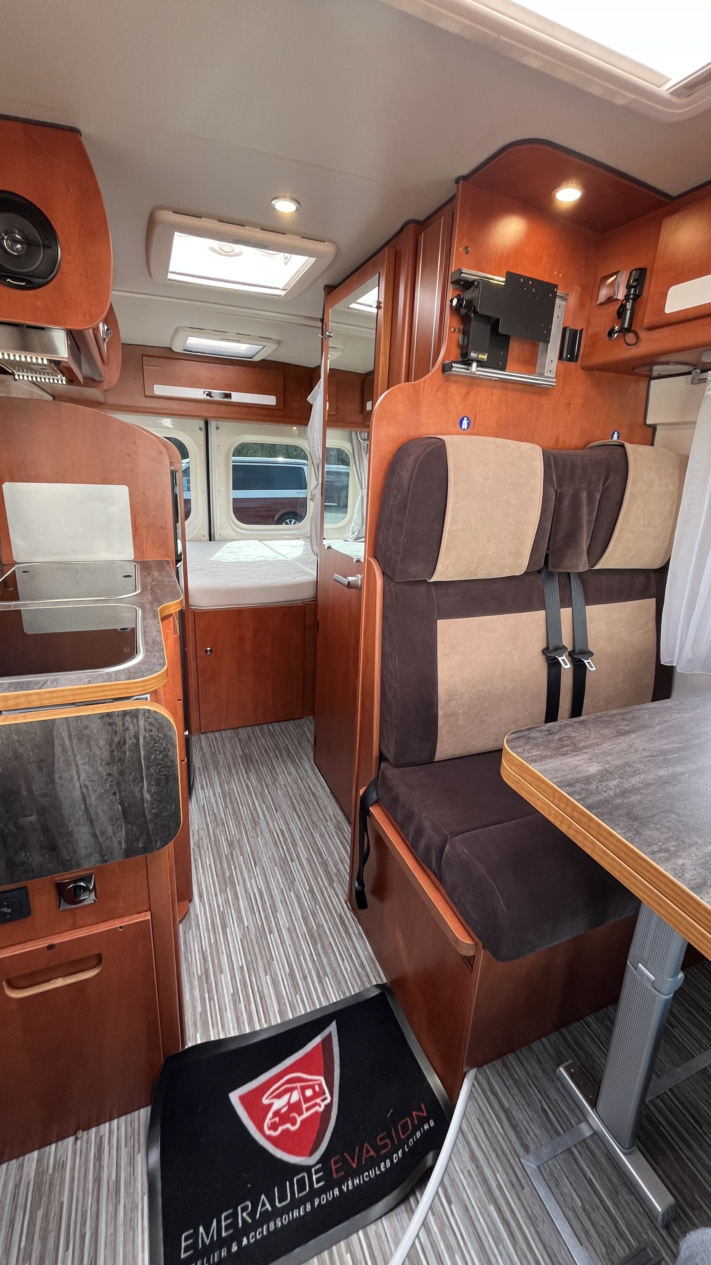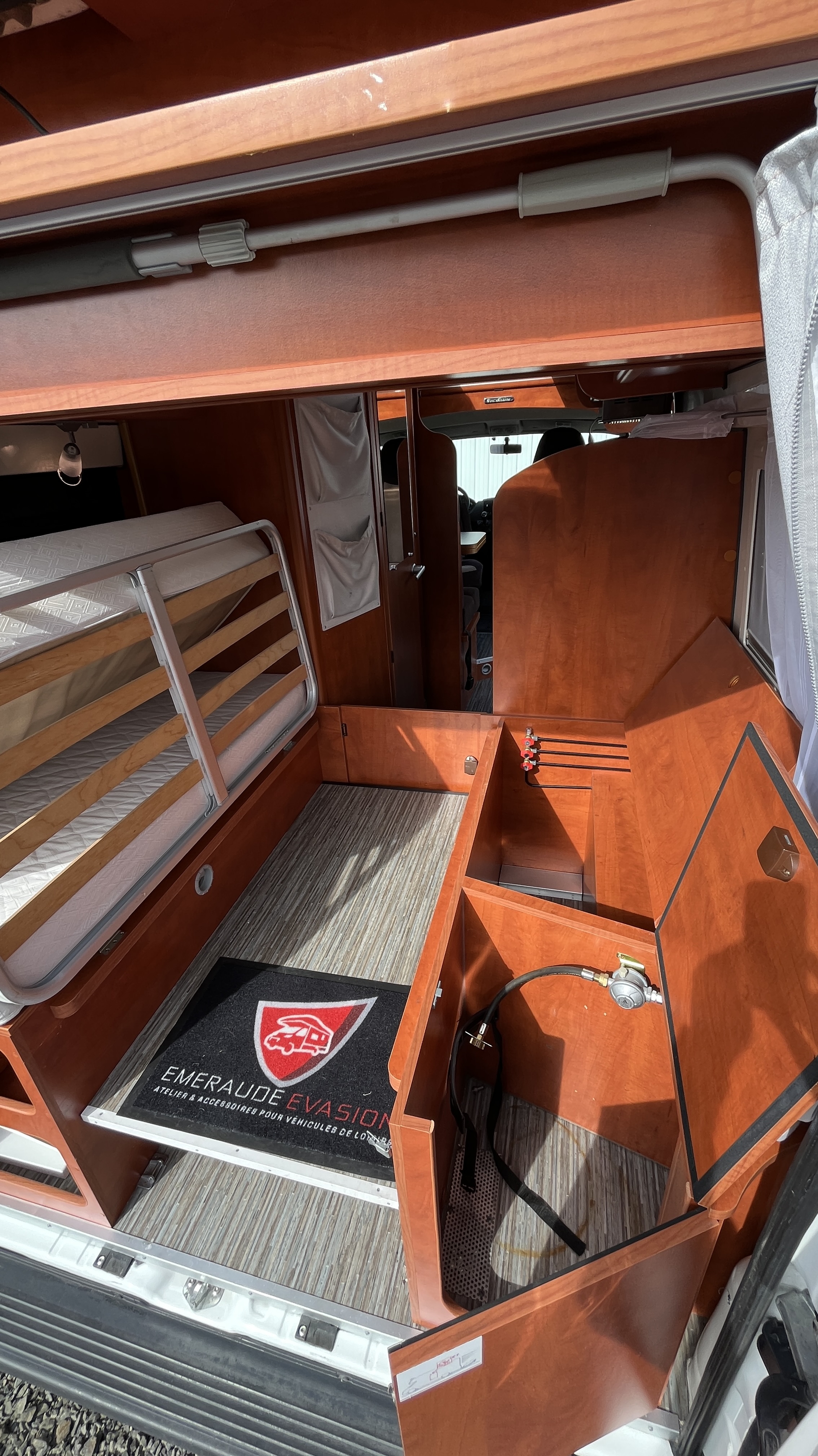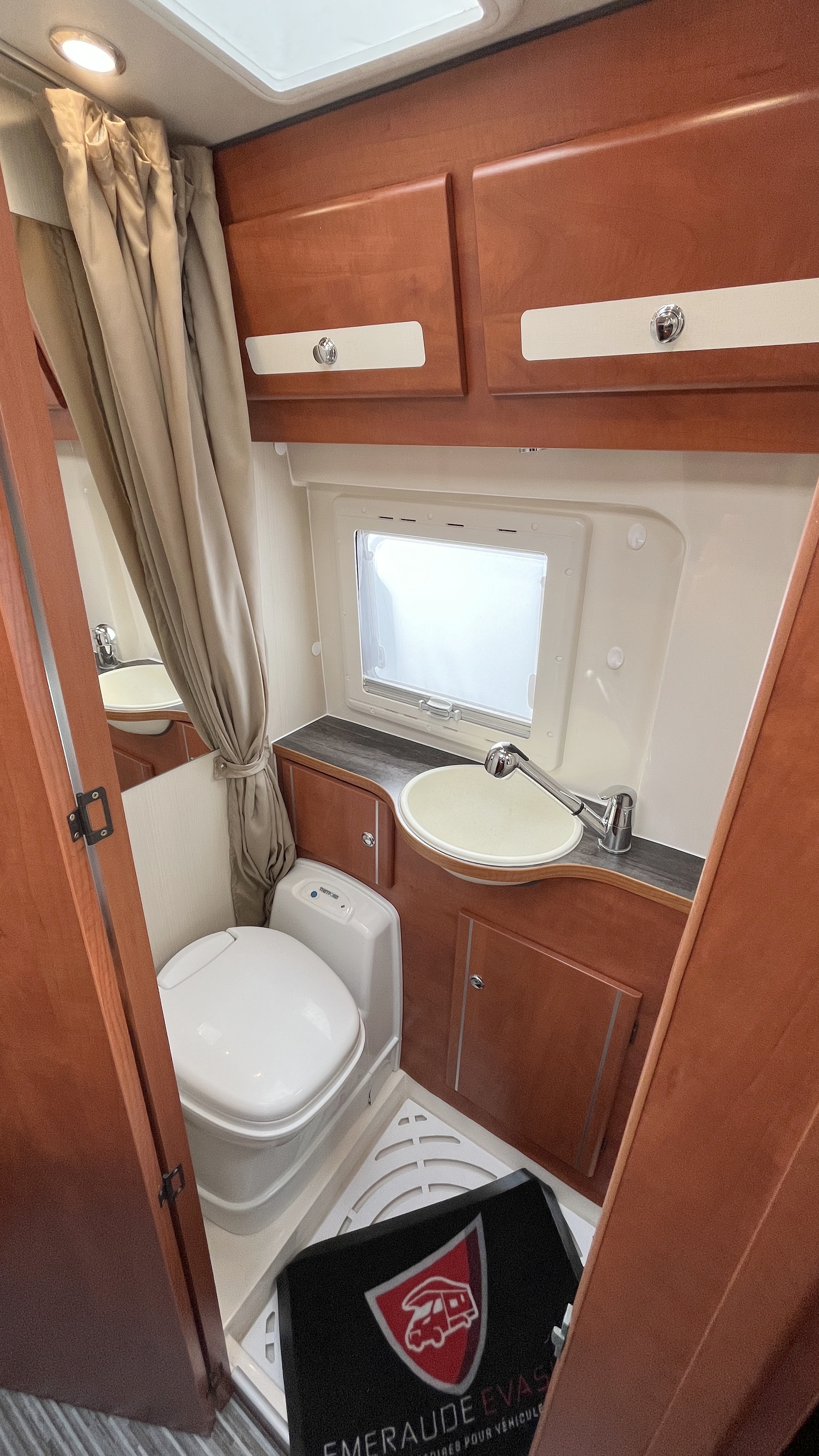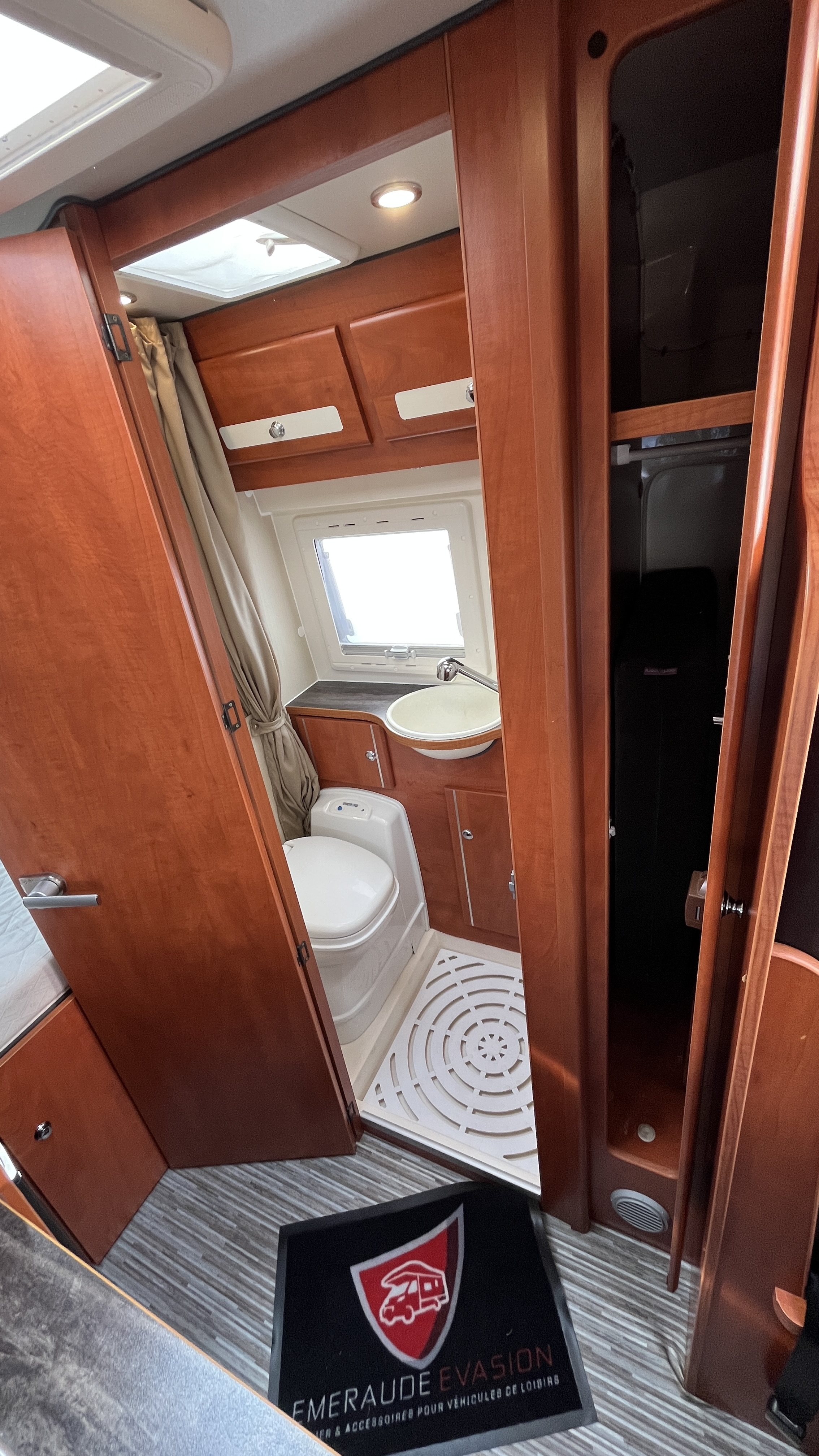 Le véhicule dispose également d’un cabinet de toilette complet avec douche et WC, apportant un vrai confort au quotidien.