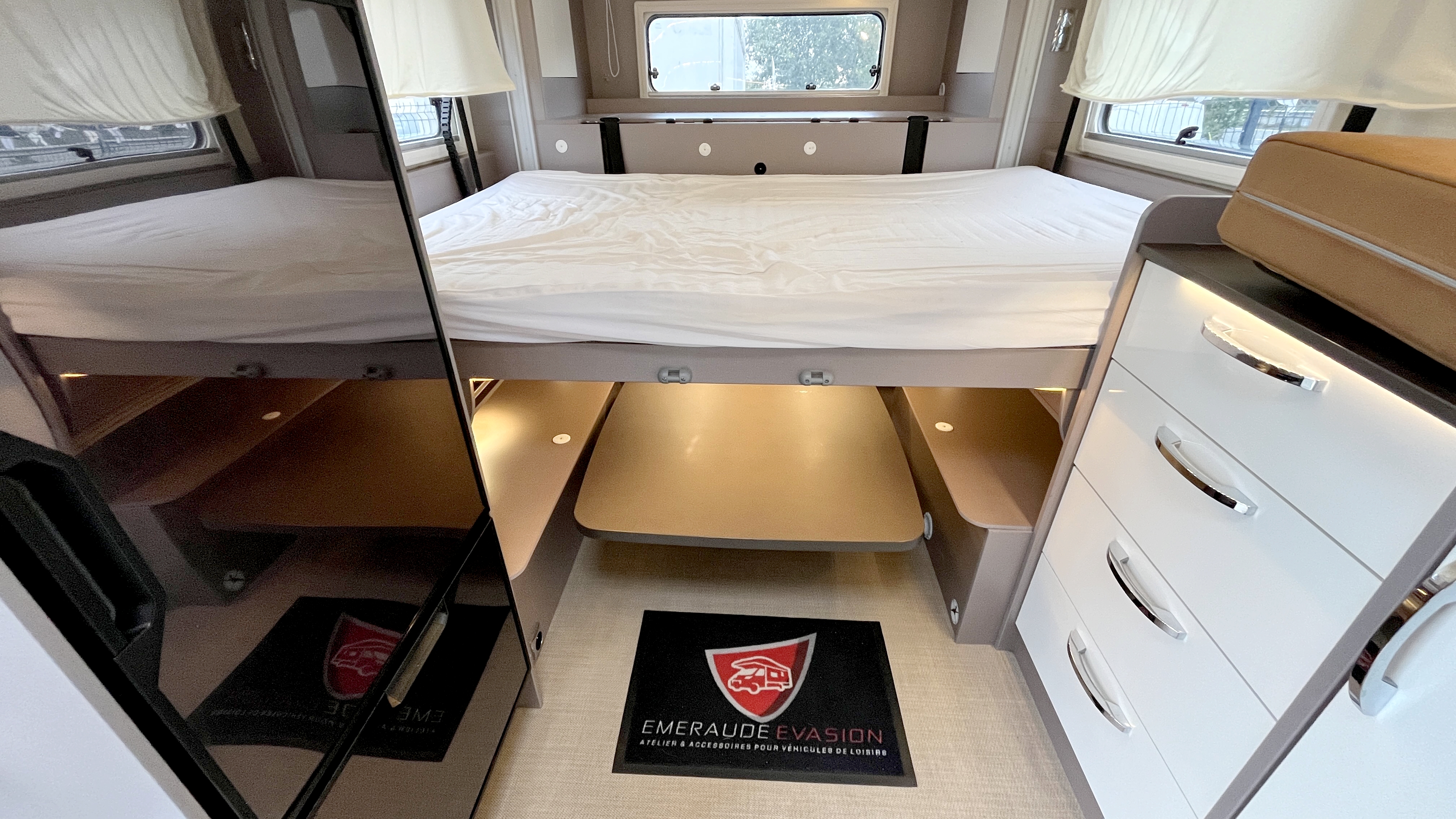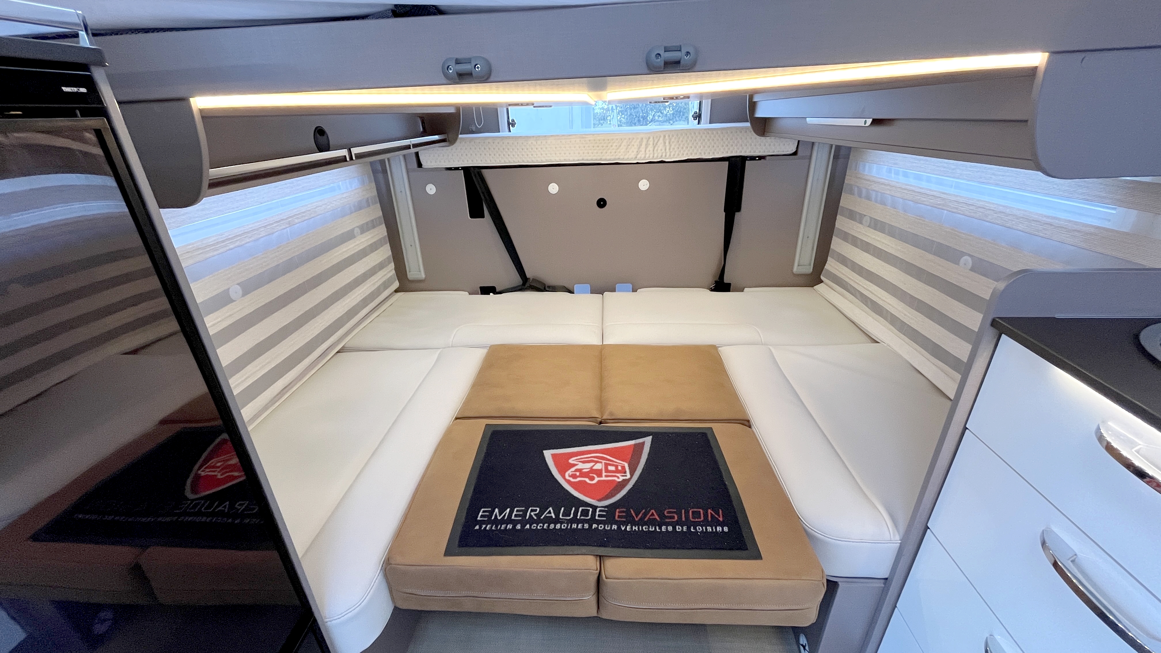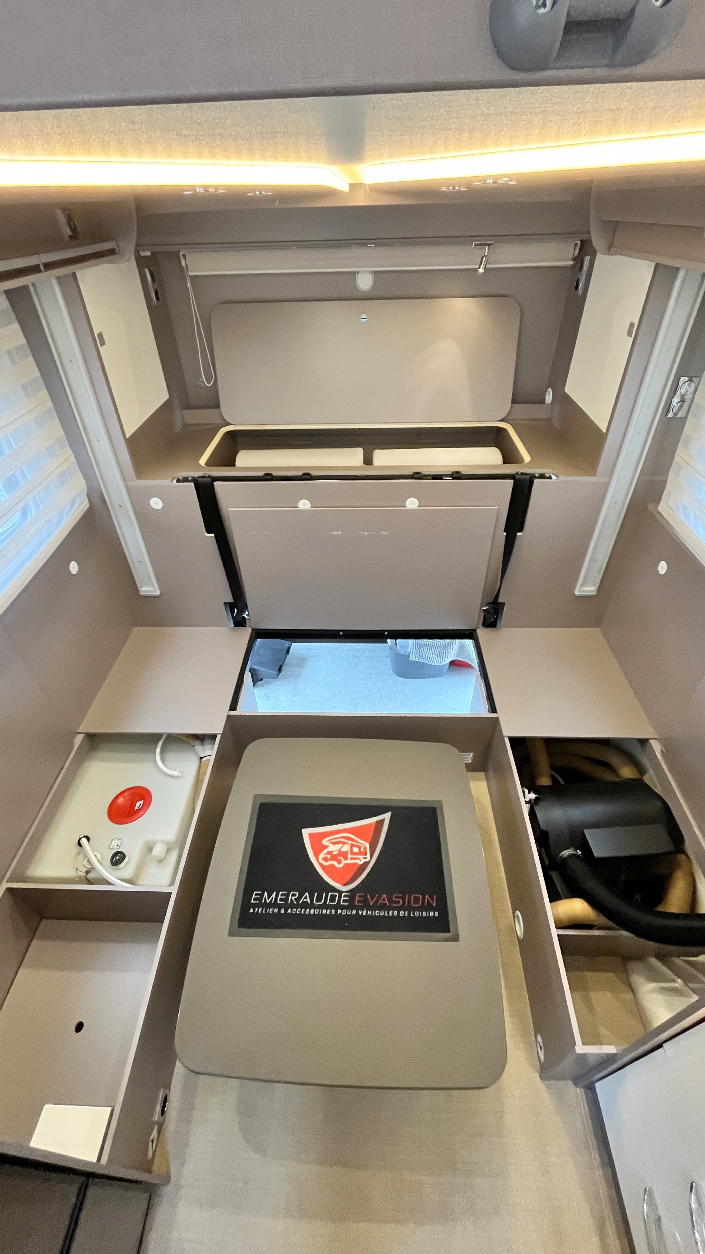 Le double plancher technique isolé, chauffé et continu est un allié de choix : la combinaison du sous-plancher et du plancher continu avec un espace intermédiaire assure une isolation optimale pour un climat intérieur toujours agréable, que vous passiez vos vacances dans des endroits chauds ou froids. Ce système profite également aux installations dans le camping-car. En effet, les conduites, les tuyaux, les réservoirs d’eau et autres se trouvant dans le plancher intermédiaire, ils sont ainsi protégés du gel. Autre avantage : ce double plancher de plain-pied couvre tout le véhicule sans aucune marche.