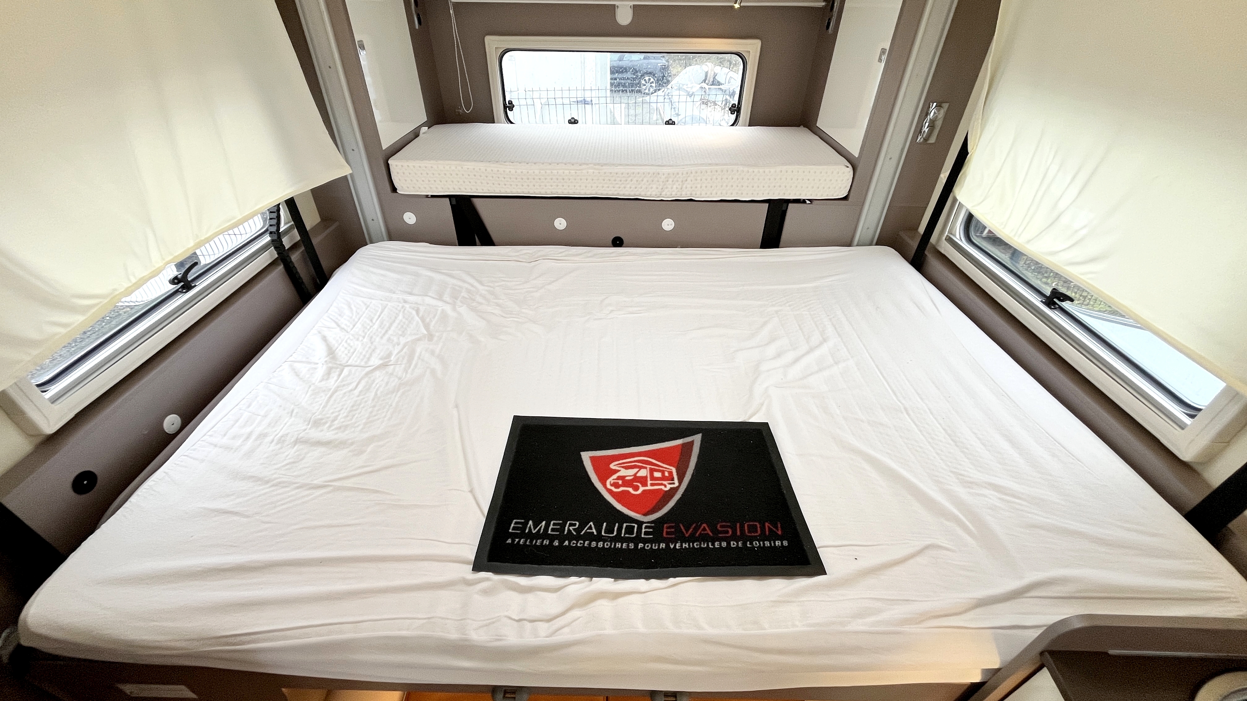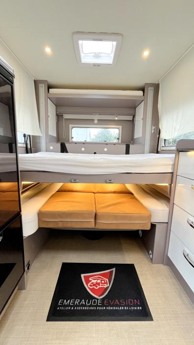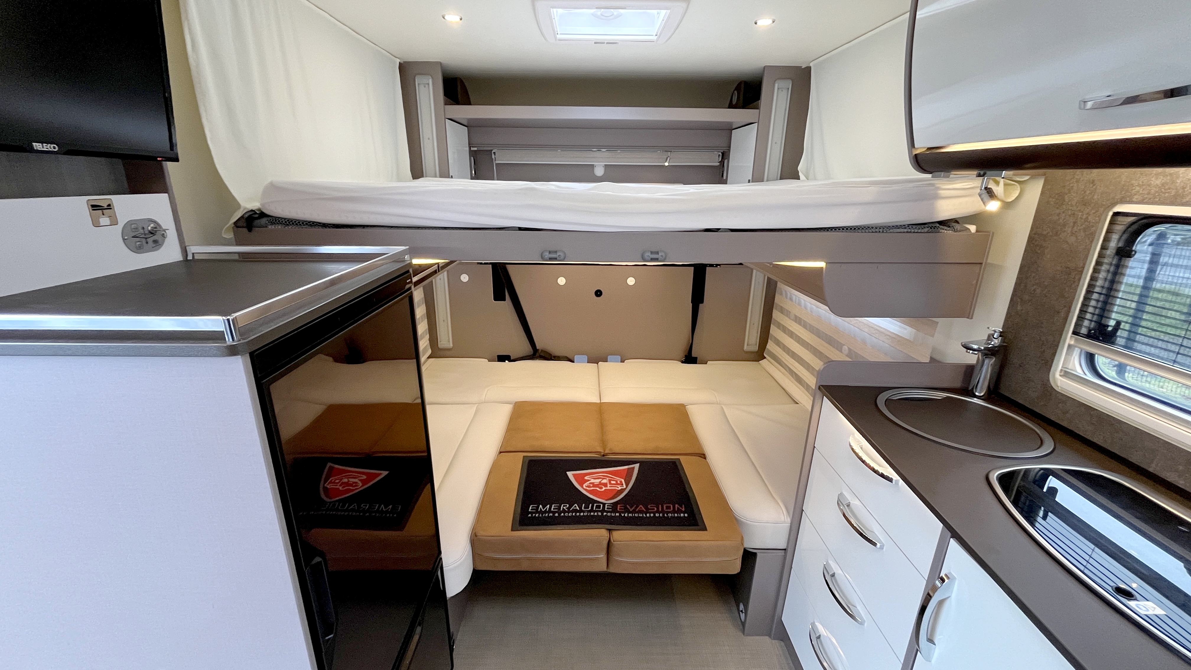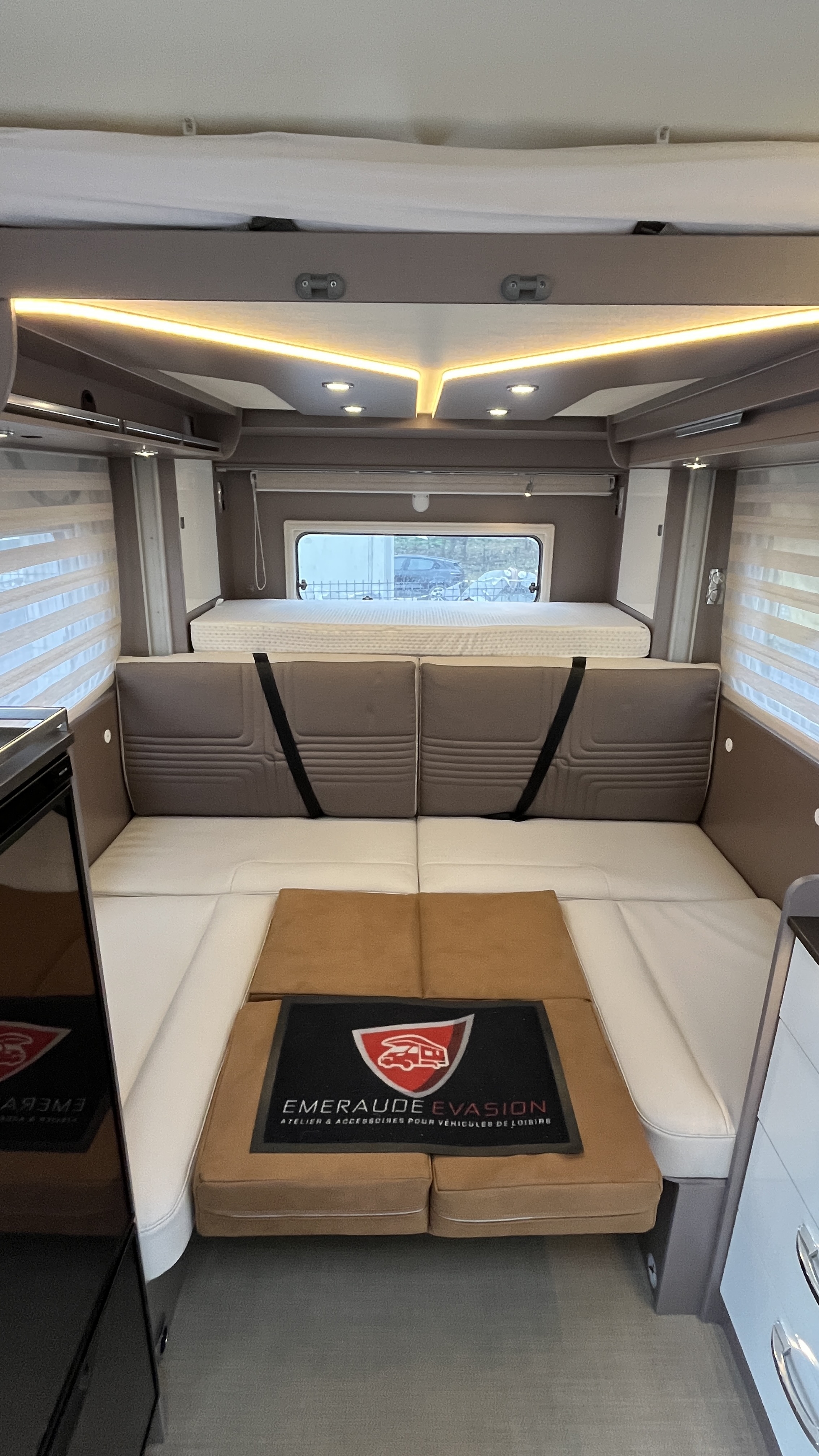 Avec son grand salon et ses trois banquettes en U, vous profiterez d'un espace convivial et confortable pour partager des moments de détente et de complicité. Se réunir autour de la table pour un dîner, préparé grâce à sa cuisine 3 feux, parfaite pour concocter de délicieux repas comme à la maison. Jusqu'à 5 couchages possibles : un lit double ou king size de pavillon électrique, avec hauteur d'accès sans échelle de seulement 77 cm, et/ou un lit d'appoint sur soute arrière : Il vous suffit de vous endormir sur les matelas en mousse haute résilience coulée à froid multizones, qui peut s’installer en longueur ou en version transversale. Grâce à l’extension de couchage, vous agrandissez le lit en un tournemain. Le tout complété par un lit double sur dinette qui permet de s'y installer lui aussi sans échelle. Ce modèle allie parfaitement confort et praticité, avec sa douche à paroi rigide séparée de la salle de bain et son WC ou encore sa grande soute arrière double accès avec safe-door, accessible de l'intérieur.