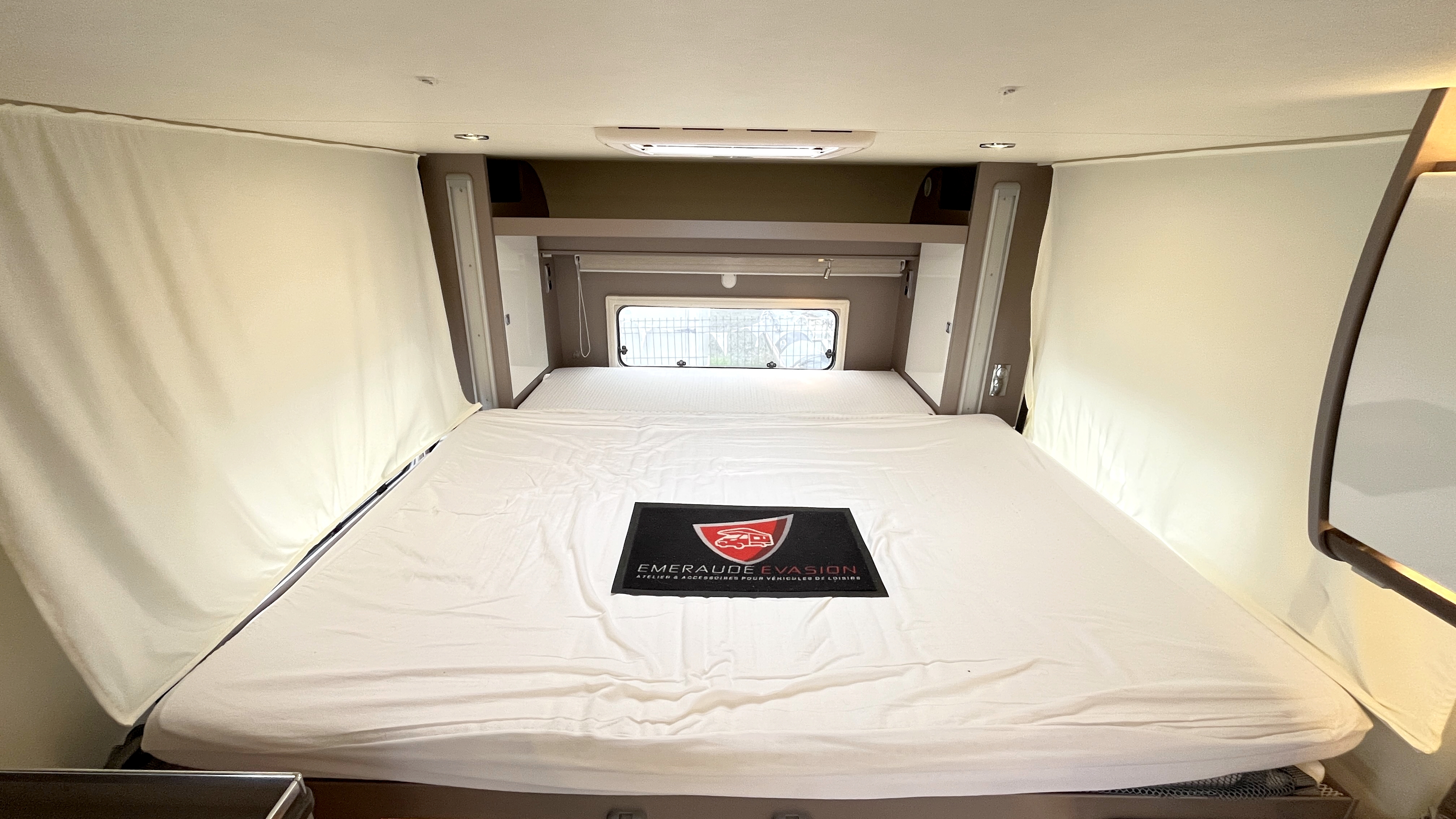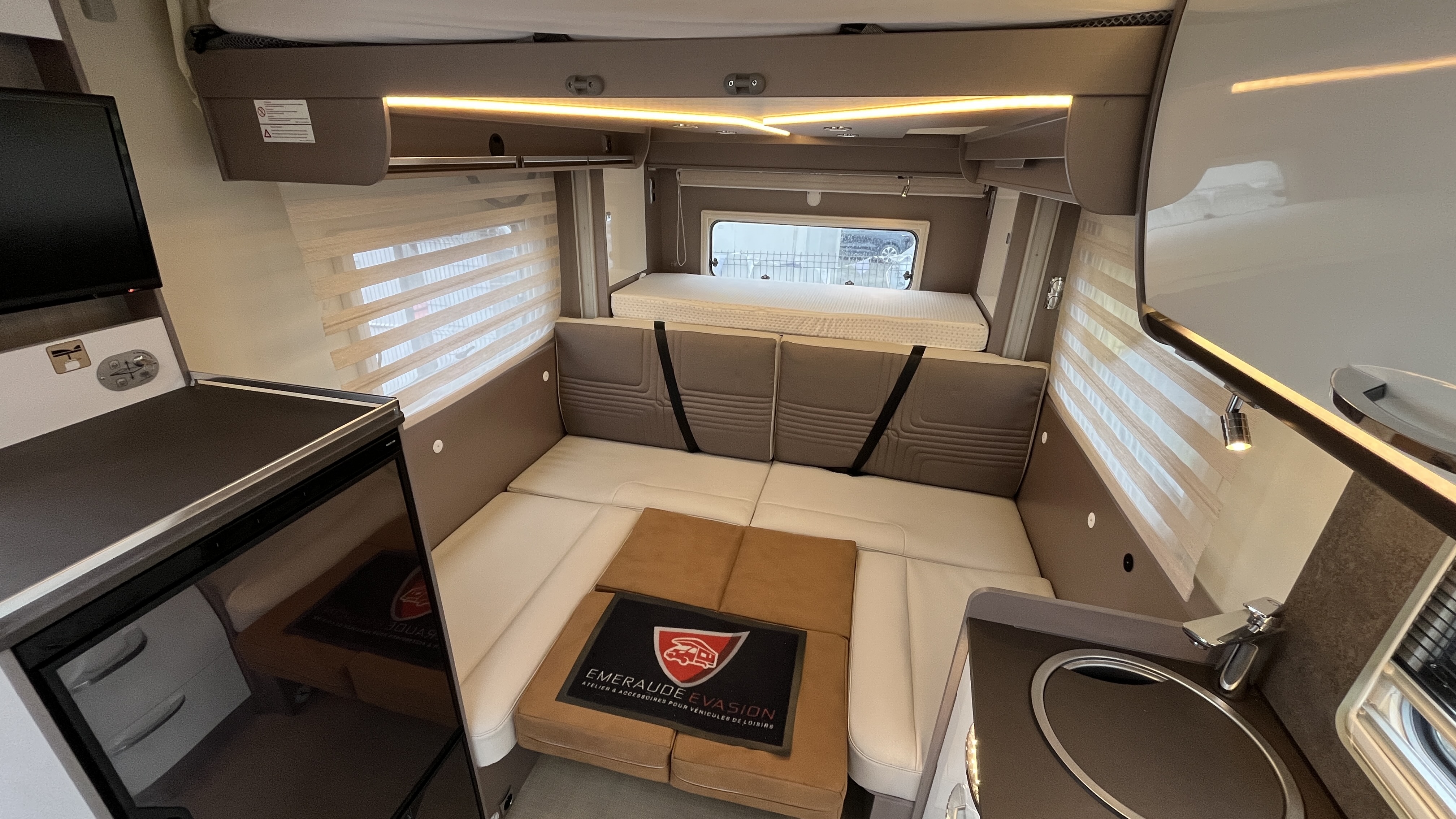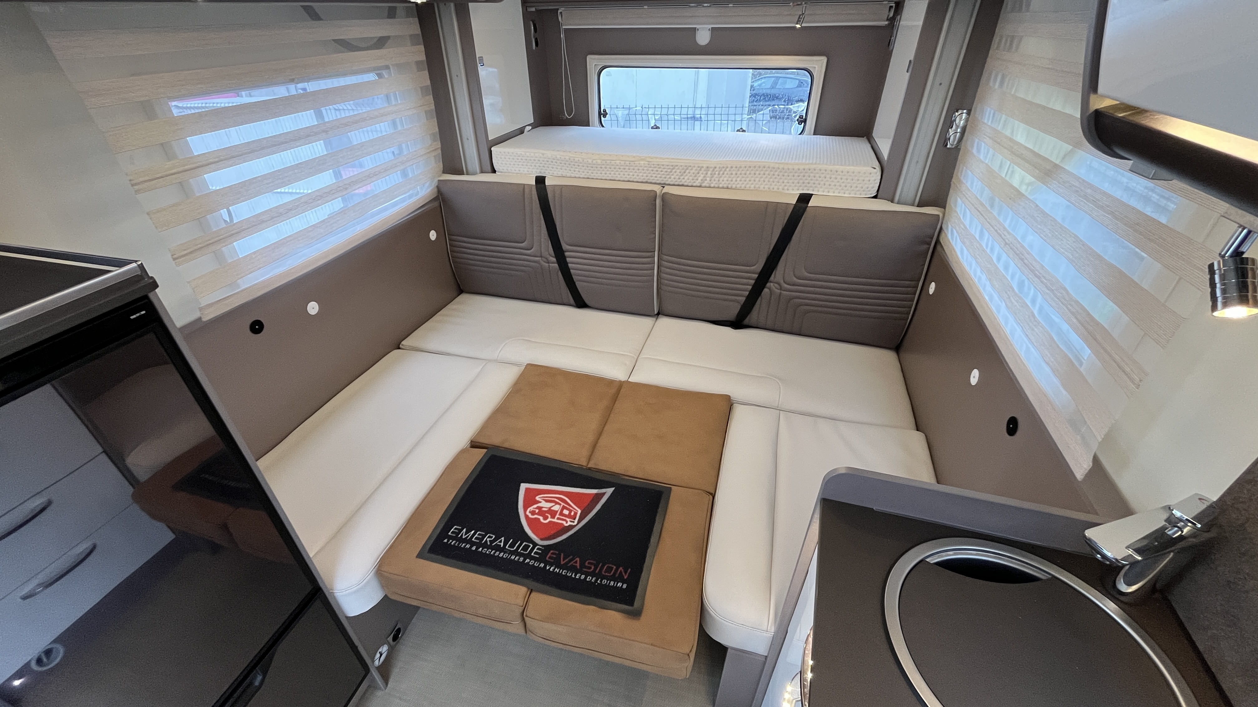 IntérieurSellerie Simili Cuir / Tissu Catania Pure - Mobilier BahiaFrigoAutomatiqueFrigoGrandÉclairage ledsRéseau teleType d'antenneSatellite autoPrise USBRideaux plissesLit principalLit centralDimensions138x205 - 205x255 cmLit secondaireLit dinetteDimensions138x205 cmLit tertiaireLit dinetteDimensions67x185 cmCaméra de reculeGPSRégulateur de vitesseCombi chauffe-eau / chauffage gazDouble plancher
