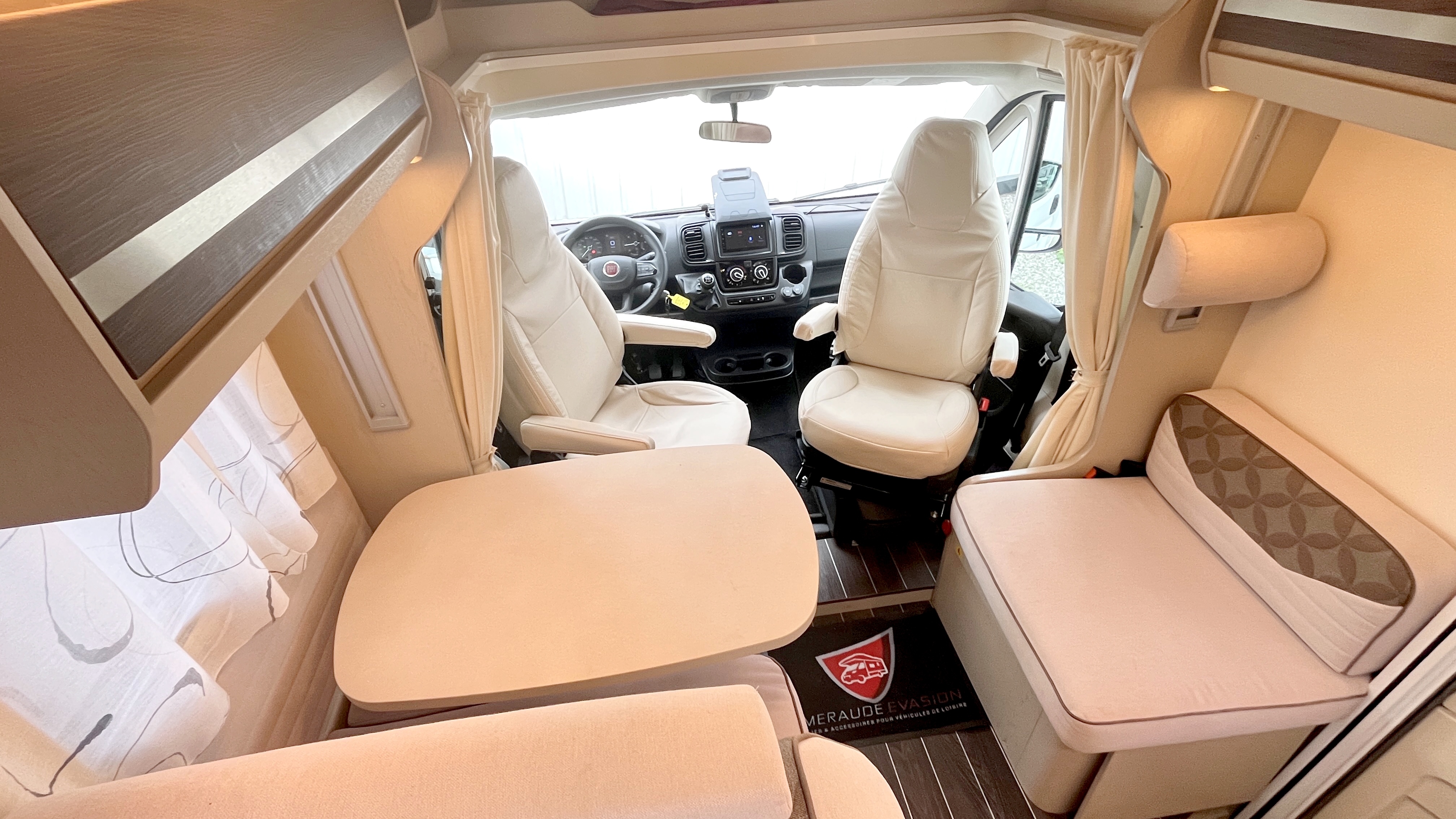 Retrouvez une bonne qualité de fabrication, un intérieur moderne et convivial, de nombreux espaces de rangement. Ce modèle se distingue par une belle luminosité : les tons clairs du mobilier et des tissus lui offrent de la clarté : sellerie aux revêtements simili et microfibre beige résistants, lavables et déperlants, associés à des placages aux motifs modernes. Le sol tranche avec un aspect parquet bois.