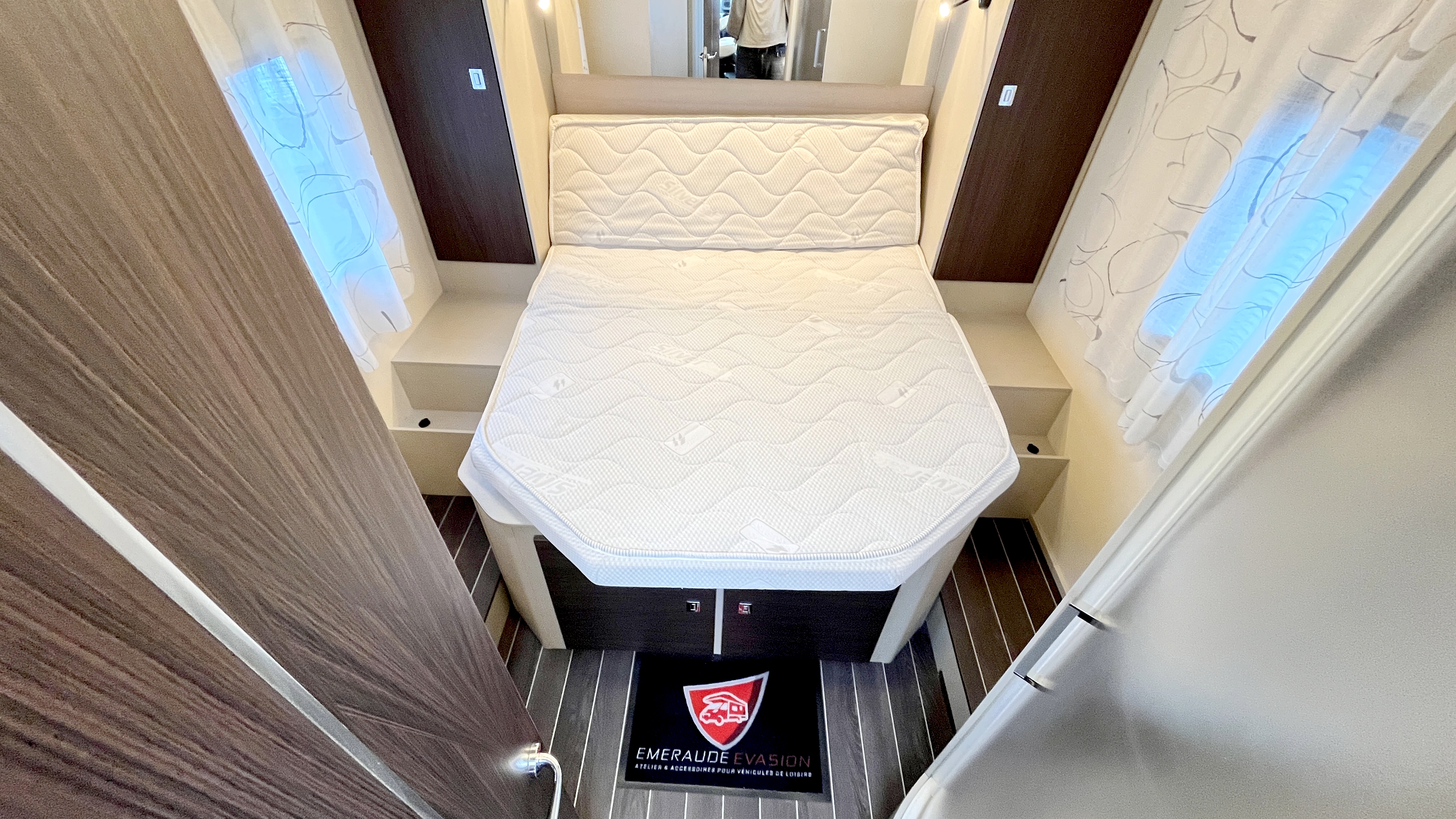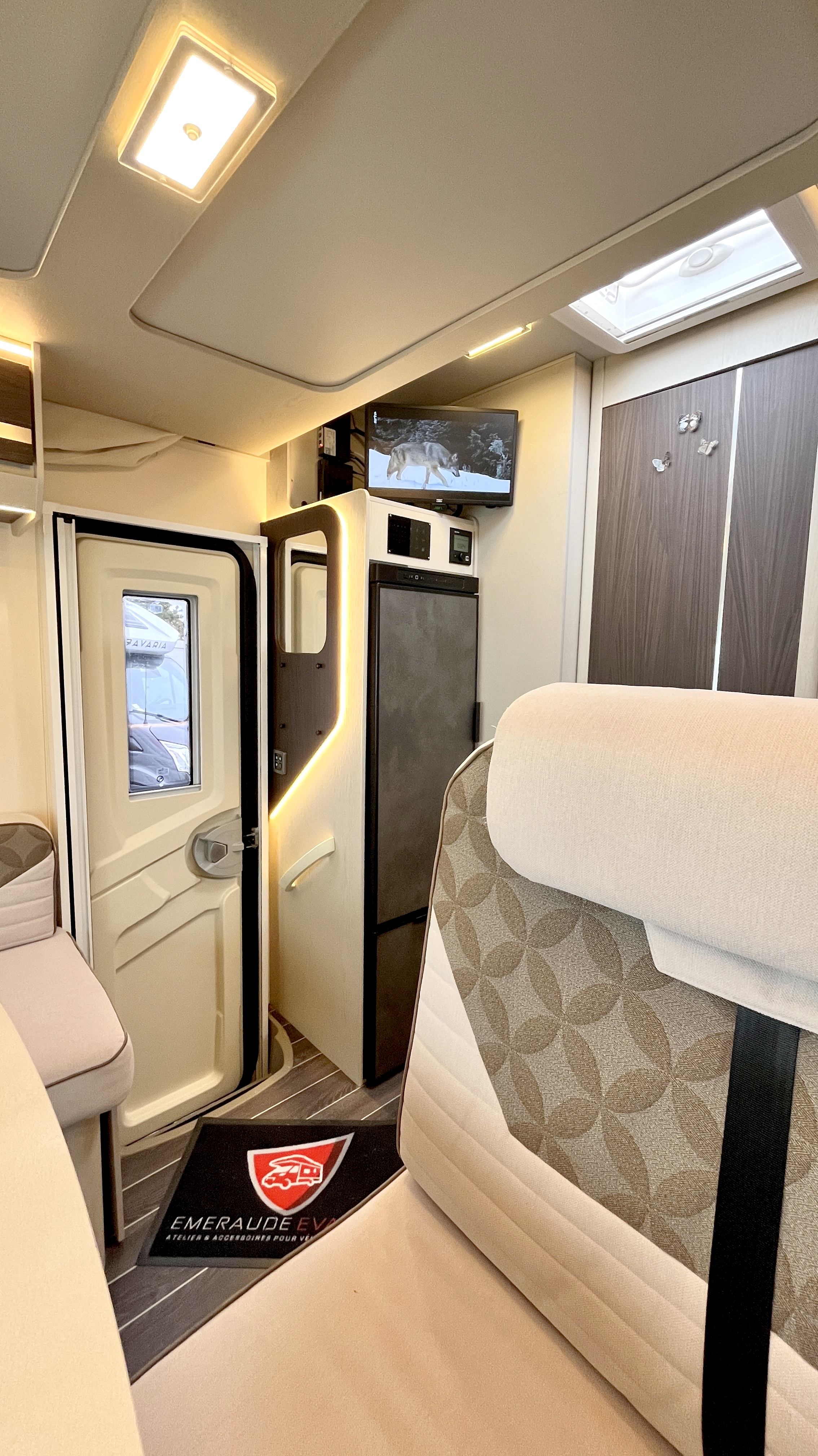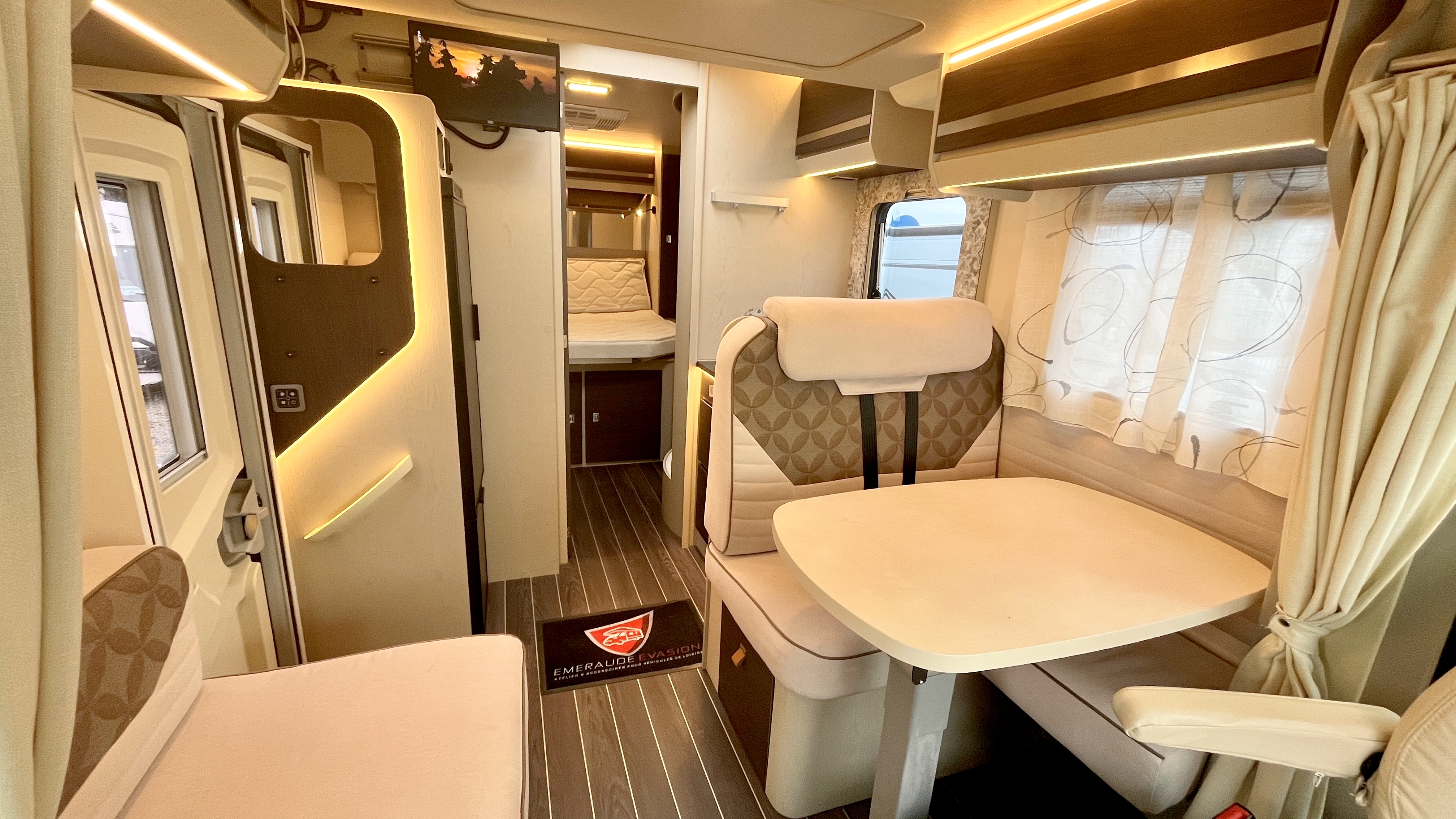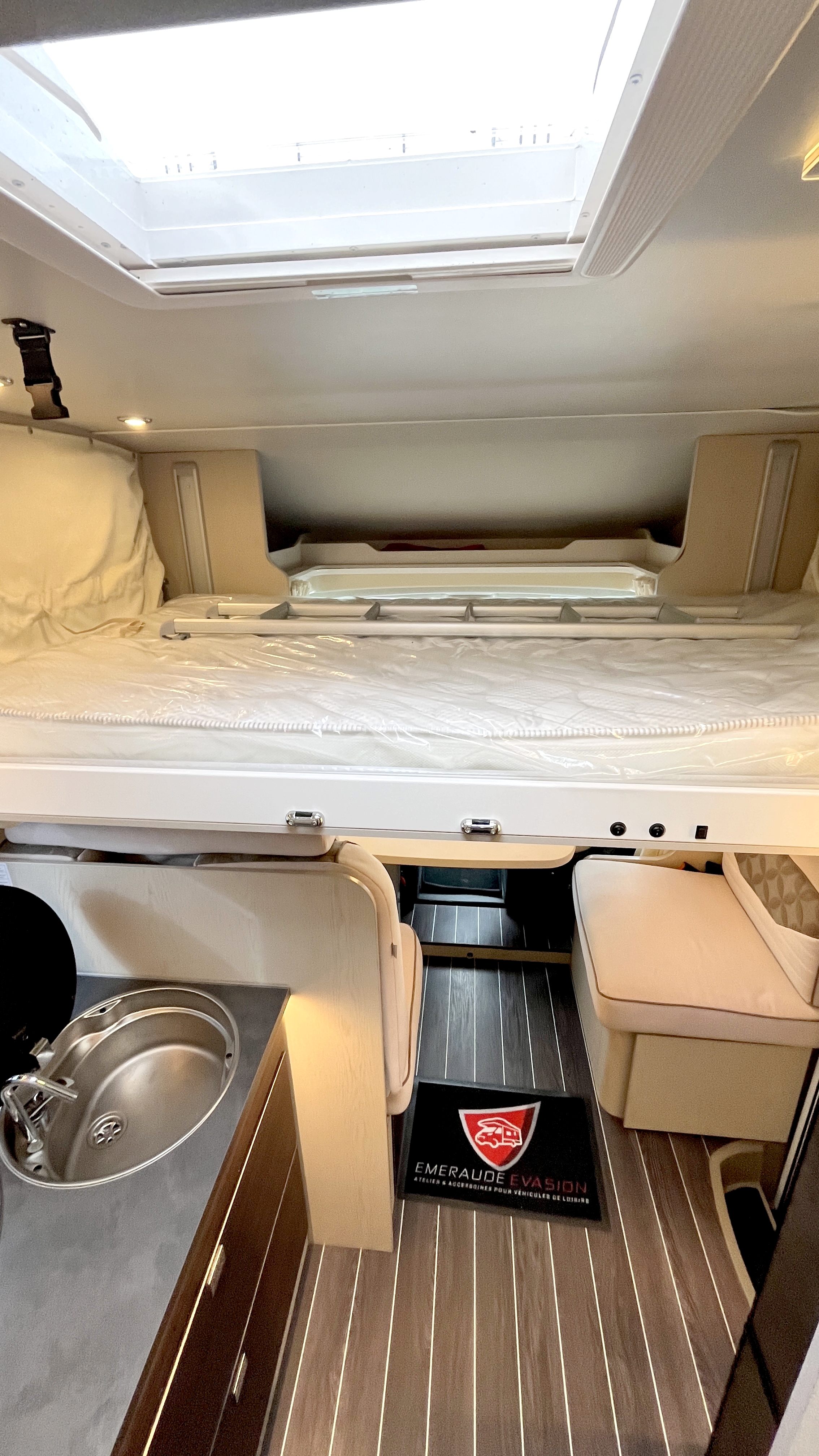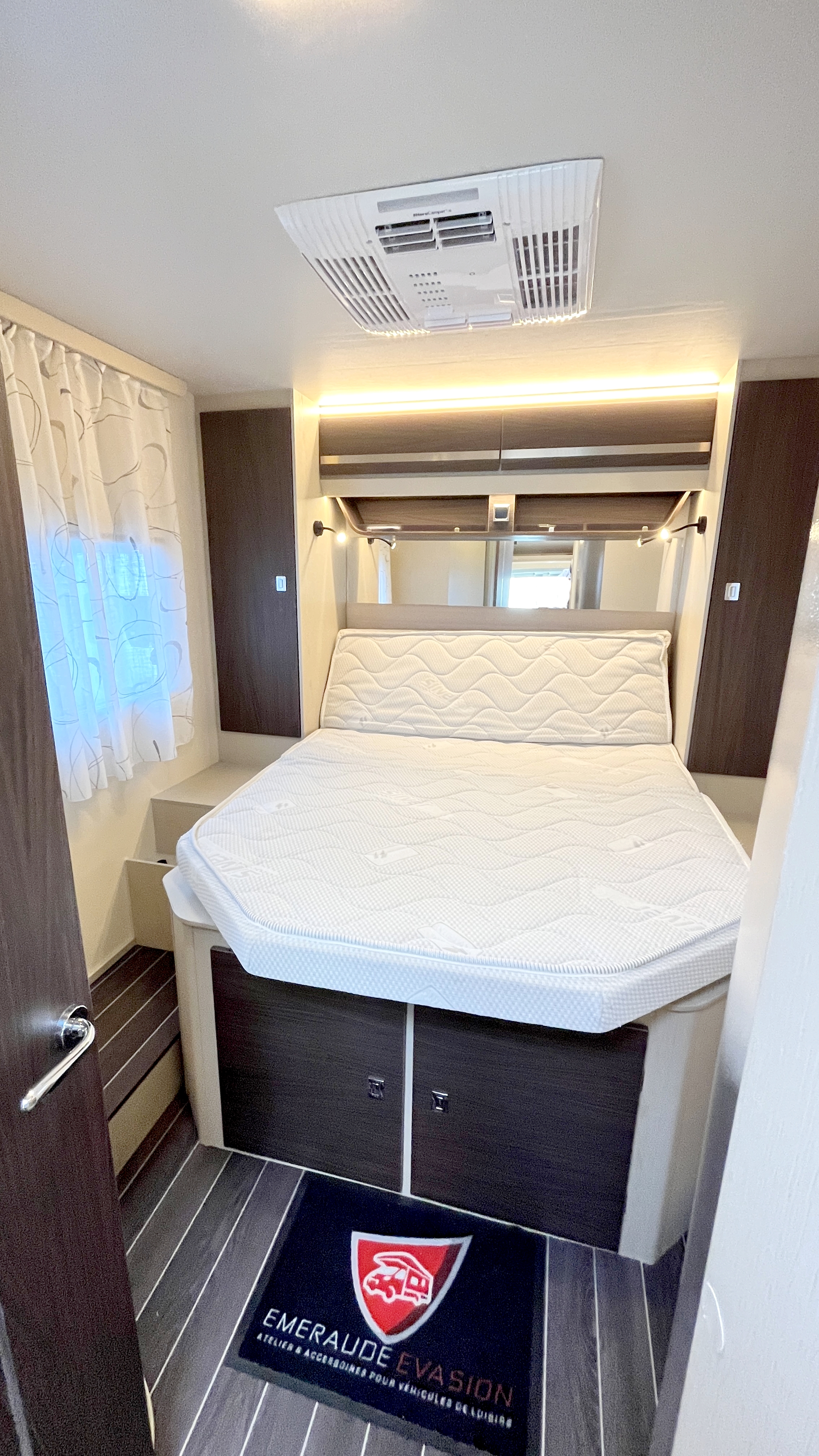 En plus d'un lit de pavillon électrique, d'un lit dînette, il offre une chambre à coucher arrière à lit central inclinable, pour bénéficier d'un volume avec dégagement pour faciliter la circulation et l'accès à la salle de bain traversante. Cette dernière est composée d'une vaste douche à paroi rigide d'un côté, et d'un lavabo/WC de l'autre. La cuisine avec l'indispensable grand réfrigérateur débouche sur un large salon équipé de prises USB et d'une TV à antenne satellite automatique, bien au chaud grâce au chauffage Truma gaz Combi 4000 watts. Profitez de sa soute garage avec double accès pour emporter et protéger vos vélos.