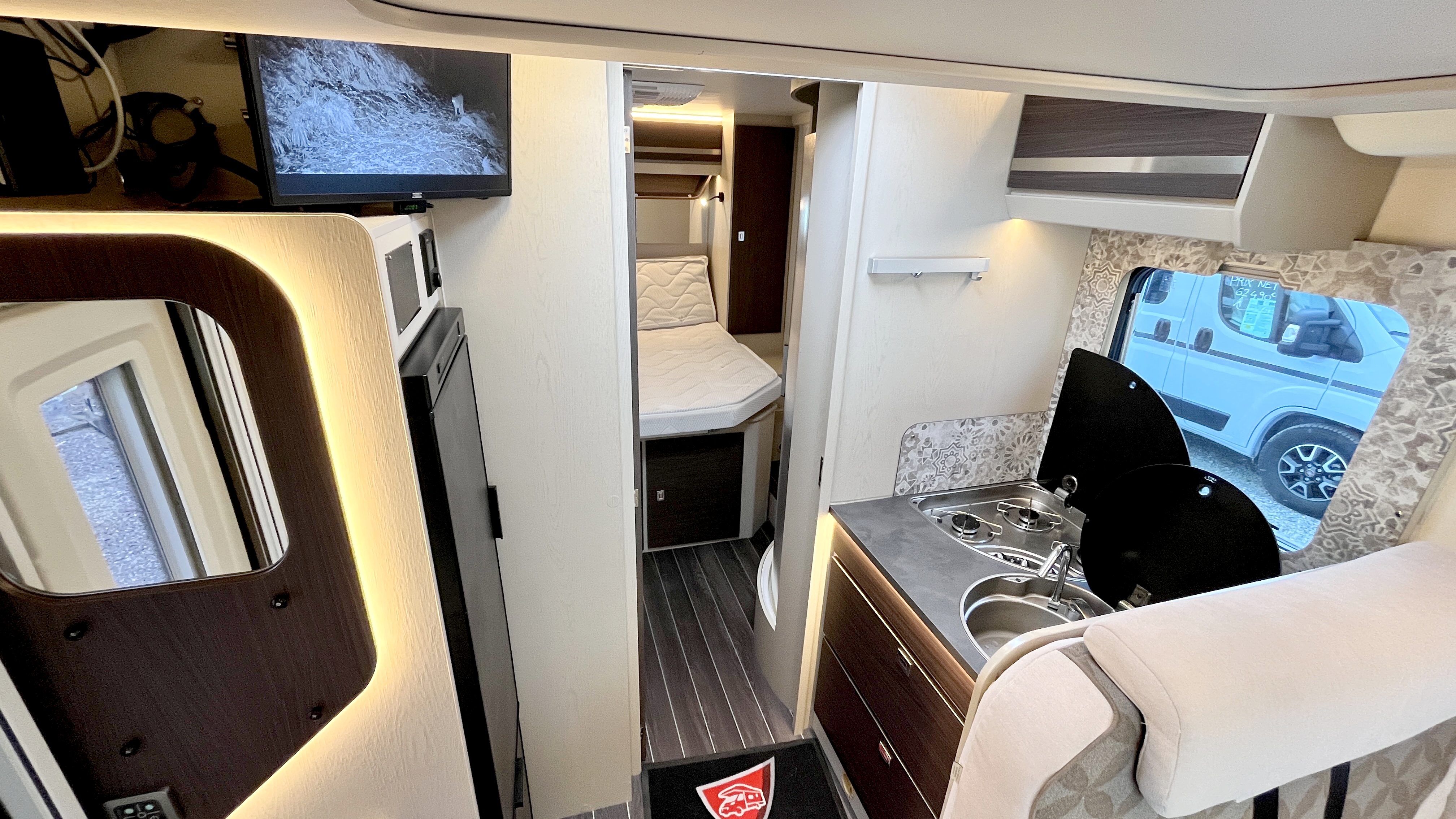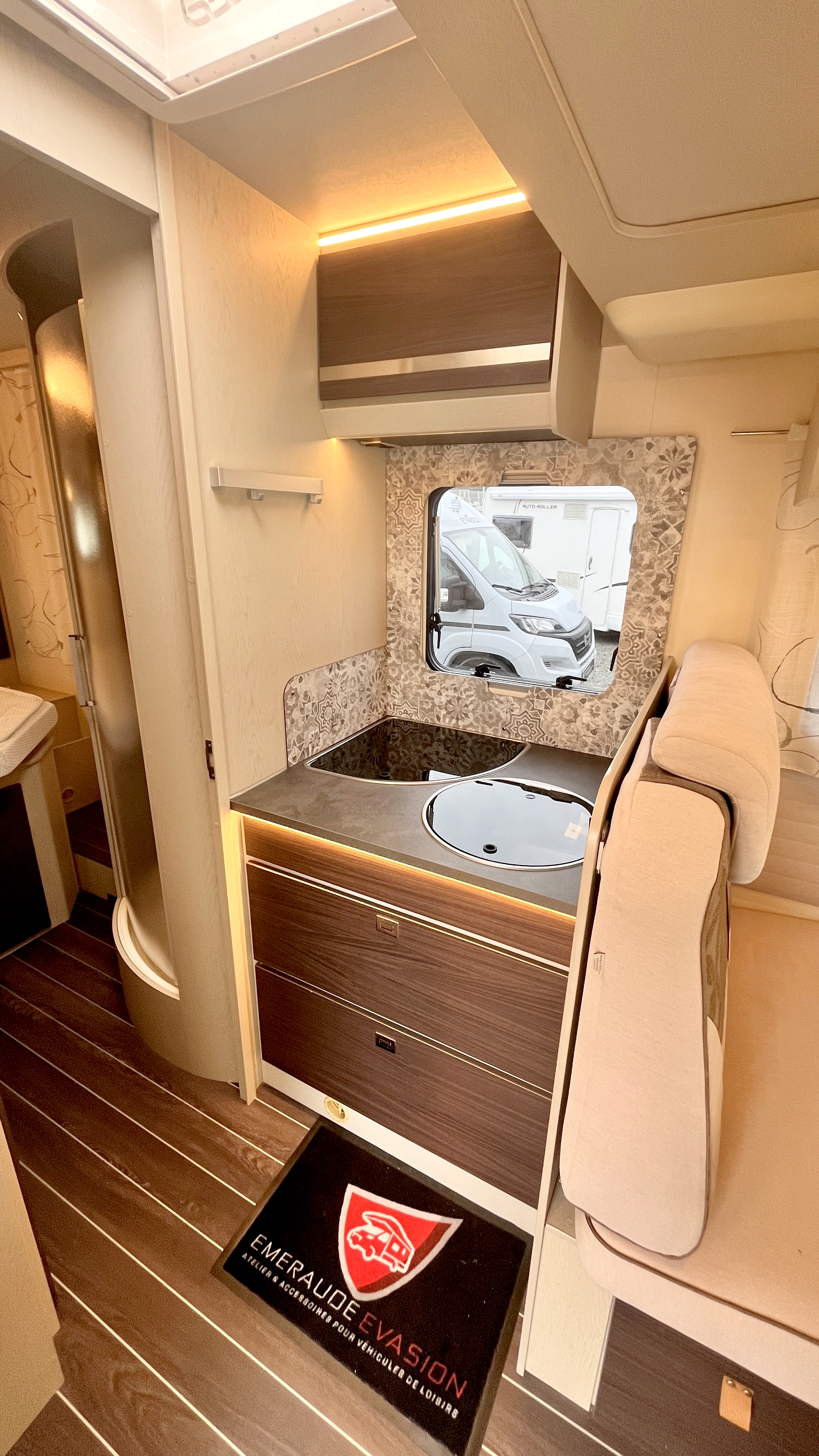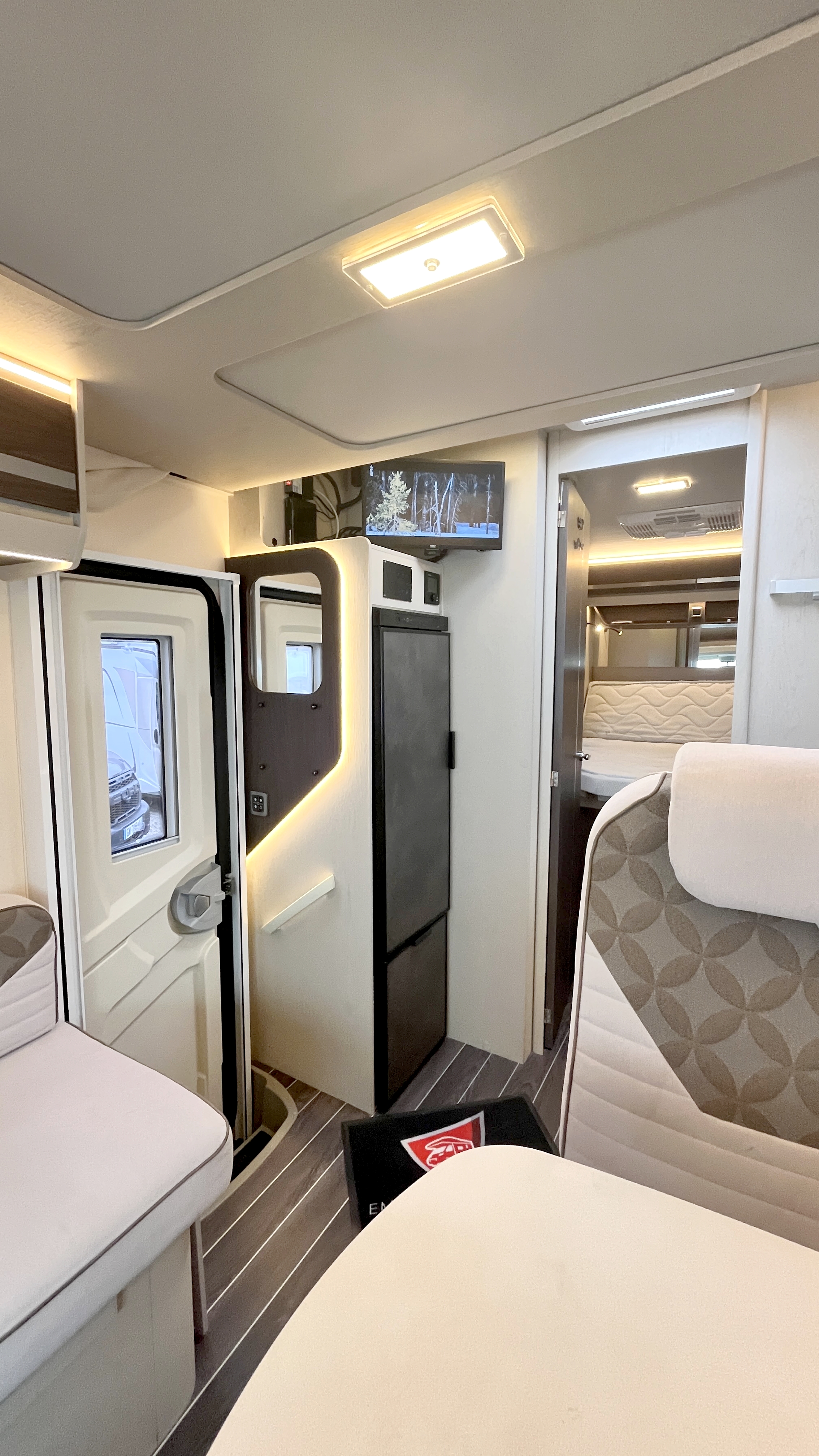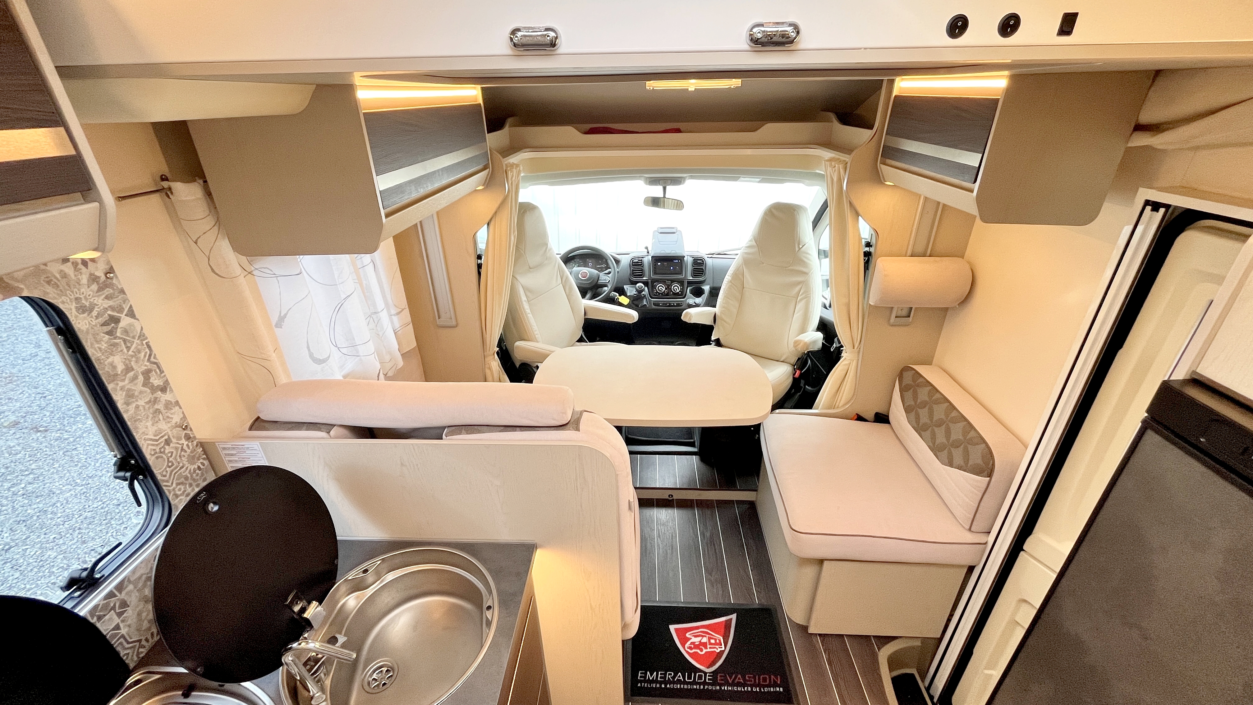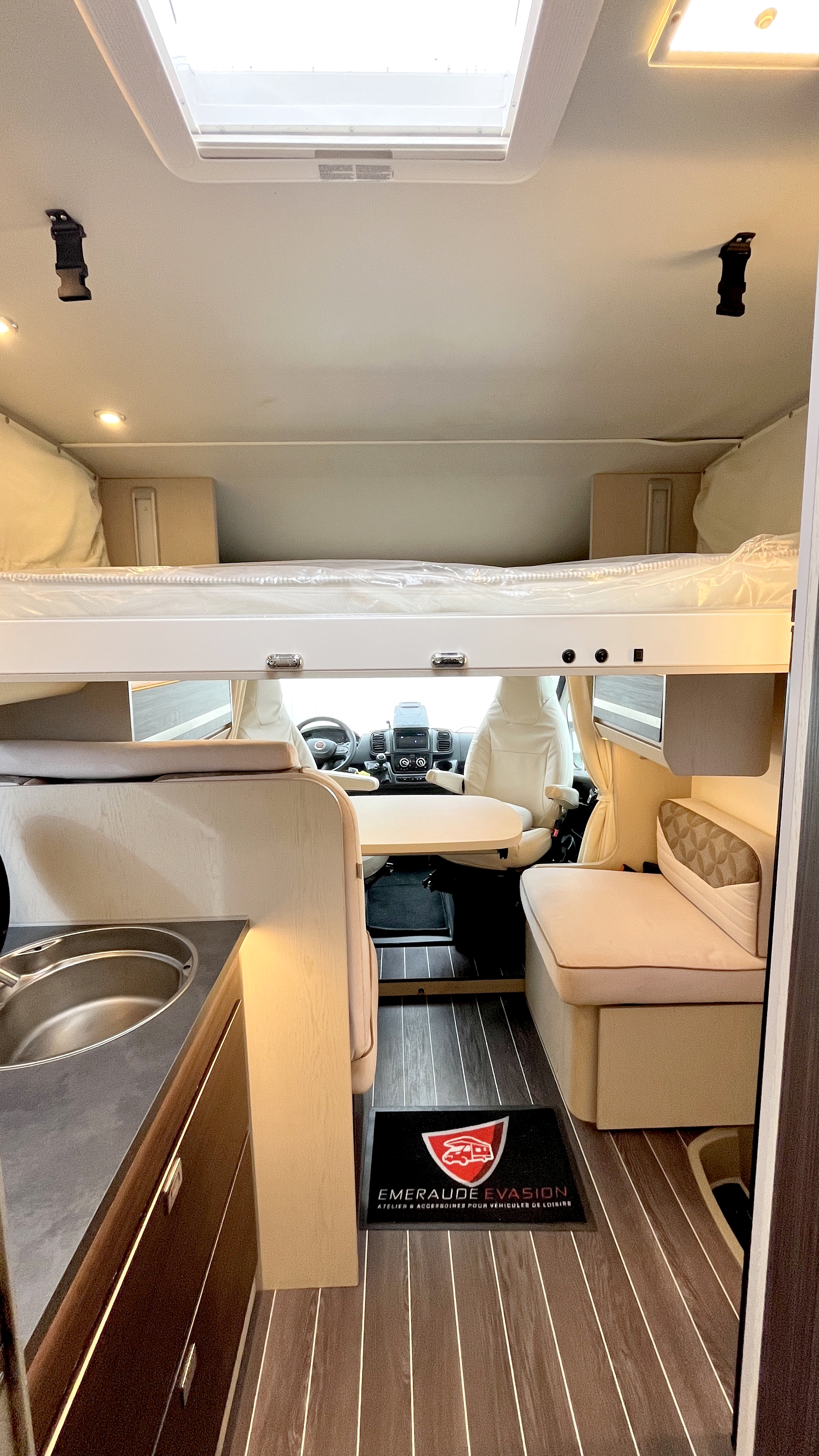 En plus d'un lit de pavillon électrique, d'un lit dînette, il offre une chambre à coucher arrière à lit central inclinable, pour bénéficier d'un volume avec dégagement pour faciliter la circulation et l'accès à la salle de bain traversante. Cette dernière est composée d'une vaste douche à paroi rigide d'un côté, et d'un lavabo/WC de l'autre. La cuisine avec l'indispensable grand réfrigérateur débouche sur un large salon équipé de prises USB et d'une TV à antenne satellite automatique, bien au chaud grâce au chauffage Truma gaz Combi 4000 watts. Profitez de sa soute garage avec double accès pour emporter et protéger vos vélos.