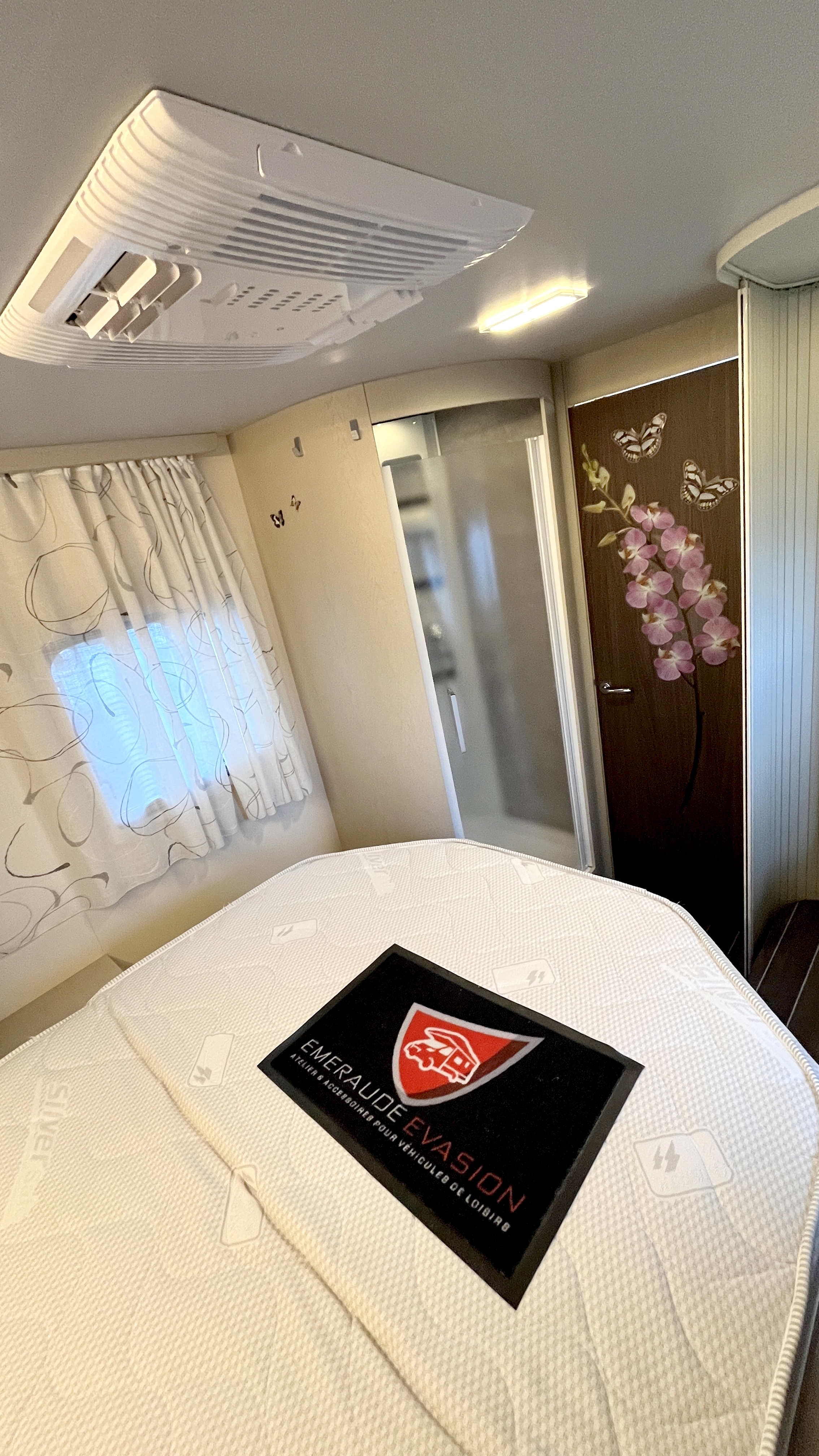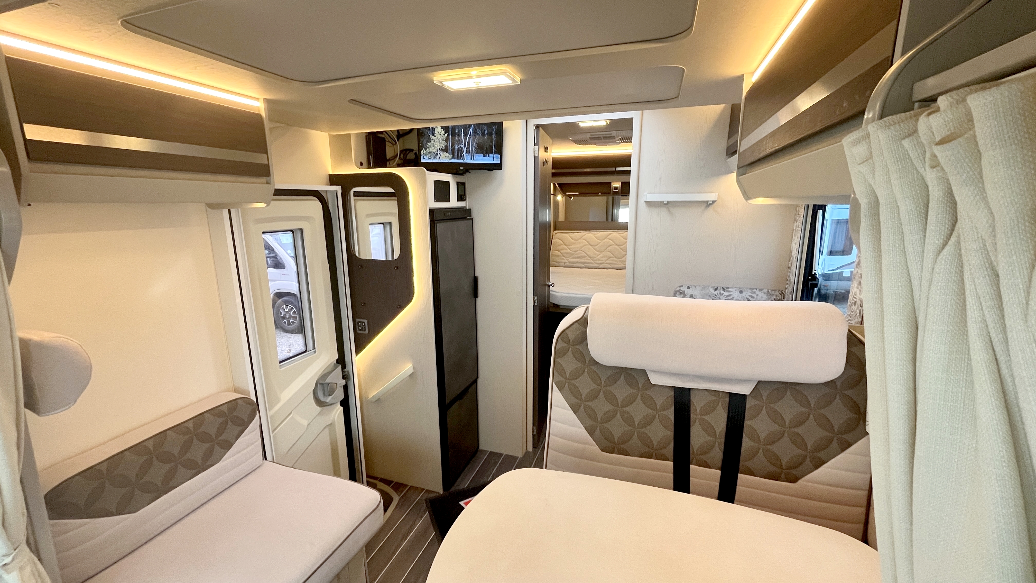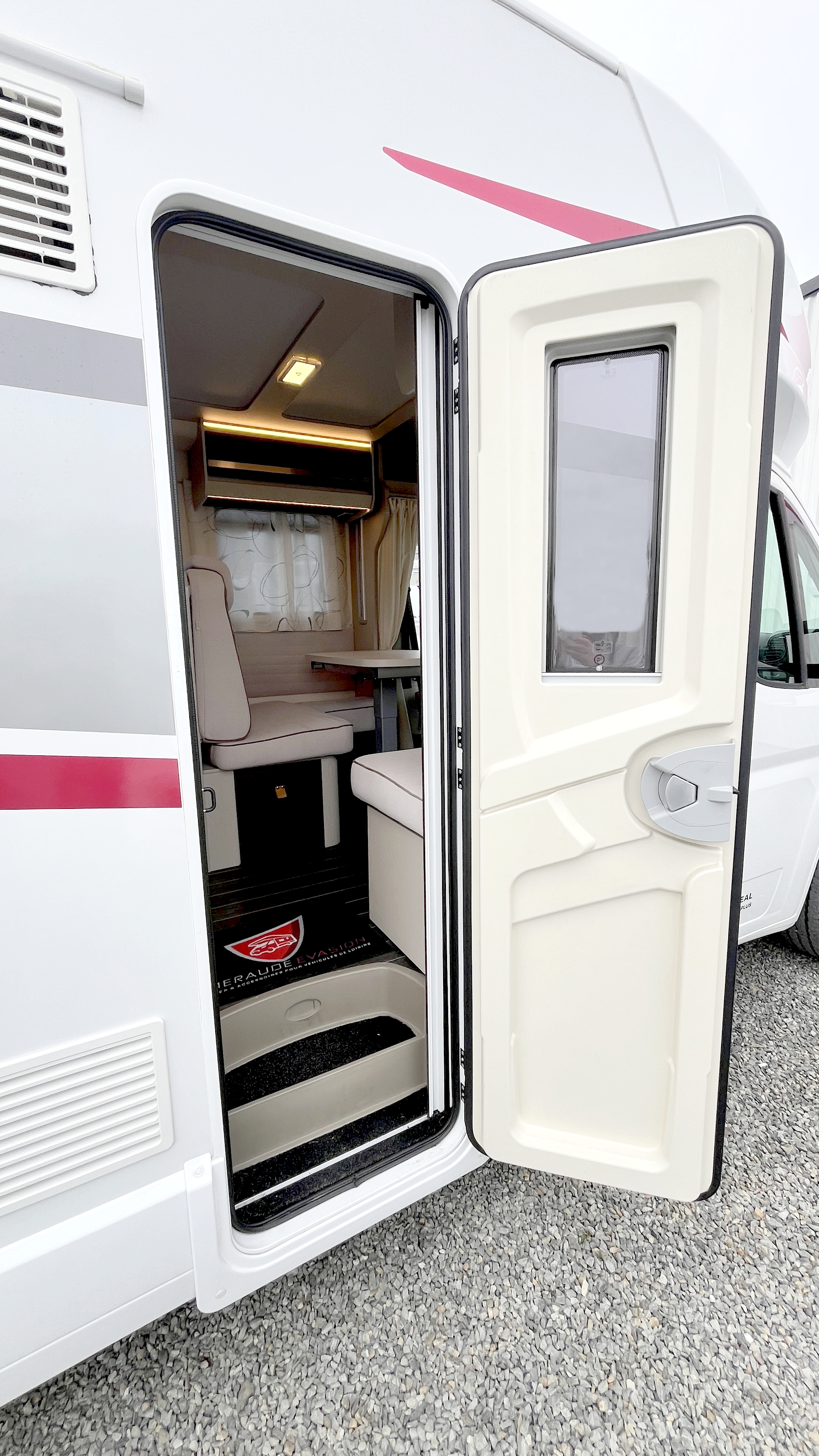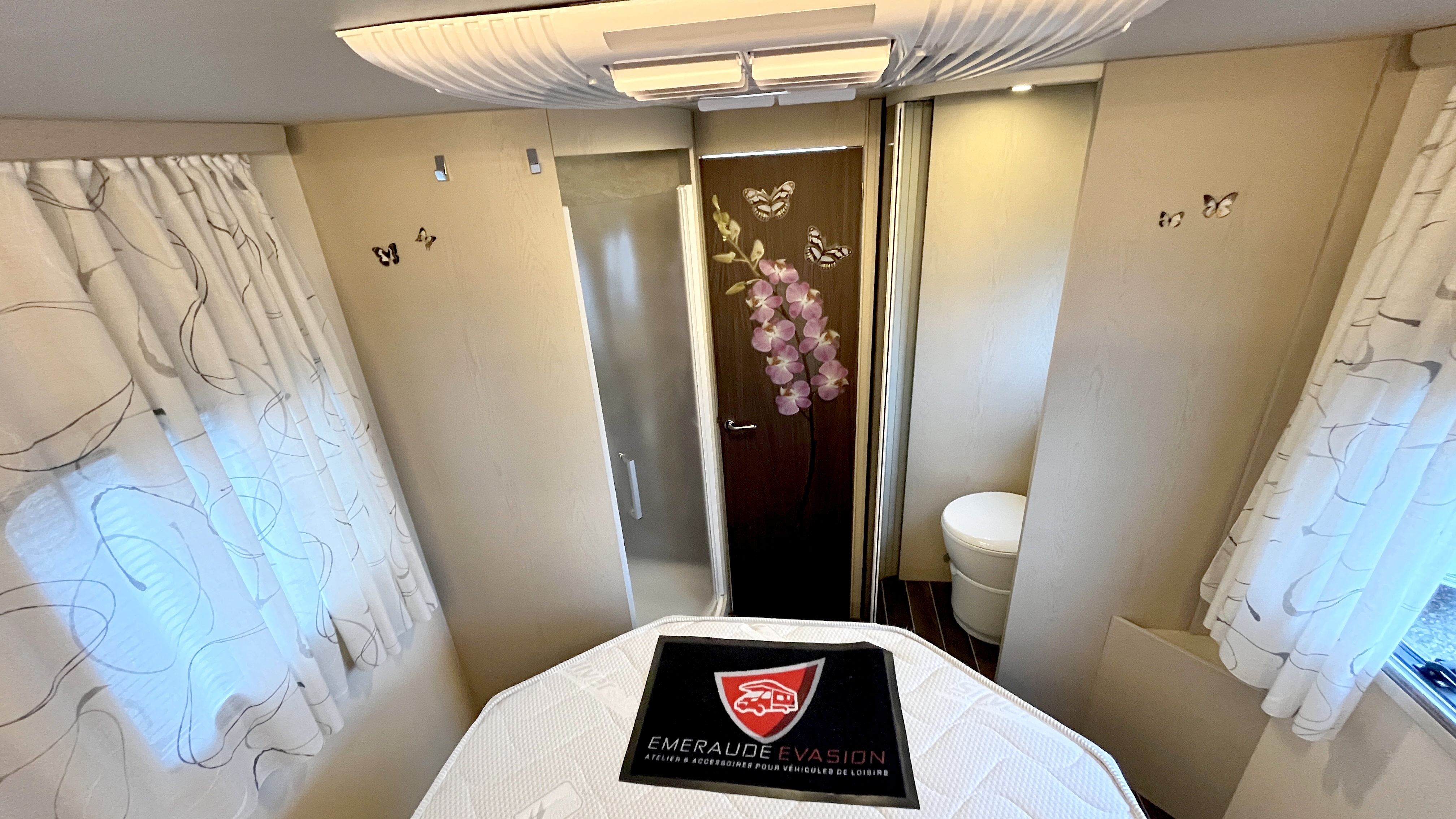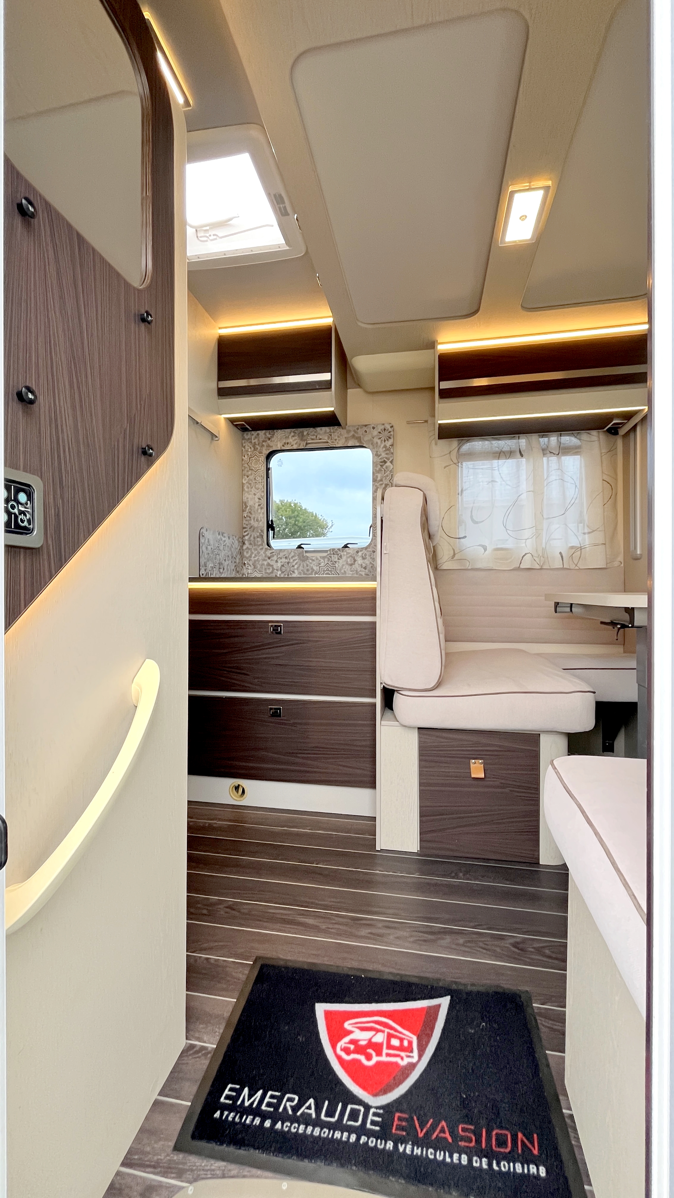 En plus d'un lit de pavillon électrique, d'un lit dînette, il offre une chambre à coucher arrière à lit central inclinable, pour bénéficier d'un volume avec dégagement pour faciliter la circulation et l'accès à la salle de bain traversante. Cette dernière est composée d'une vaste douche à paroi rigide d'un côté, et d'un lavabo/WC de l'autre. La cuisine avec l'indispensable grand réfrigérateur débouche sur un large salon équipé de prises USB et d'une TV à antenne satellite automatique, bien au chaud grâce au chauffage Truma gaz Combi 4000 watts. Profitez de sa soute garage avec double accès pour emporter et protéger vos vélos.