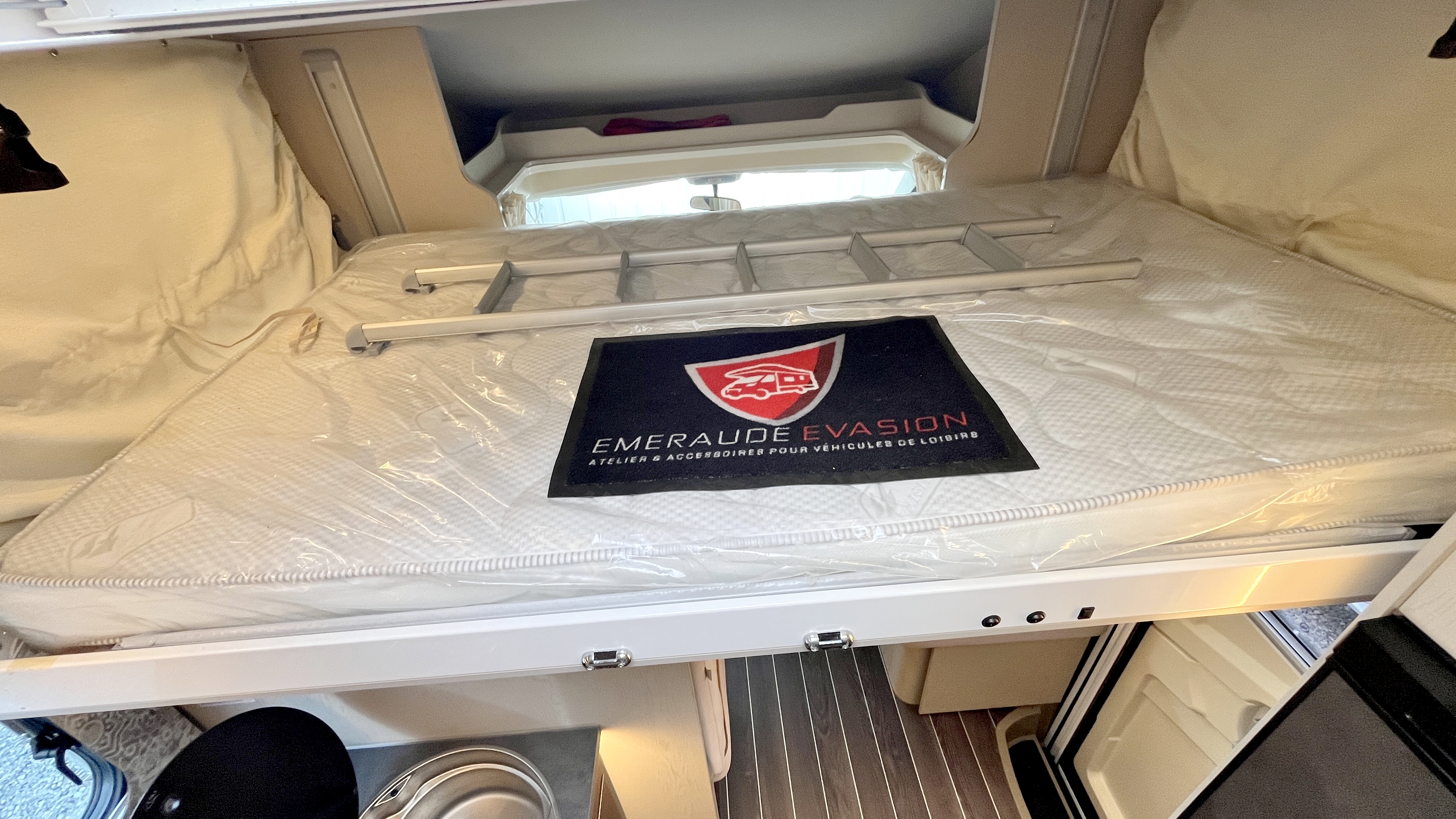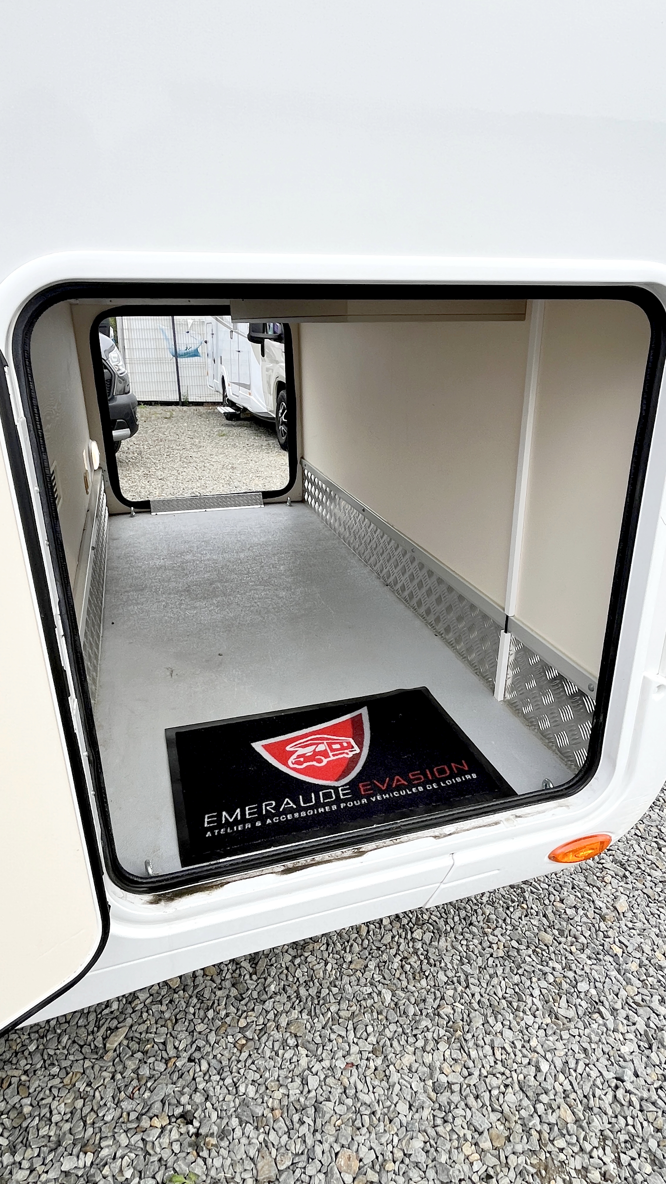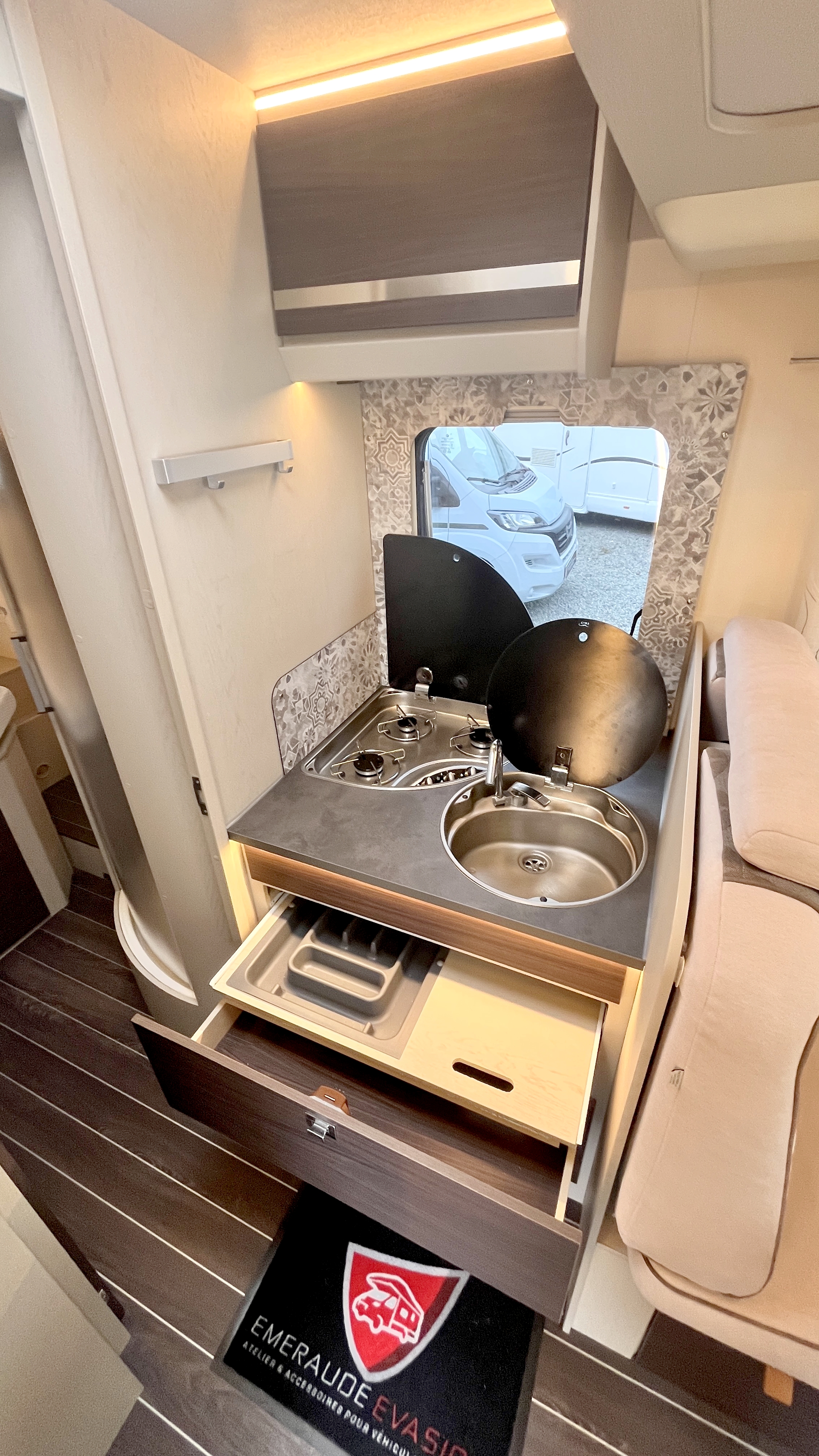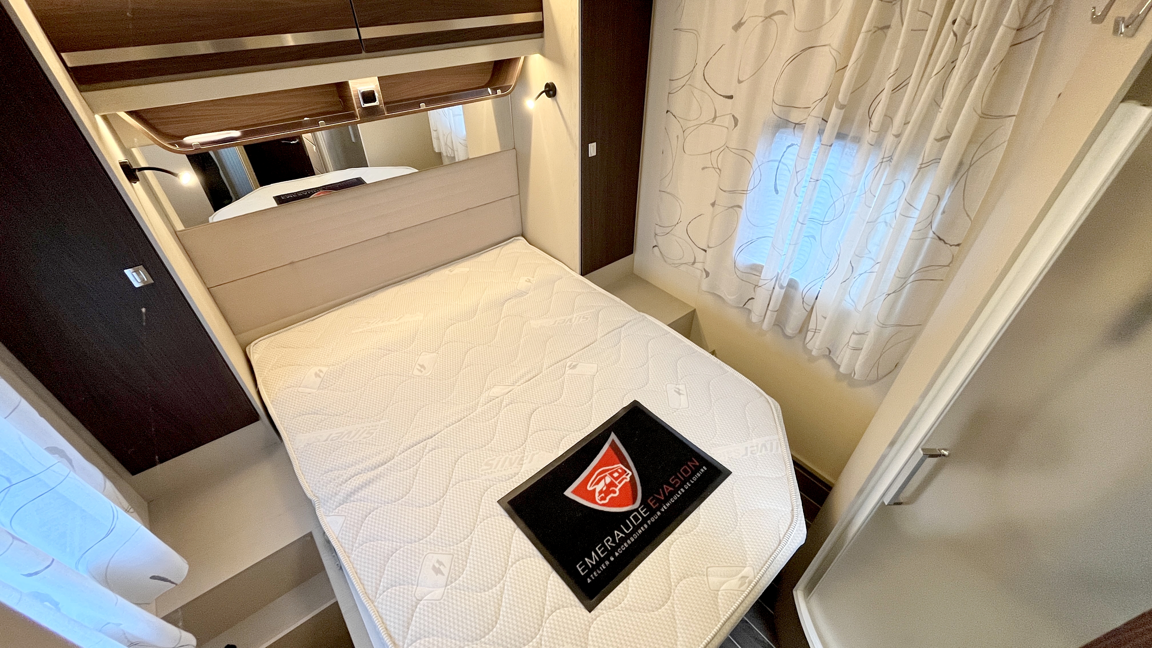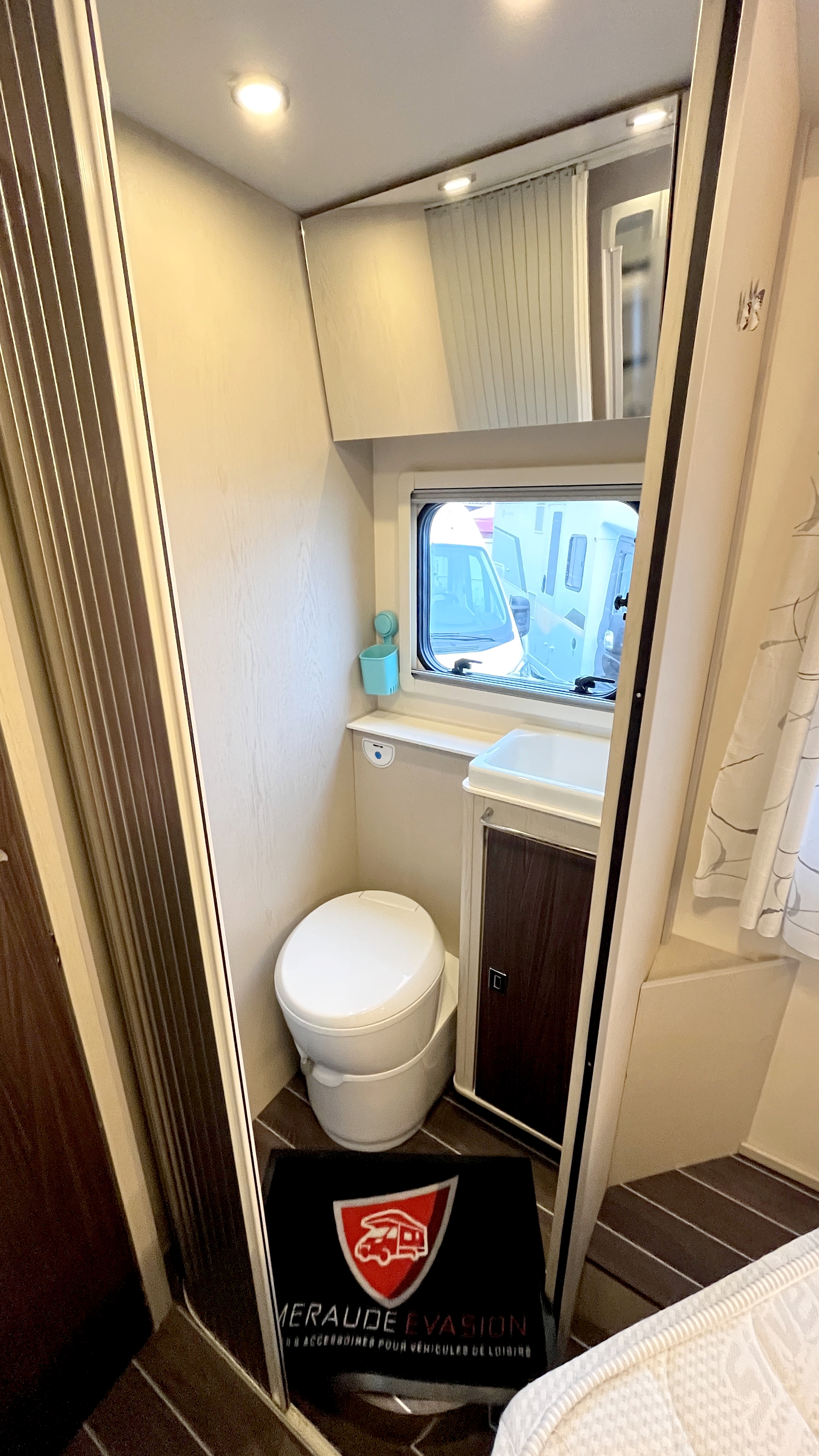 En plus d'un lit de pavillon électrique, d'un lit dînette, il offre une chambre à coucher arrière à lit central inclinable, pour bénéficier d'un volume avec dégagement pour faciliter la circulation et l'accès à la salle de bain traversante. Cette dernière est composée d'une vaste douche à paroi rigide d'un côté, et d'un lavabo/WC de l'autre. La cuisine avec l'indispensable grand réfrigérateur débouche sur un large salon équipé de prises USB et d'une TV à antenne satellite automatique, bien au chaud grâce au chauffage Truma gaz Combi 4000 watts. Profitez de sa soute garage avec double accès pour emporter et protéger vos vélos.
