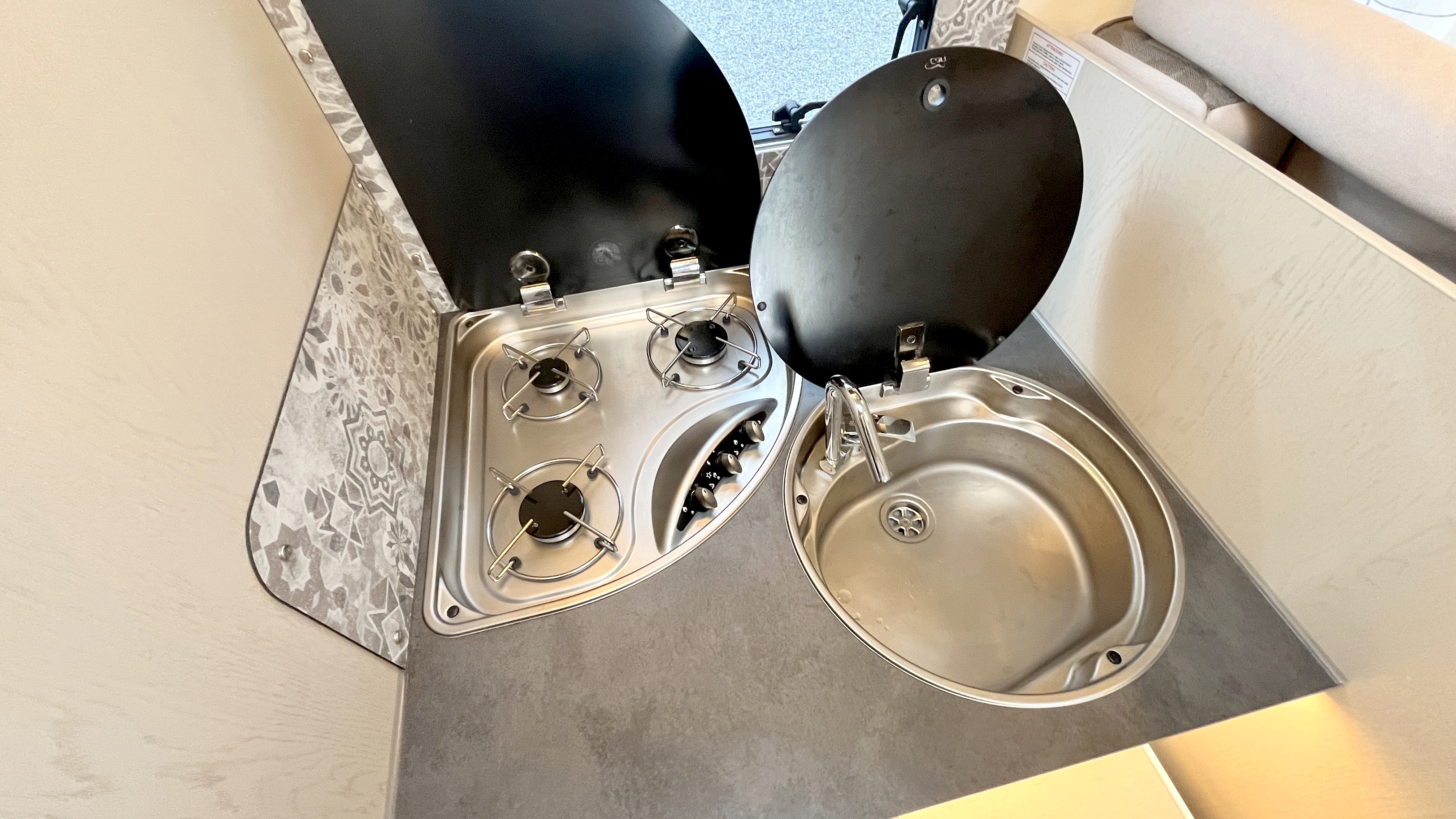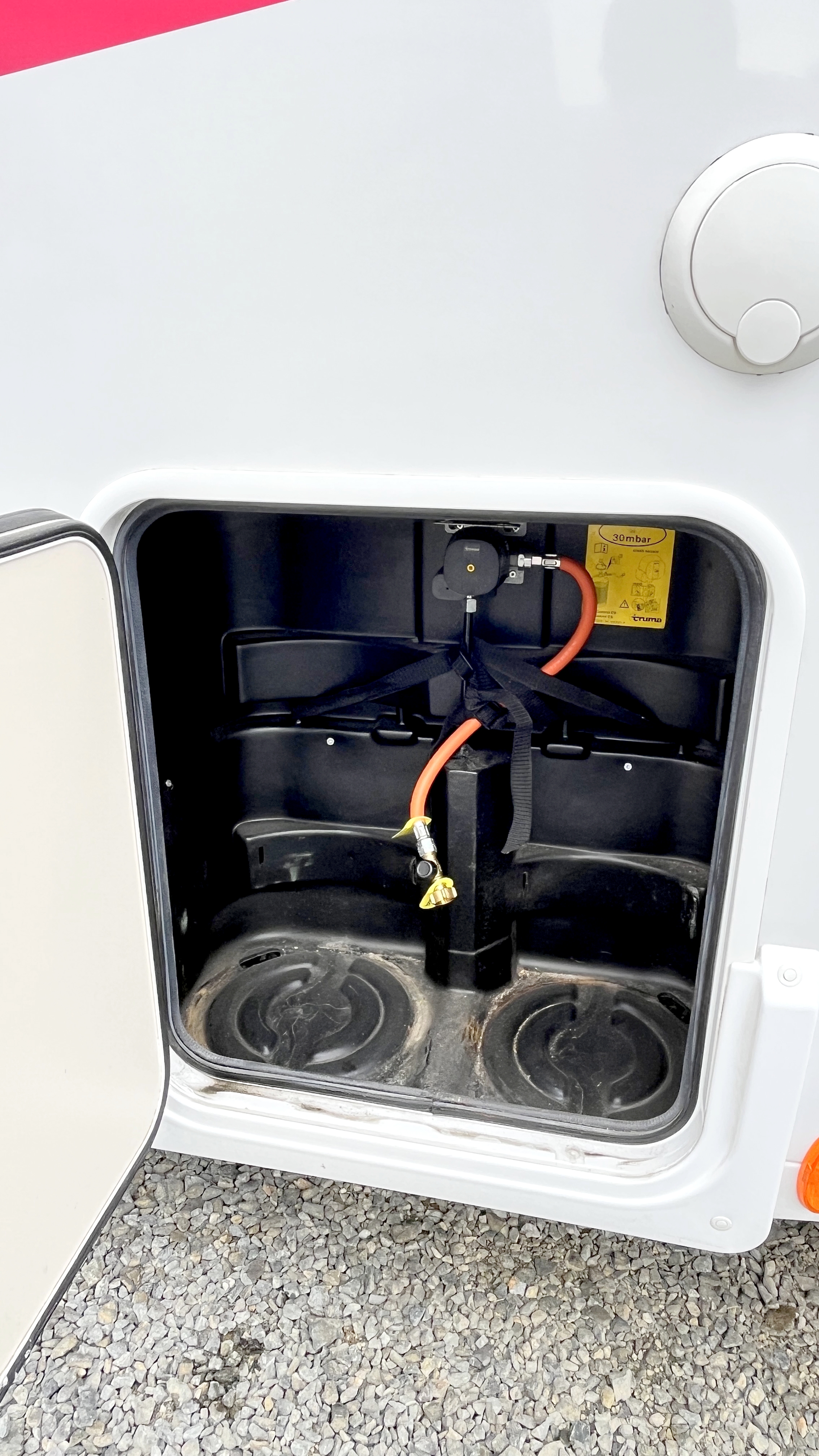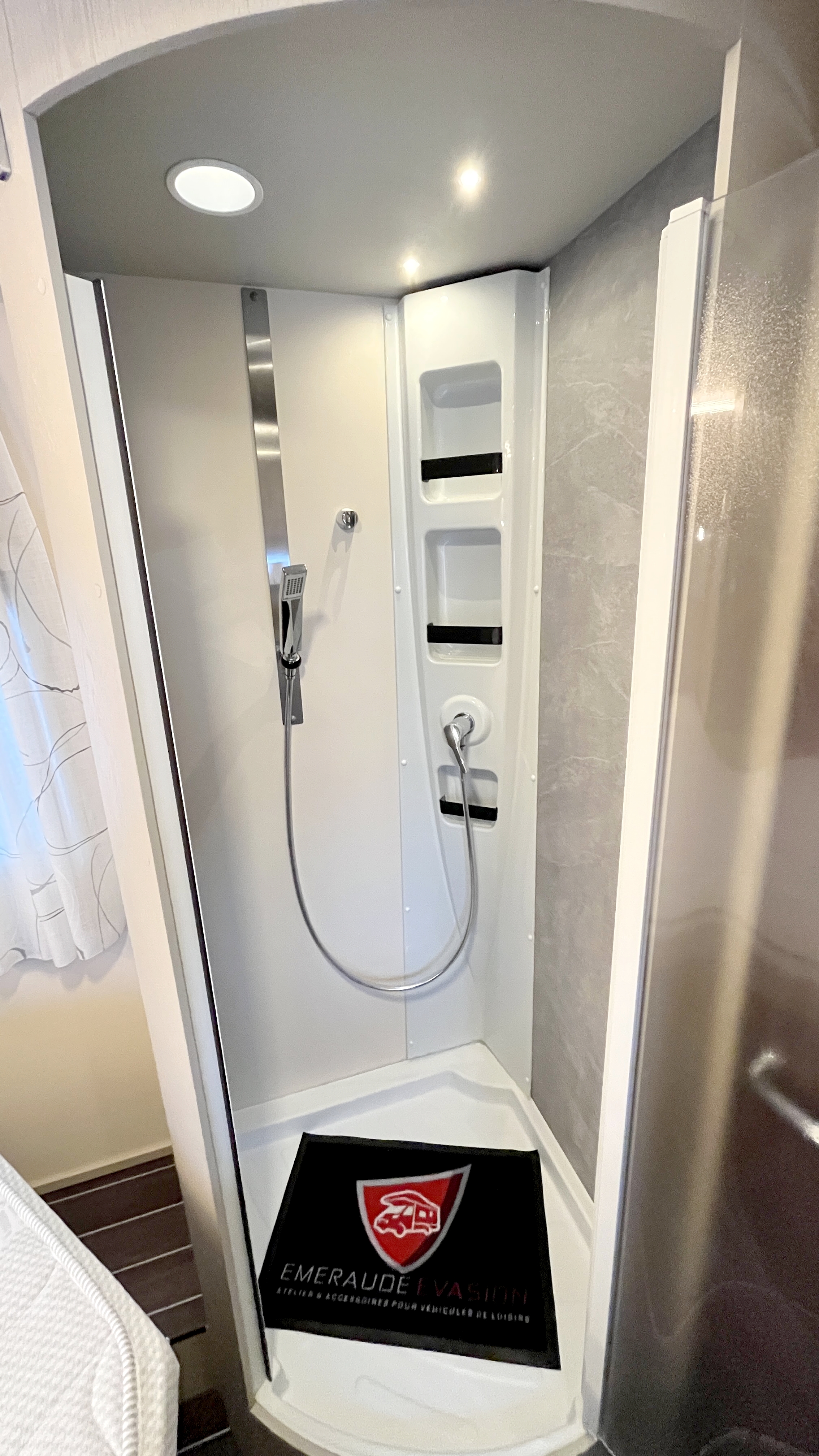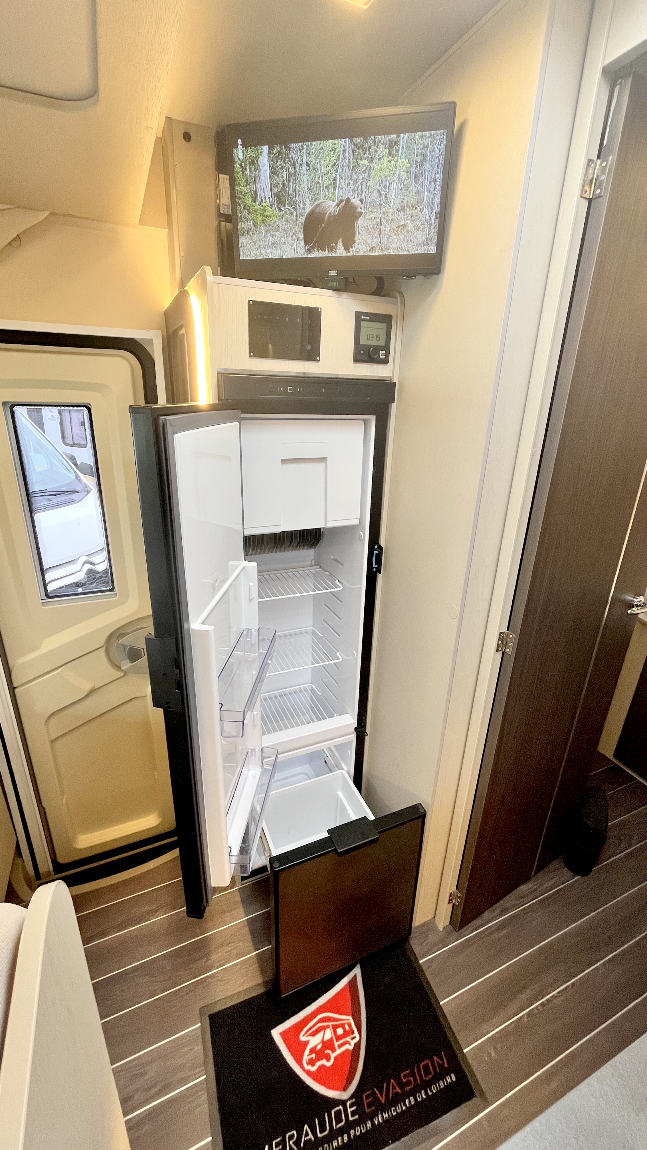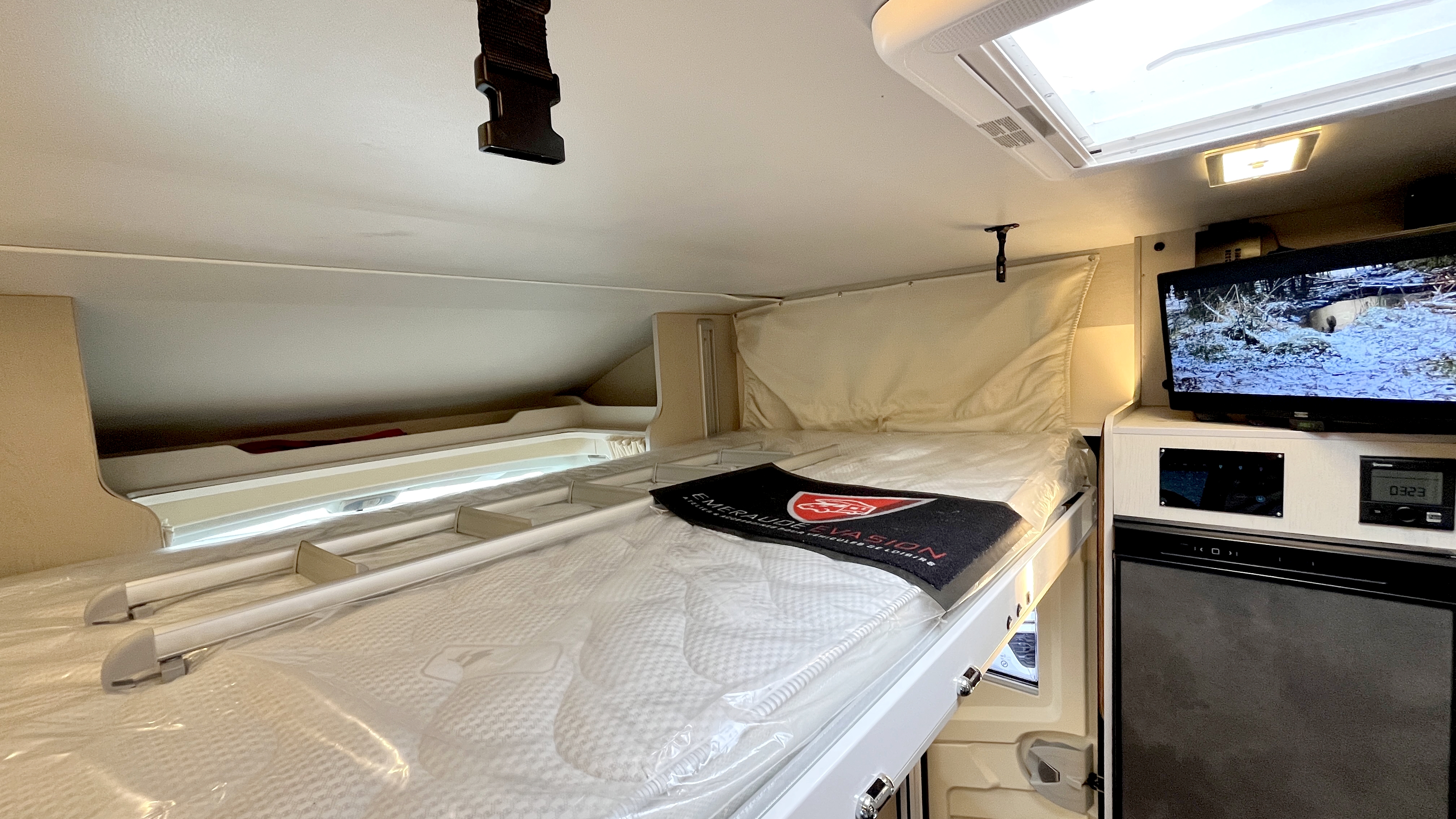 En plus d'un lit de pavillon électrique, d'un lit dînette, il offre une chambre à coucher arrière à lit central inclinable, pour bénéficier d'un volume avec dégagement pour faciliter la circulation et l'accès à la salle de bain traversante. Cette dernière est composée d'une vaste douche à paroi rigide d'un côté, et d'un lavabo/WC de l'autre. La cuisine avec l'indispensable grand réfrigérateur débouche sur un large salon équipé de prises USB et d'une TV à antenne satellite automatique, bien au chaud grâce au chauffage Truma gaz Combi 4000 watts. Profitez de sa soute garage avec double accès pour emporter et protéger vos vélos.