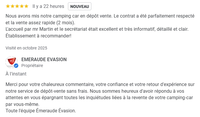 Confier votre camping-car à notre service de dépôt-vente sans frais, c’est choisir la solution la plus simple, la plus sûre et la plus efficace pour vendre votre camping-car : vous gagnez du temps et vous bénéficiez d’un accompagnement expert jusqu’à la finalisation du règlement.
