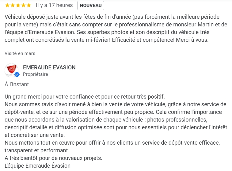 Nous prenons en charge chaque étape : expertise et estimation précise selon le marché, mise en valeur du véhicule avec des photos professionnelles et une annonce optimisée, diffusion sur les sites d'annonces spécialisées, organisation des visites.
